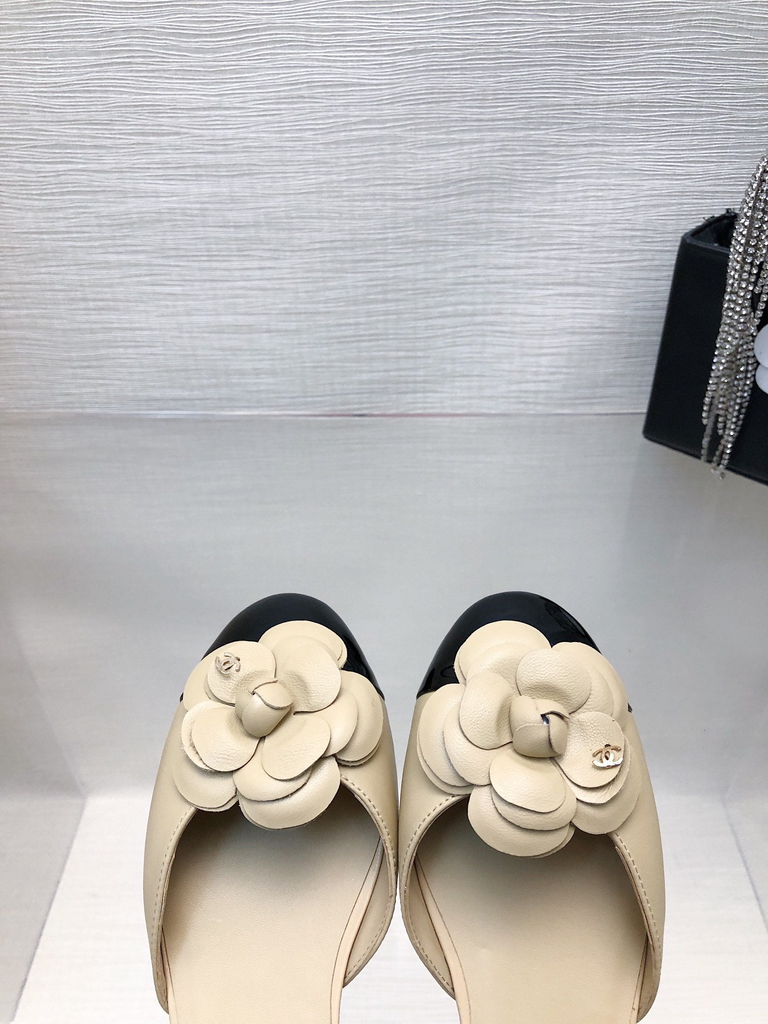 BEIGE MIX BLACK LAMBSKIN CAMELLIA HOLLOW SANDAL