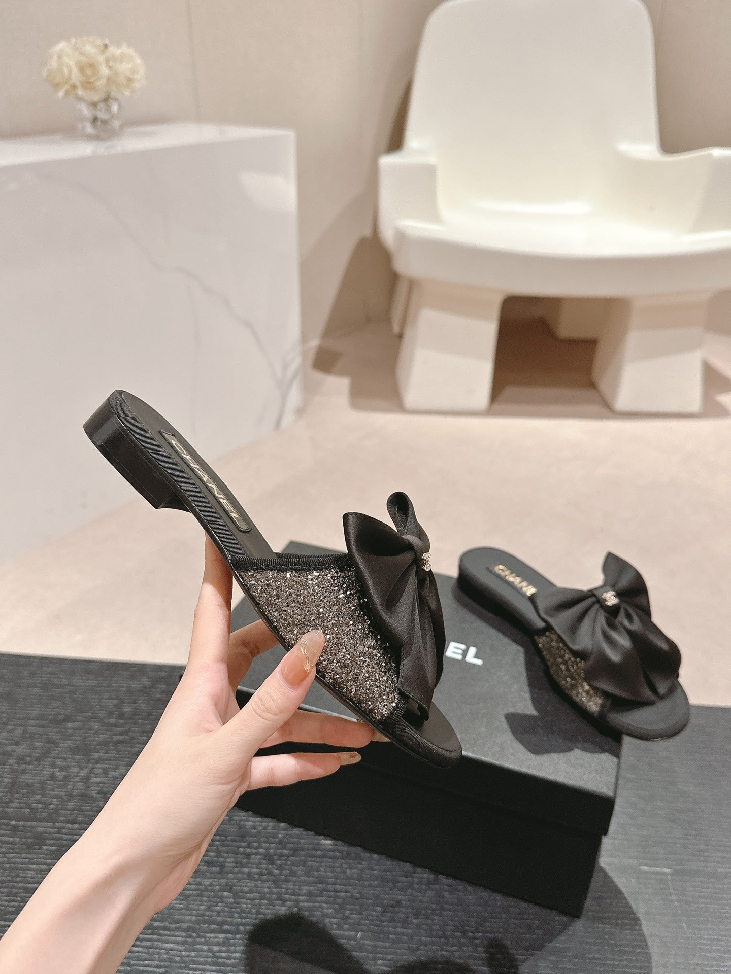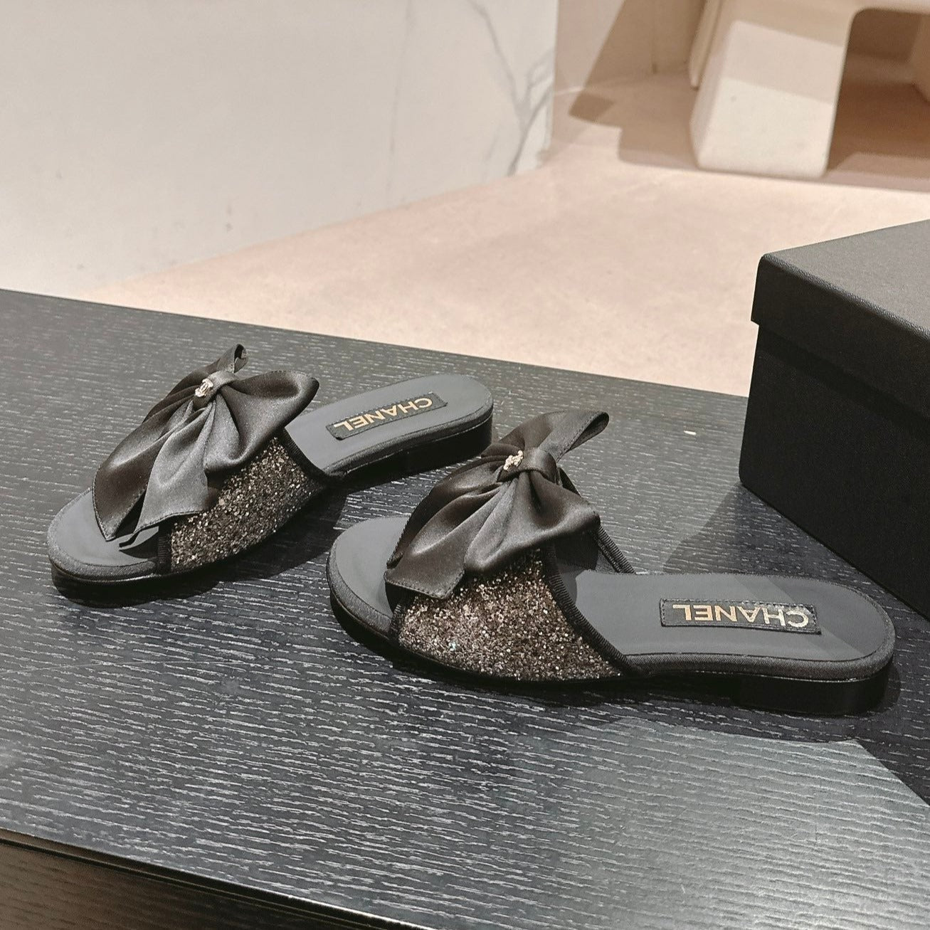 BOW LADY SLIPPERS BLACK LAMBSKIN WITH RHINESTONES