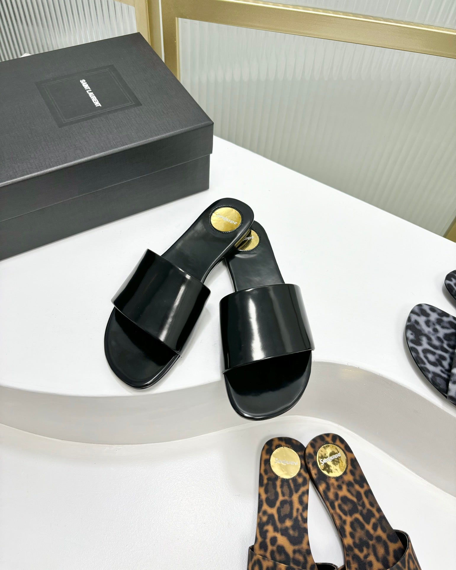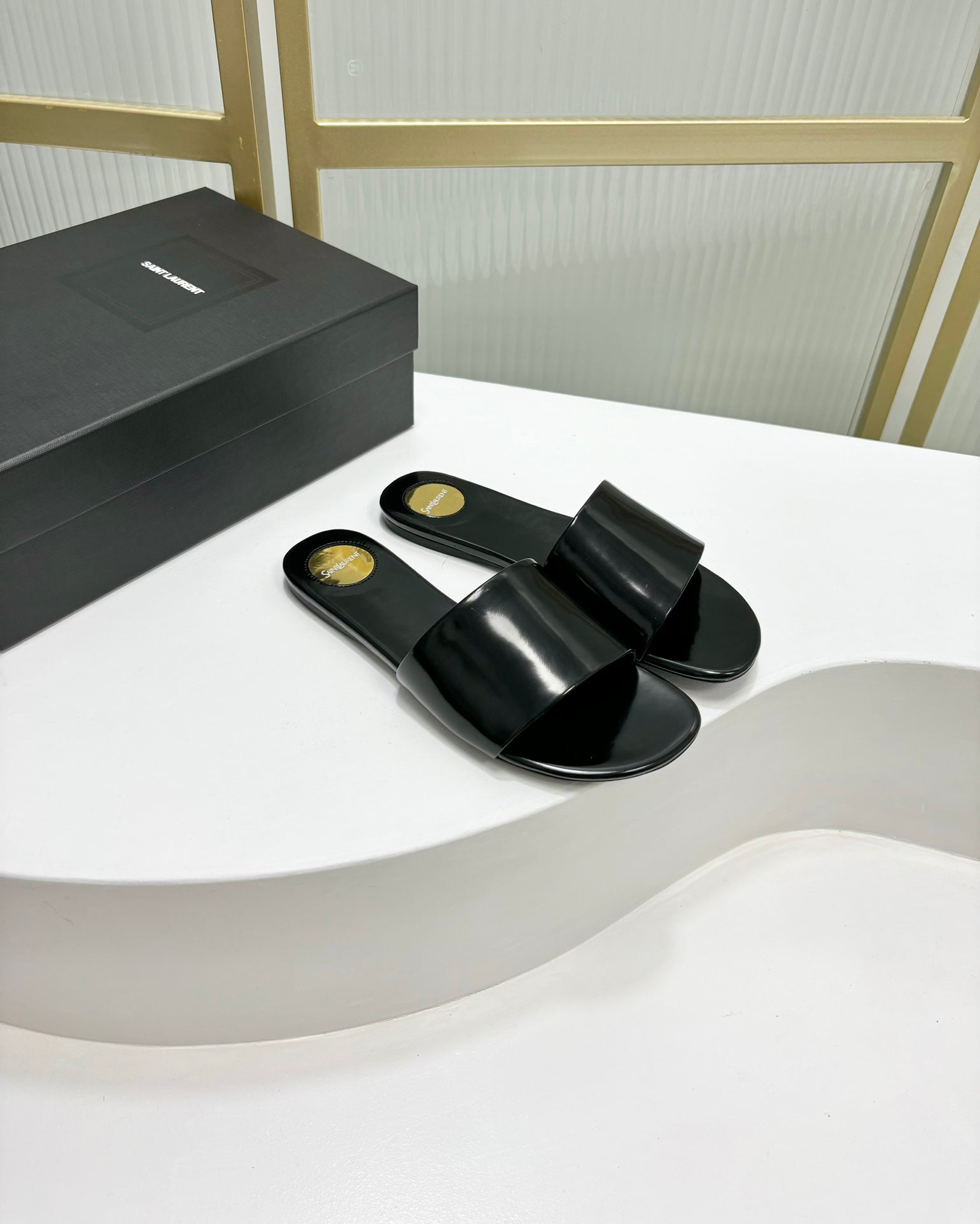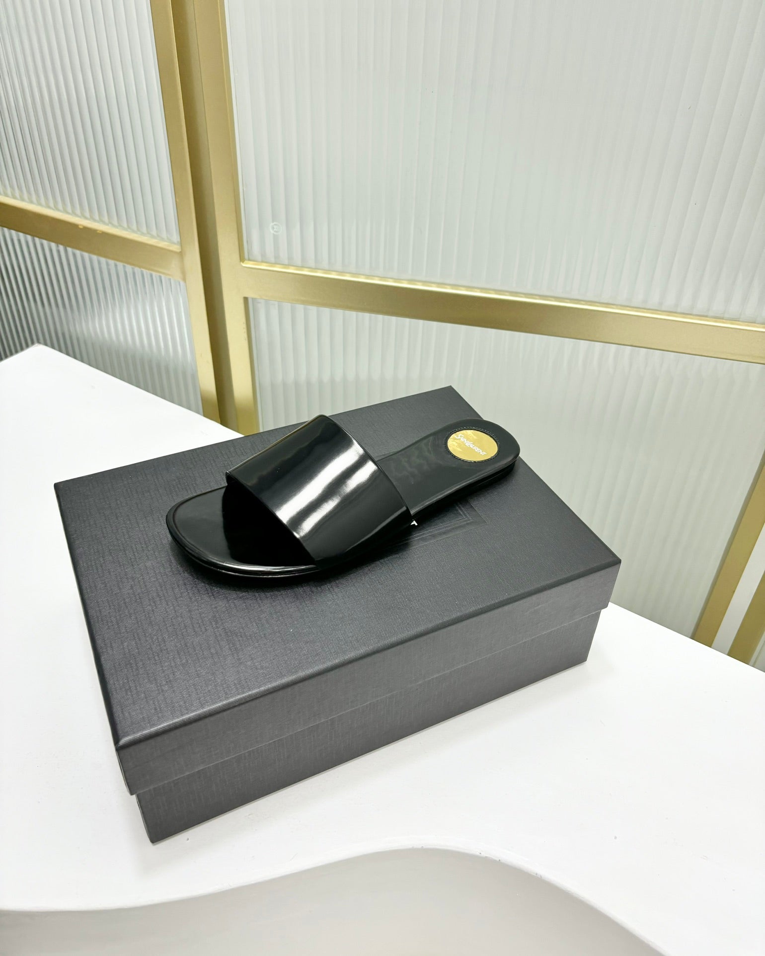 CARLYLE SLIDES IN BLACK GLAZED LEATHER
