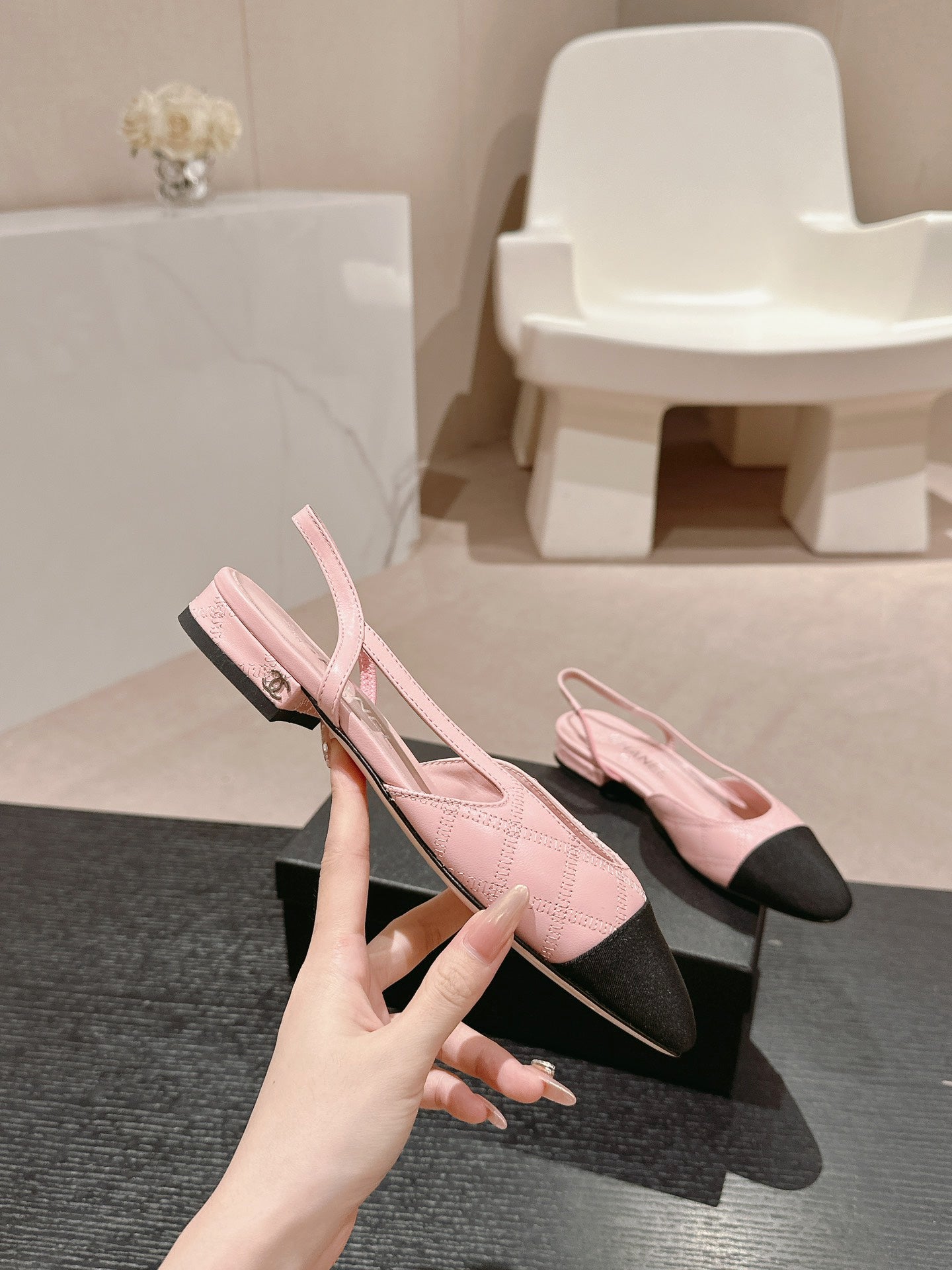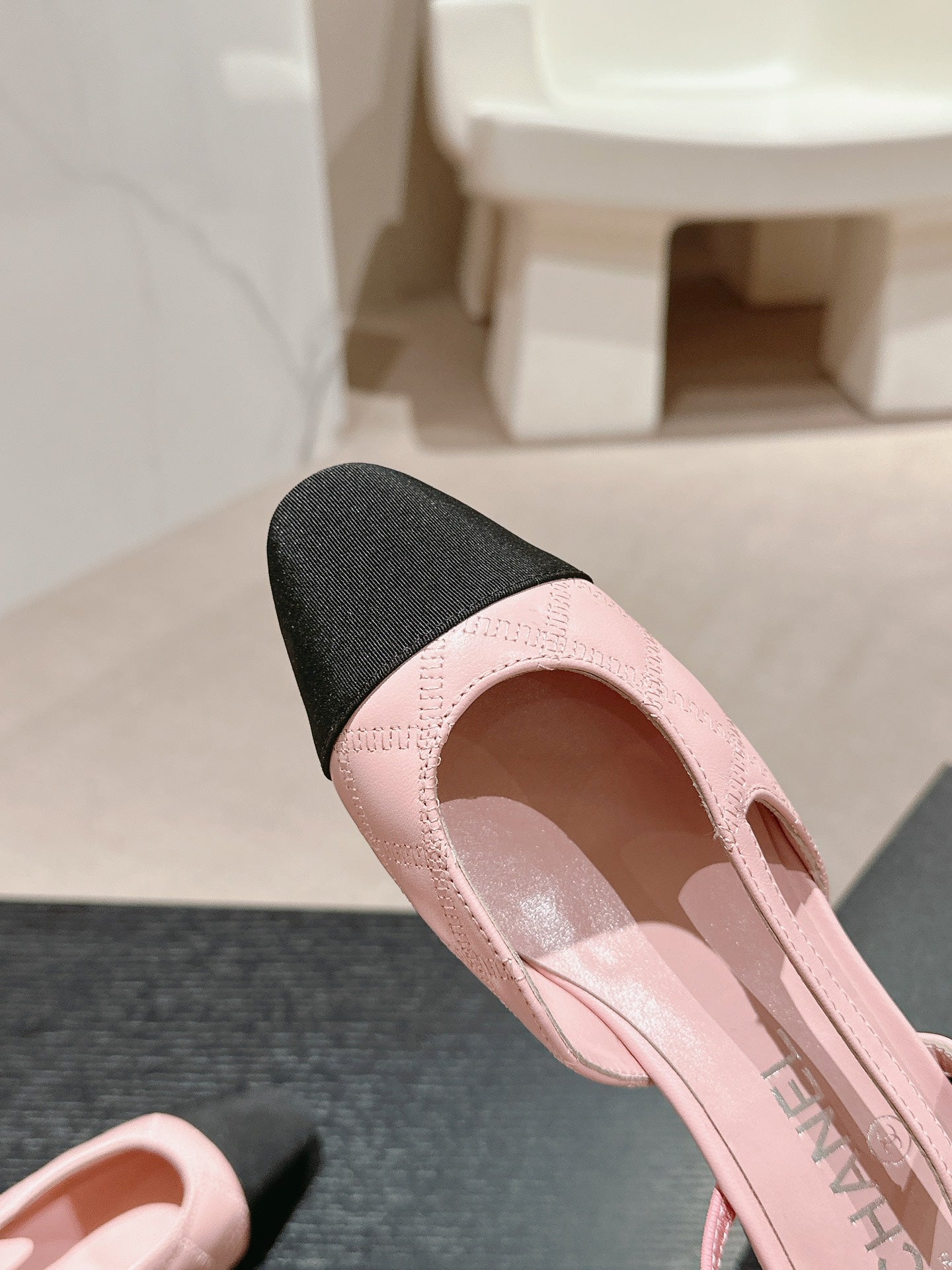SLINGBACKS IN LIGHT PINK LAMBSKIN AND BLACK SATIN