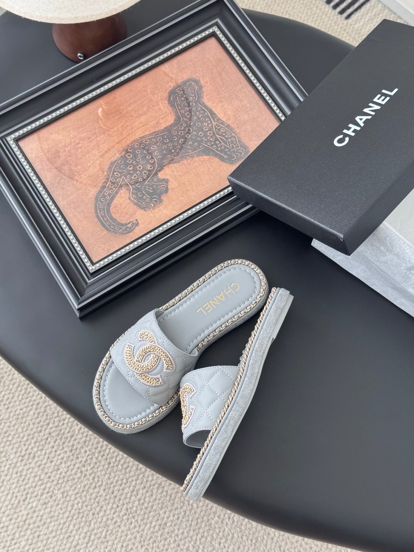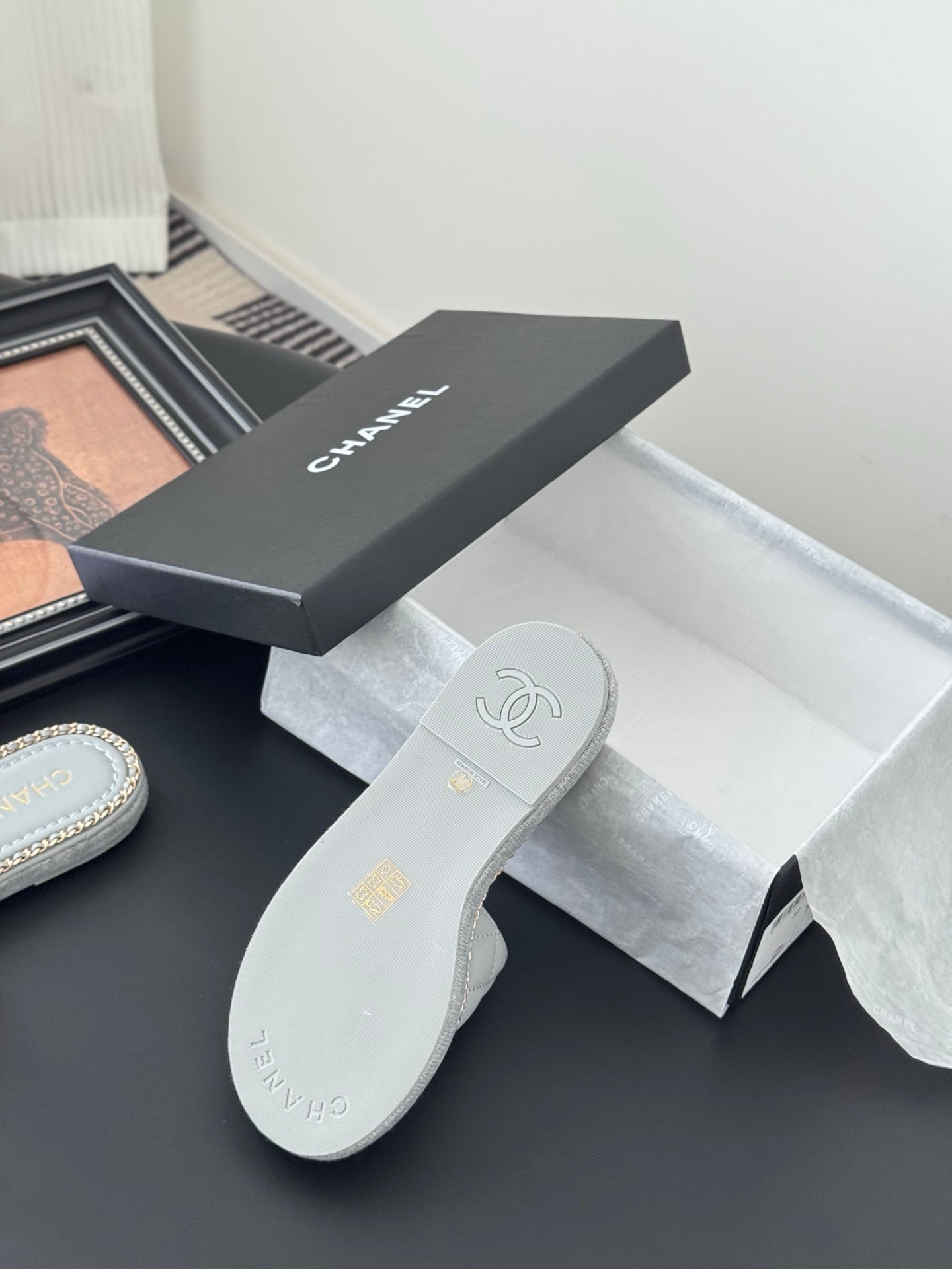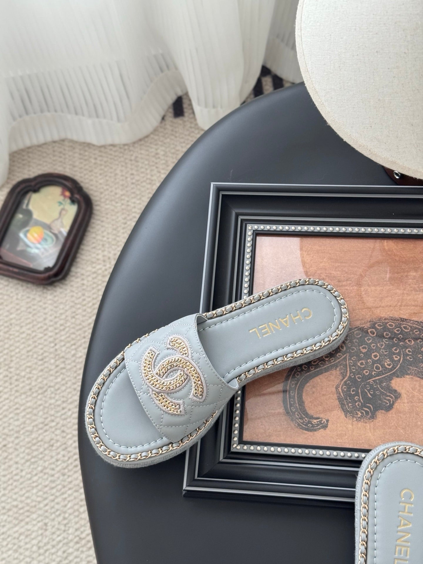 SLIPPER IN BEAU BLUE CALFSKIN MIX CHAIN BASE