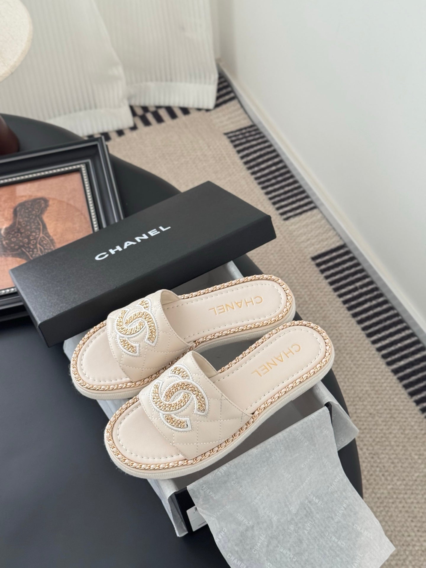SLIPPER IN LIGHT BEIGE CALFSKIN MIX CHAIN BASE