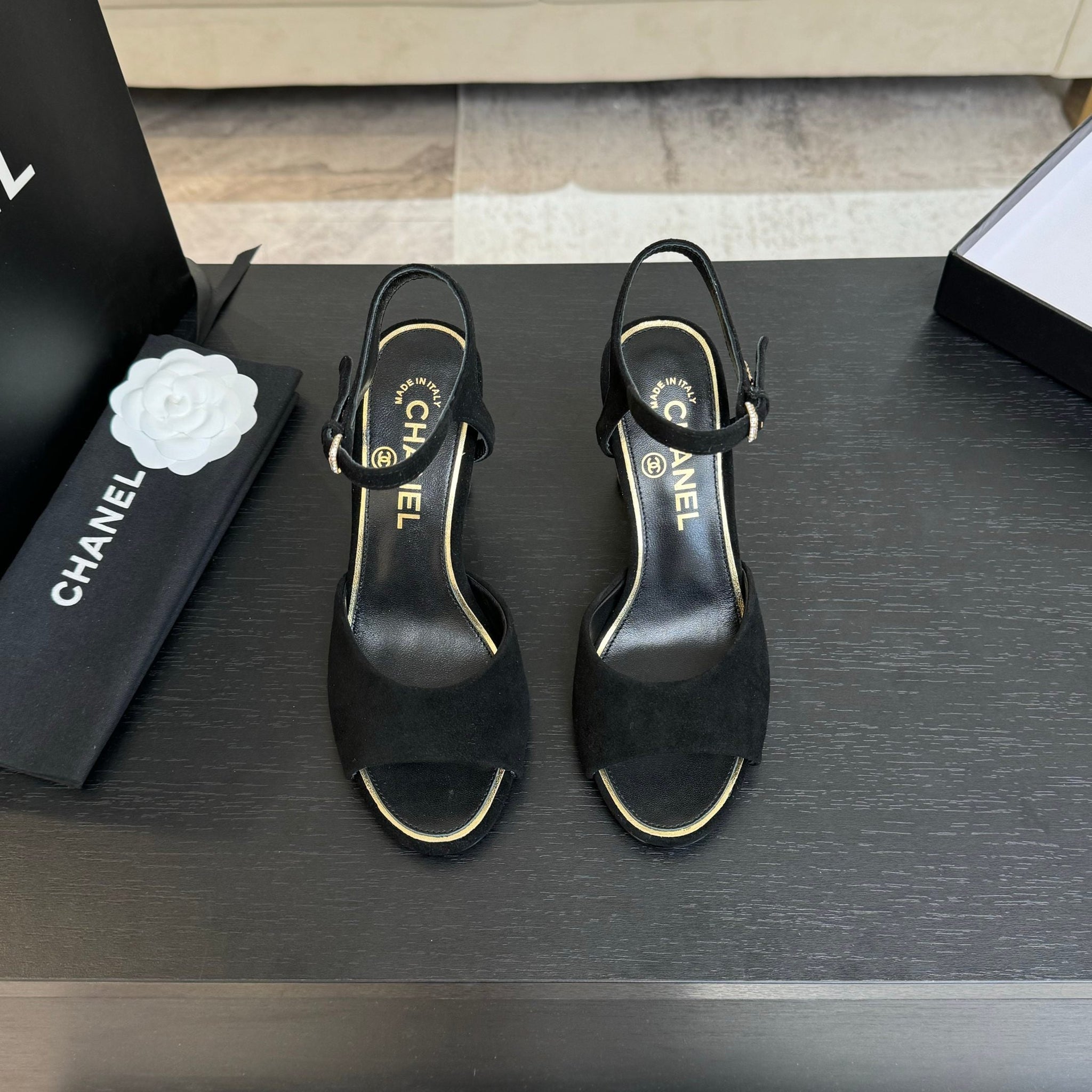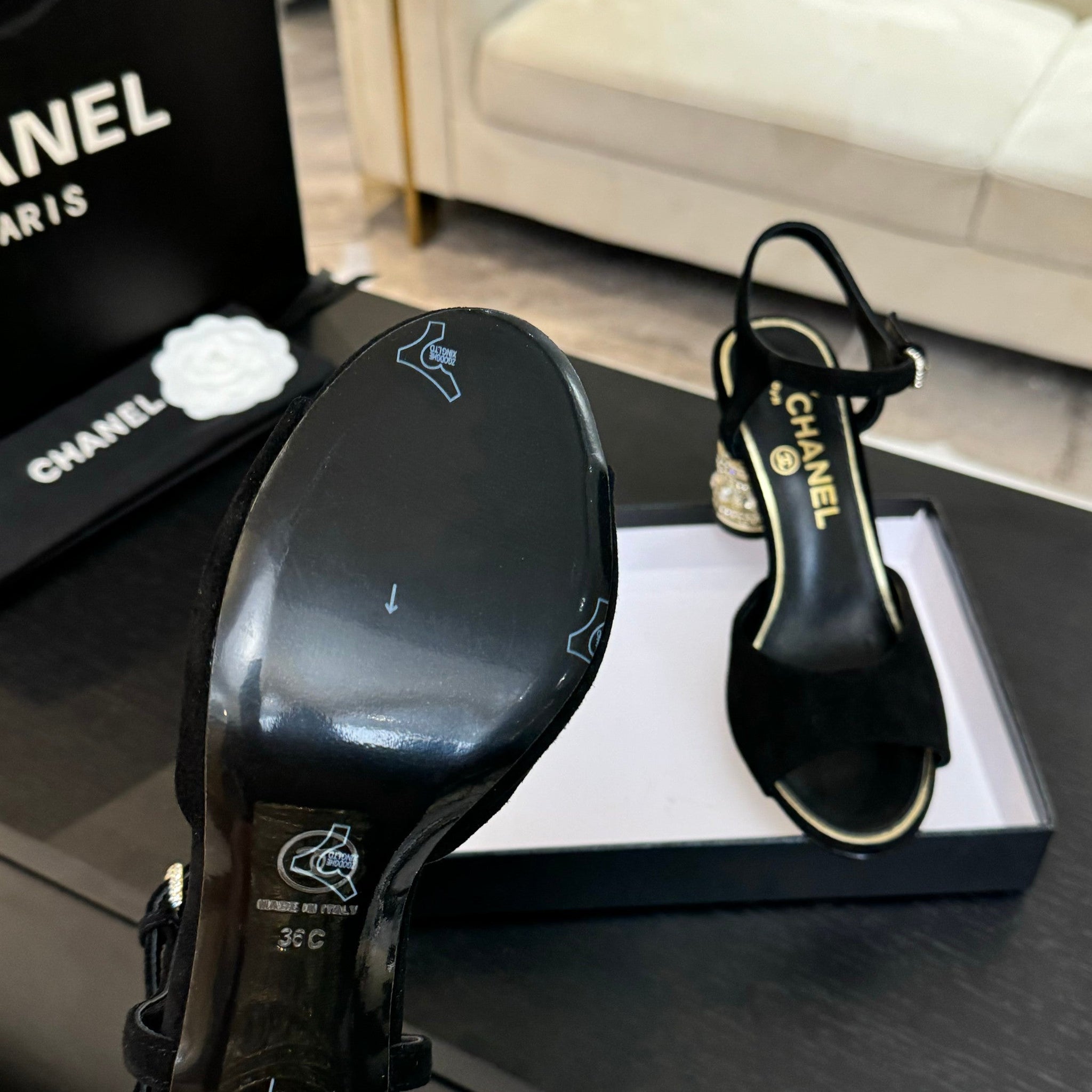 T-STRAP PEARL HEEL 85 MM SANDALS IN BLACK SUEDE
