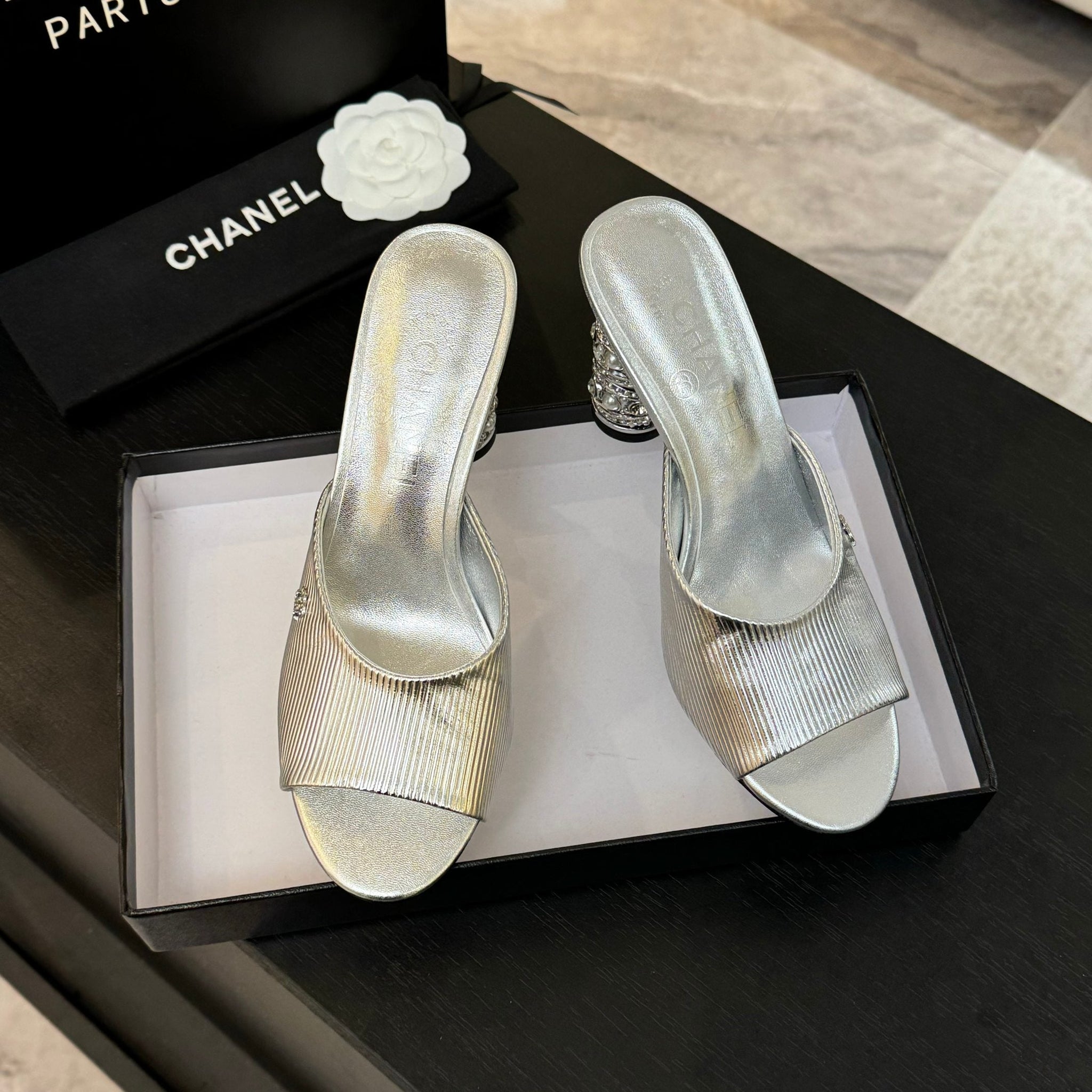 T-STRAP PEARL HEEL 85 MM SANDALS IN SILVER LAMBSKIN MULE
