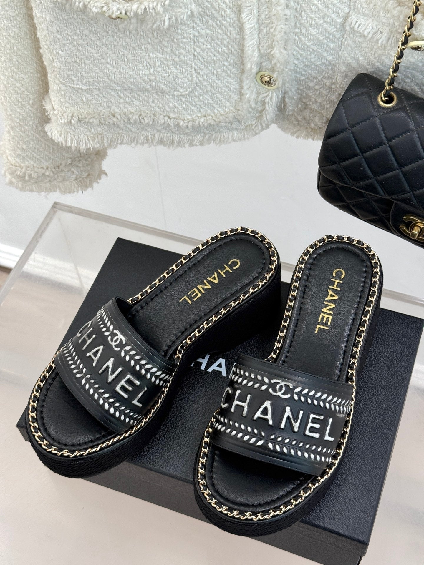 THICK SOLE WEDGE SLIPPERS IN BLACK MIX WHITE CALFSKIN