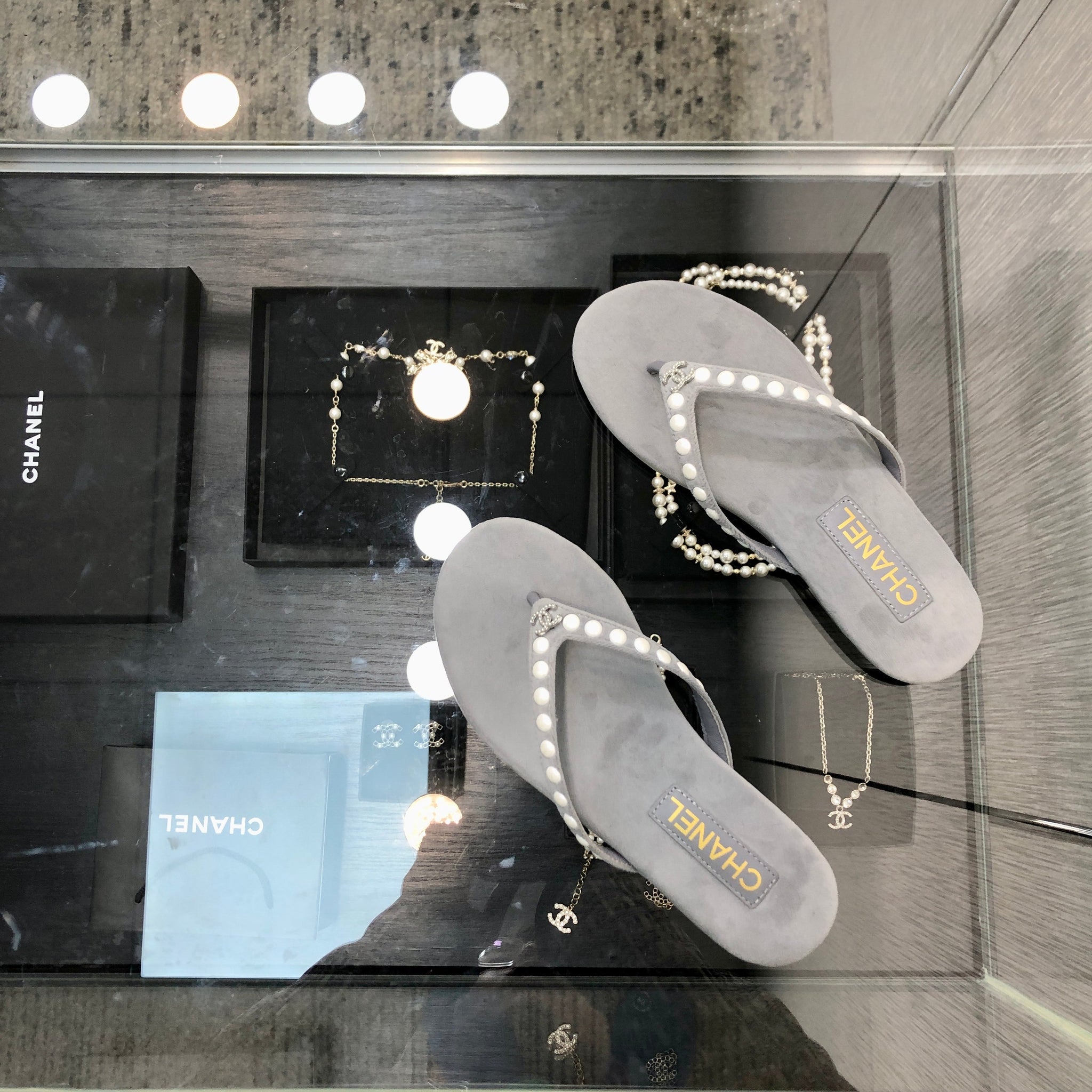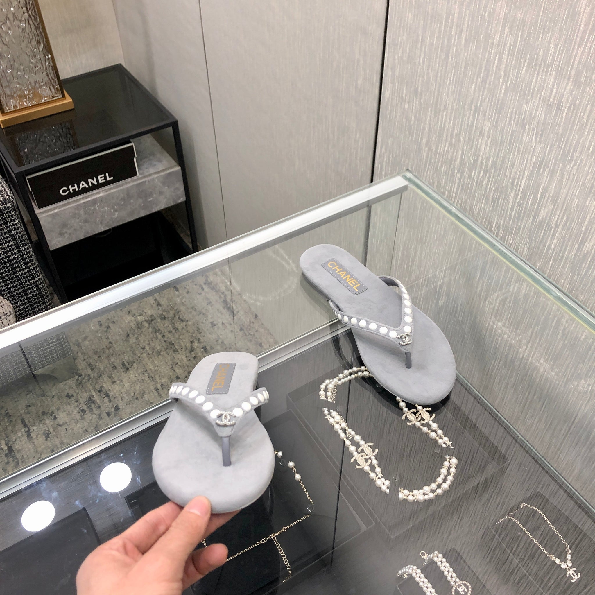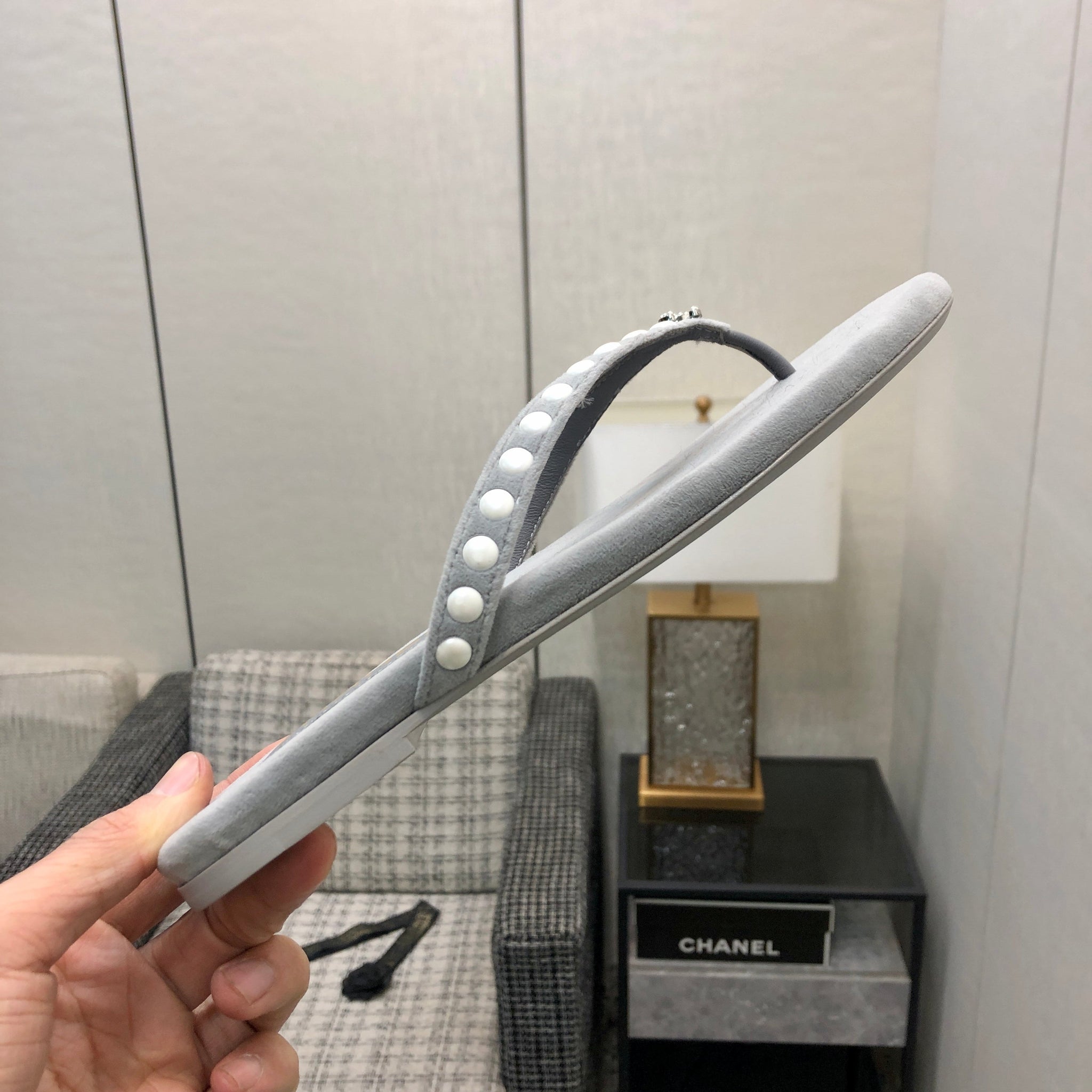 THONG SLIDE IN PALE GRAY SUEDE WITH WHITE DOT