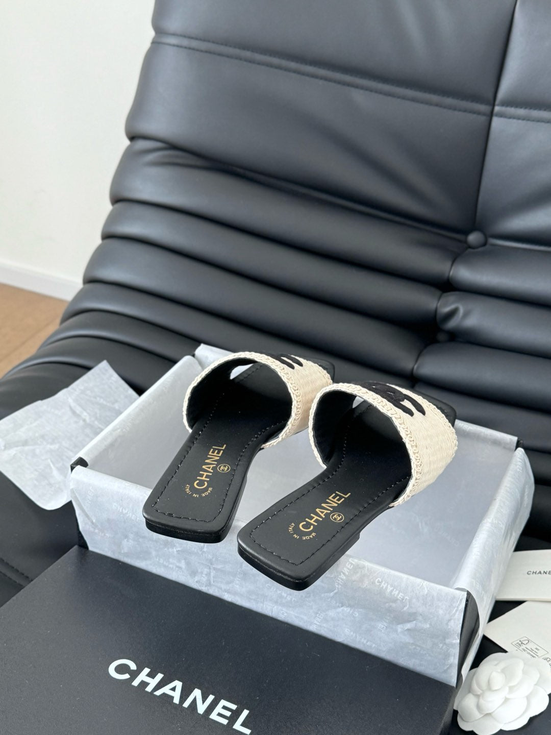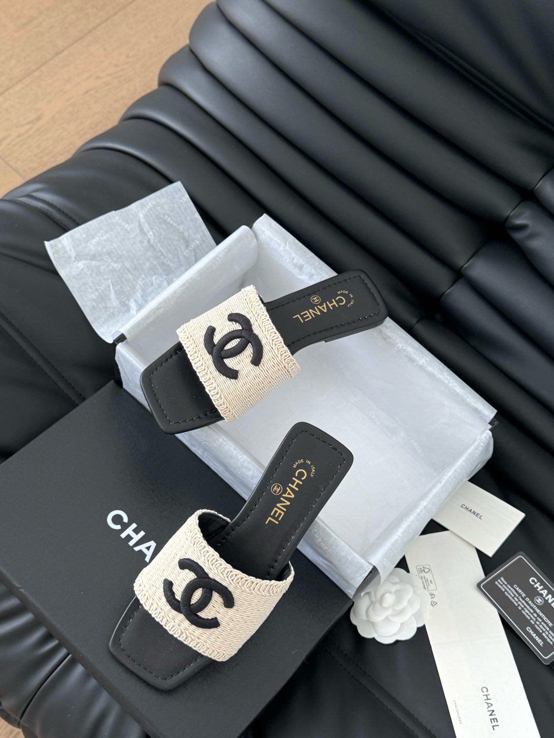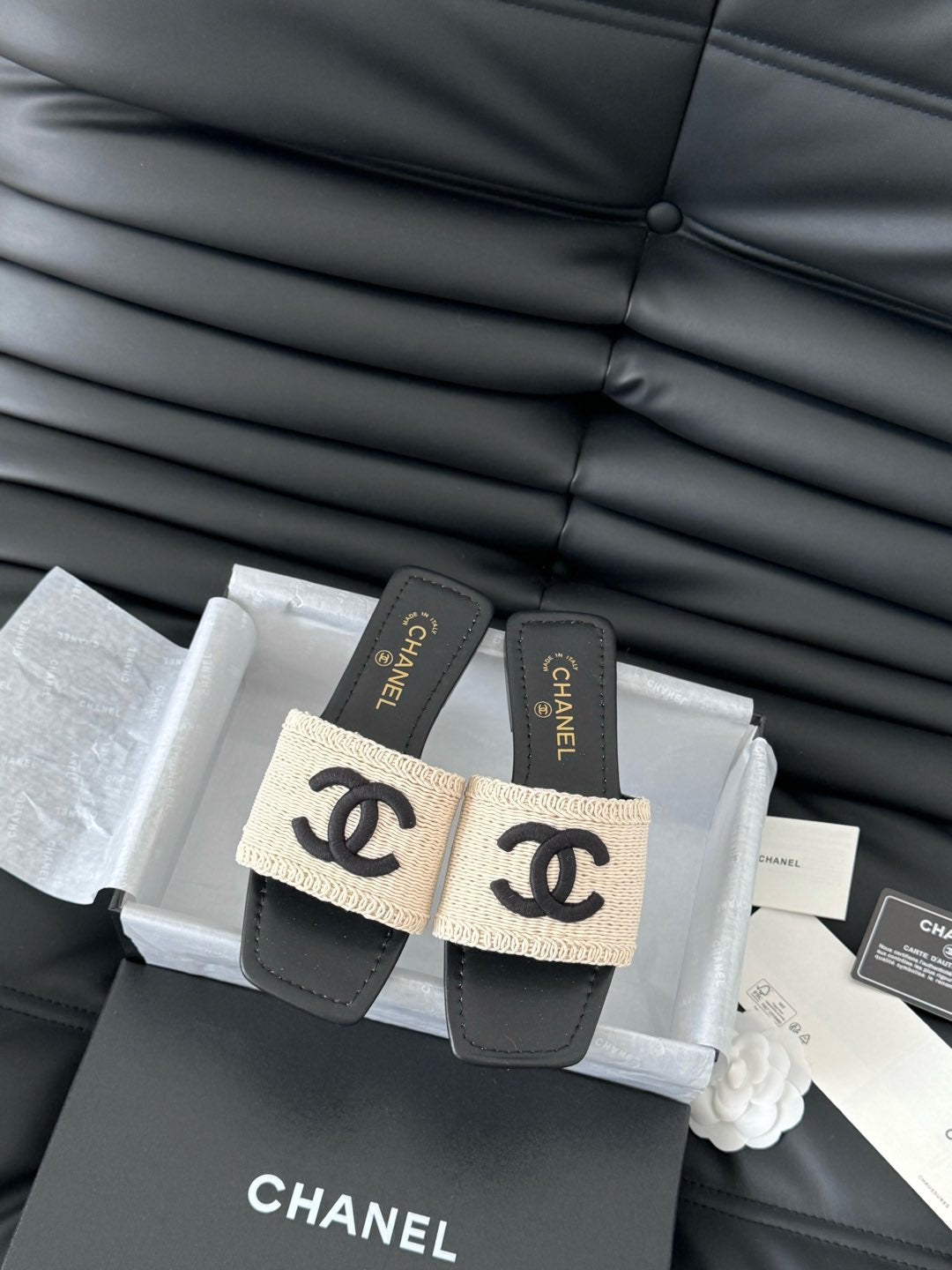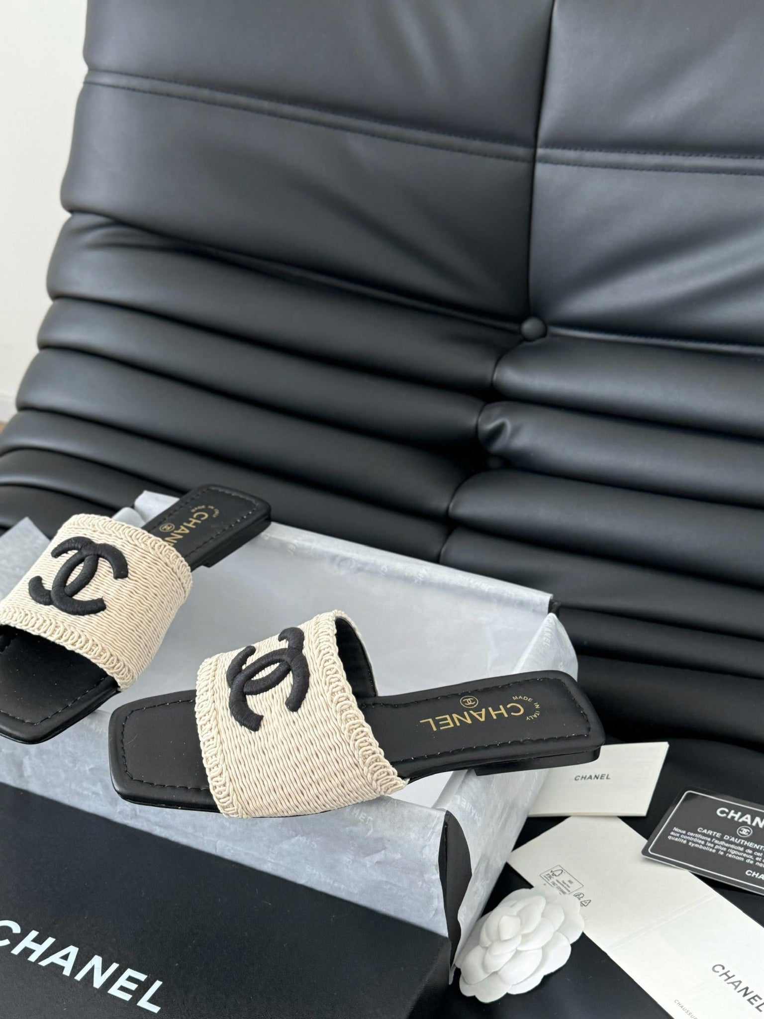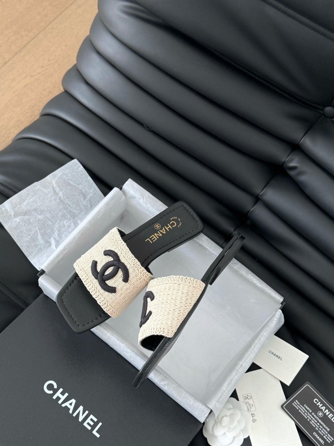 WOVEN SLIDE IN RAFFIA AND BLACK LAMBSKIN