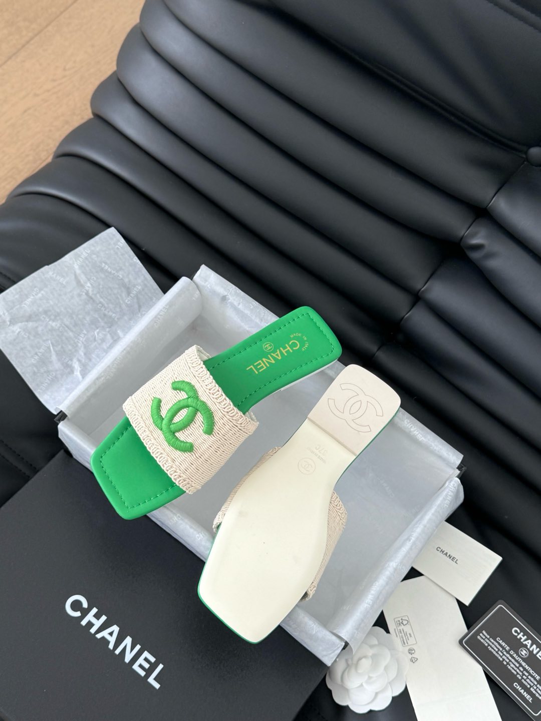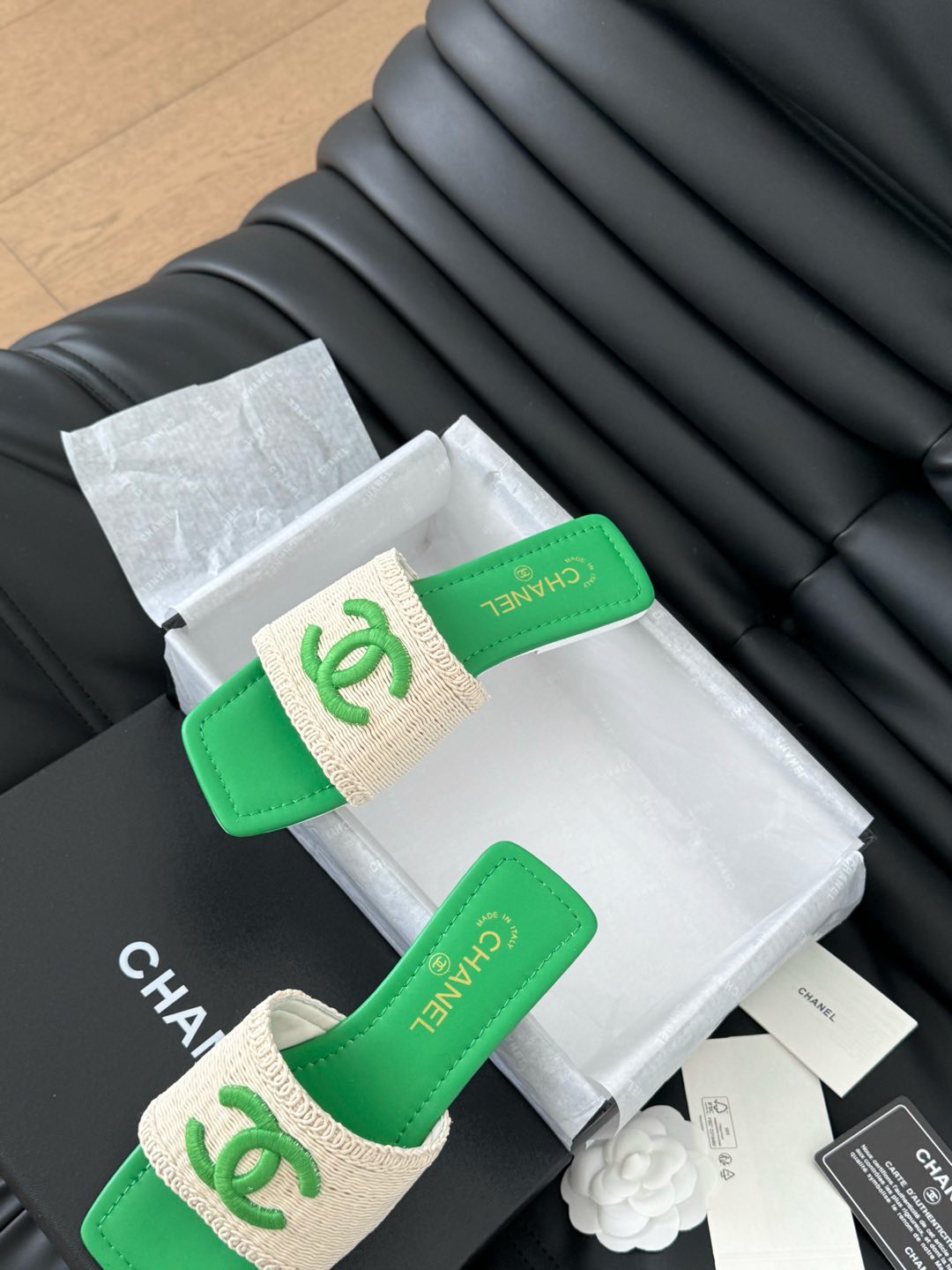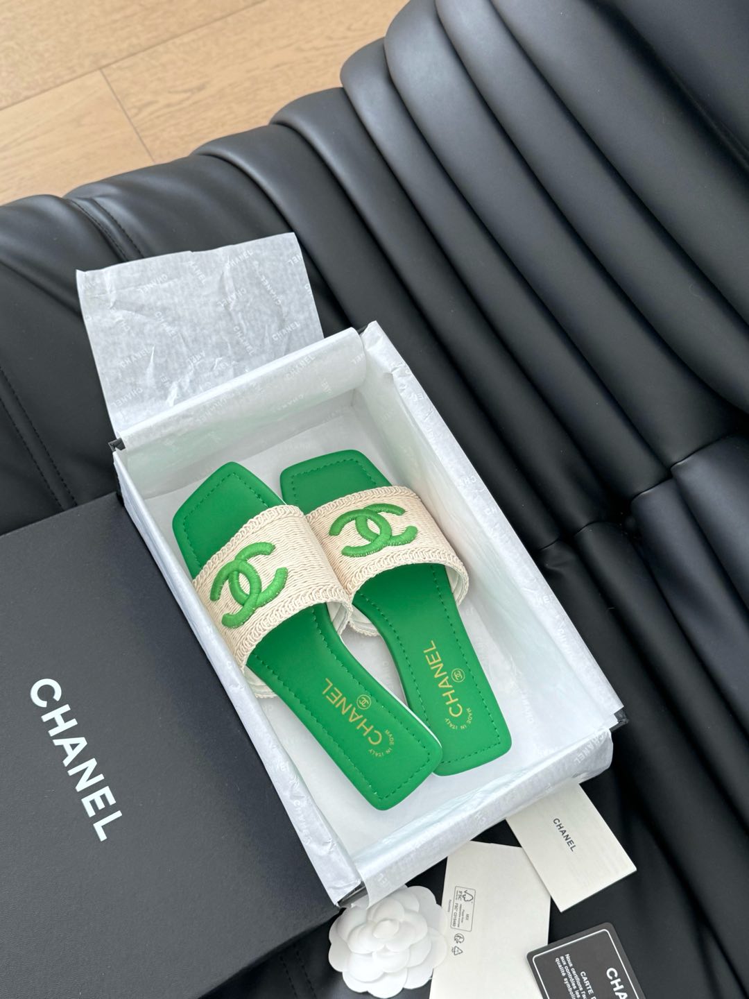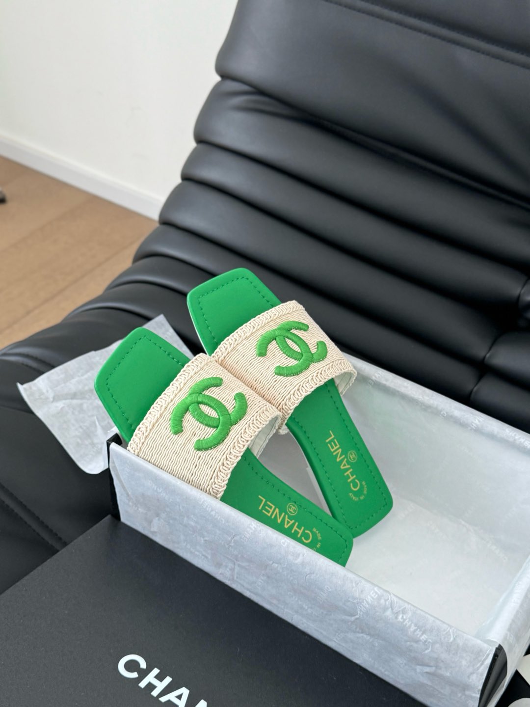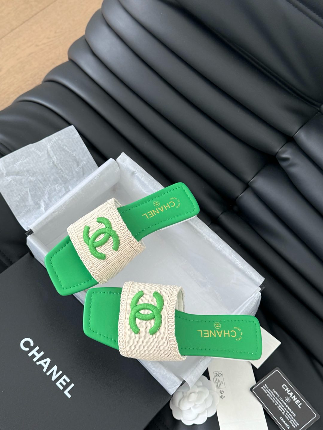 WOVEN SLIDE IN RAFFIA AND EMERALD GREEN LAMBSKIN