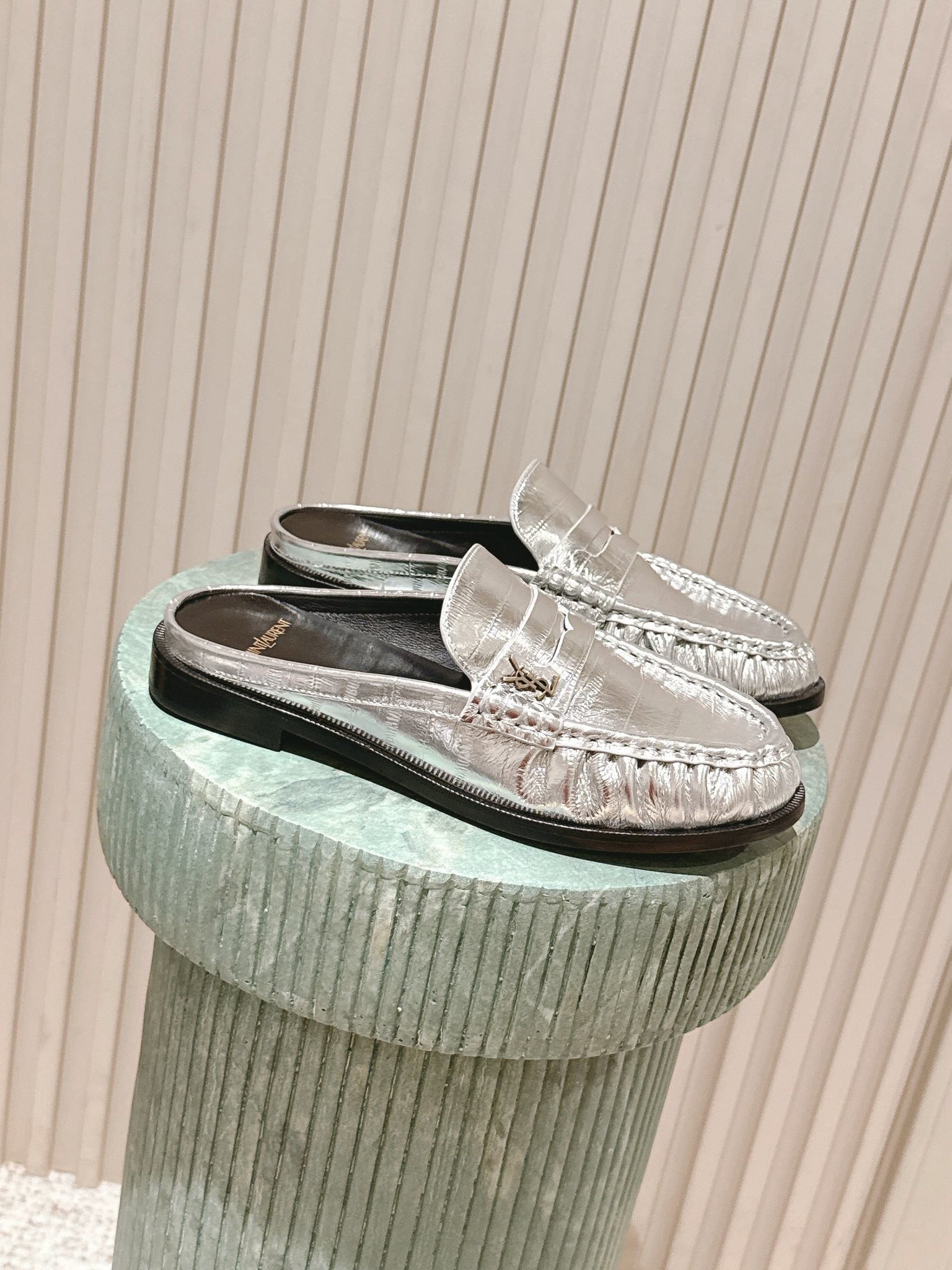 YSL 25S LOAFER MULE IN SILVER CALFSKIN
