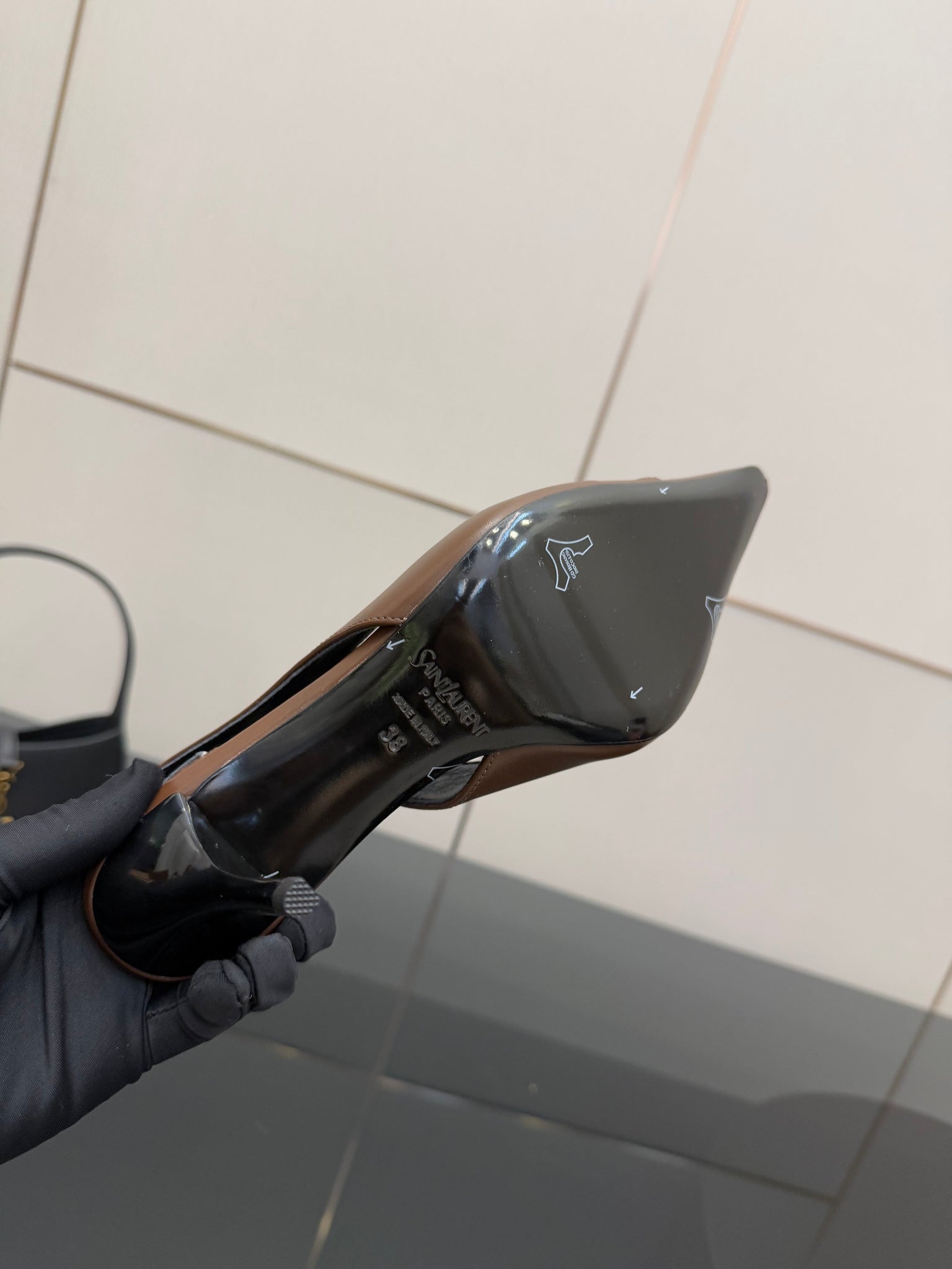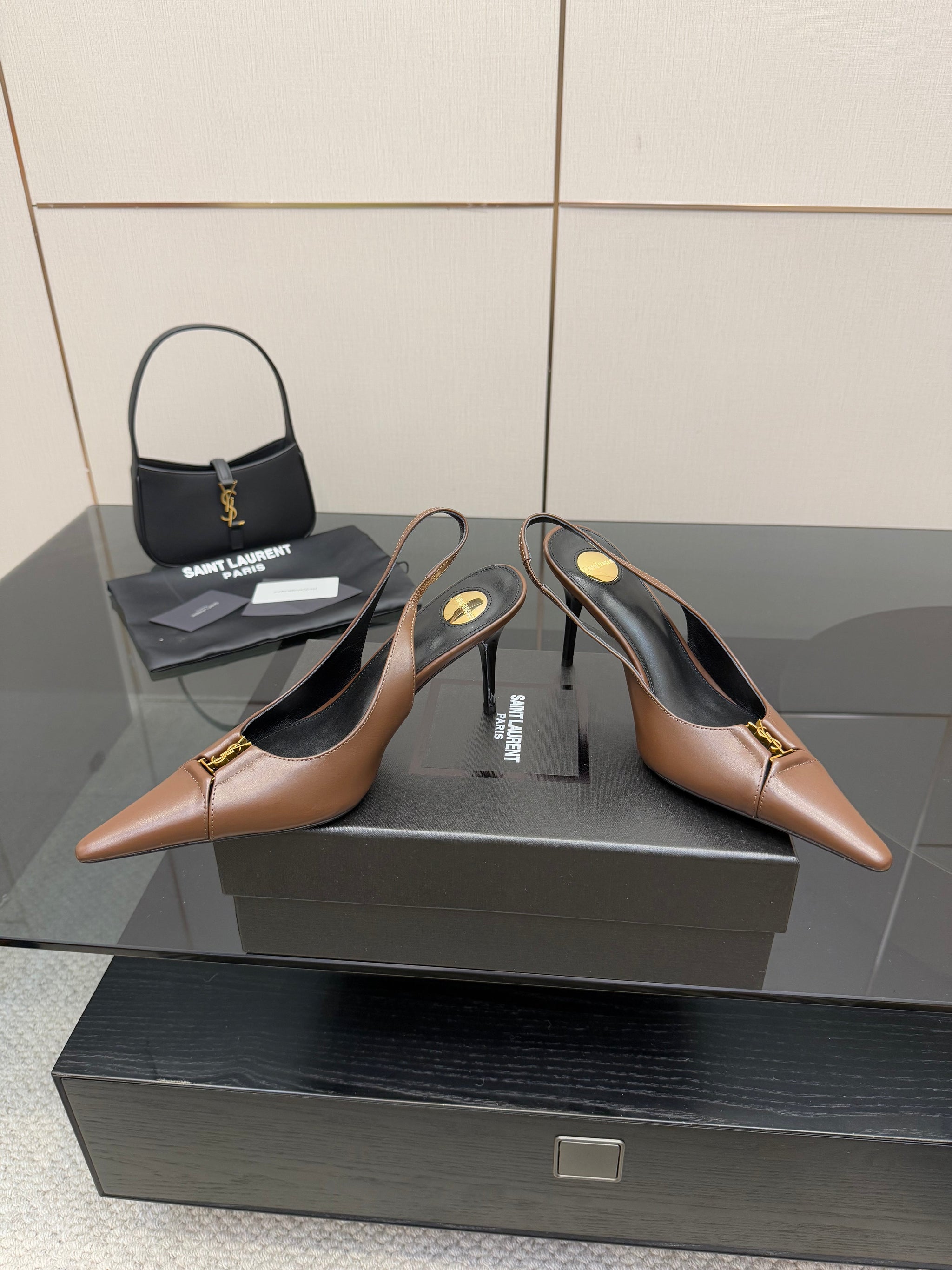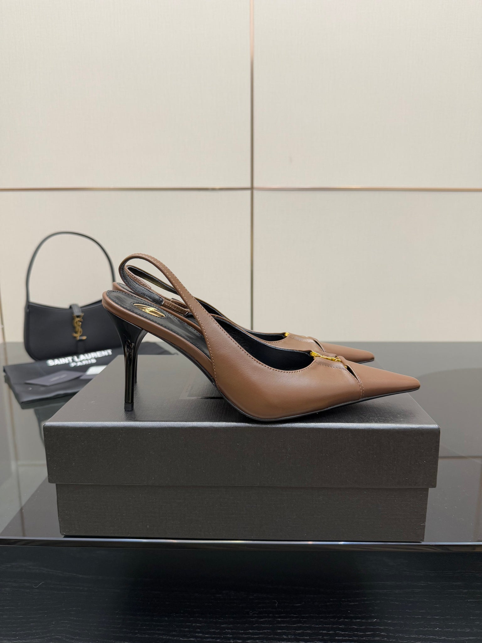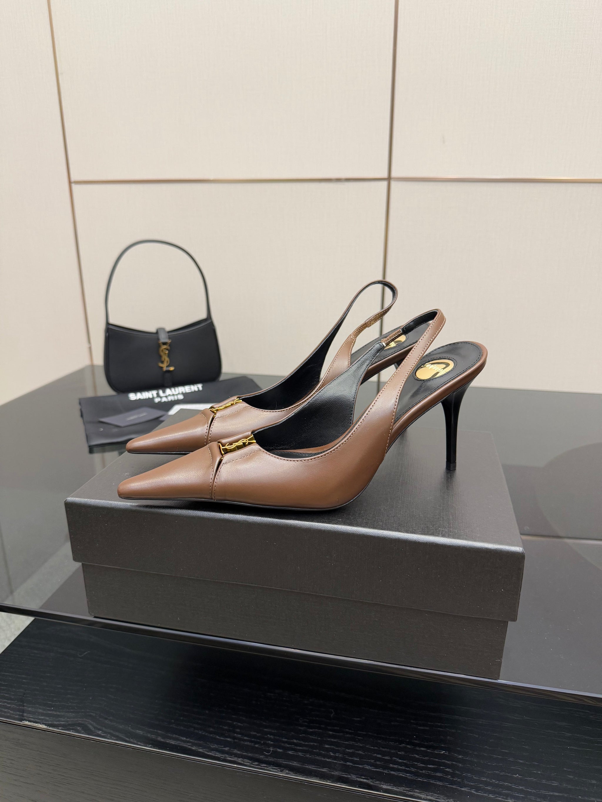 YSL 25S SLINGBACK HIGH HEELS 90 MM IN CHESTNUT BROWN LAMBSKIN WITH GOLD HARDWARE STYLE 1