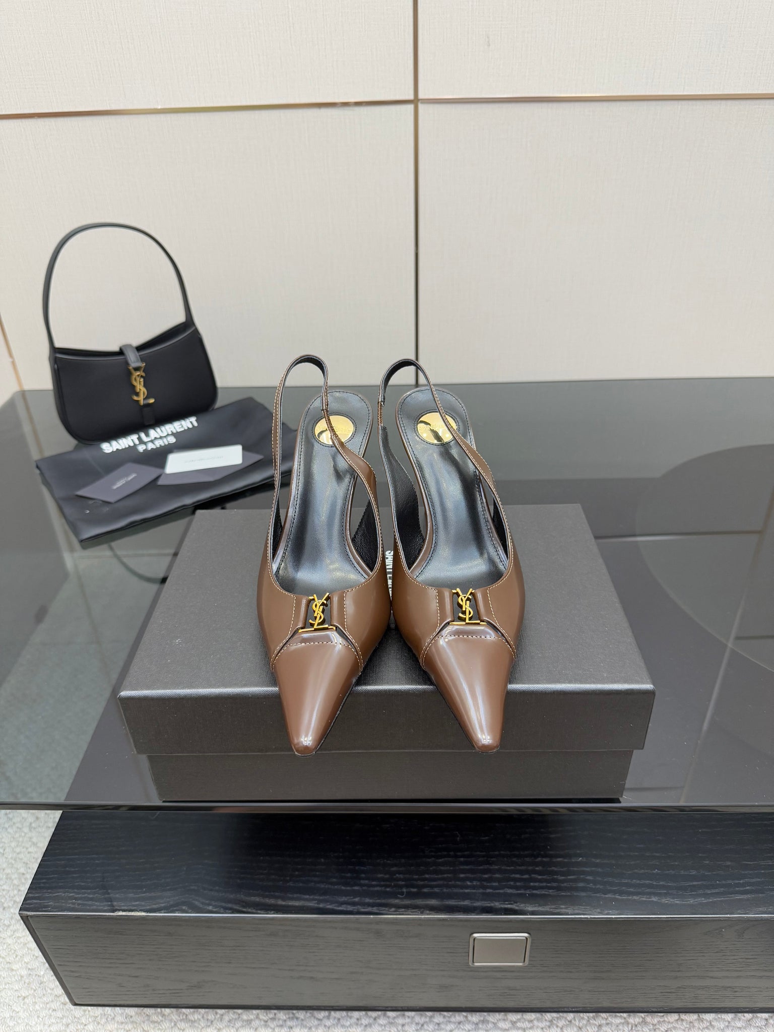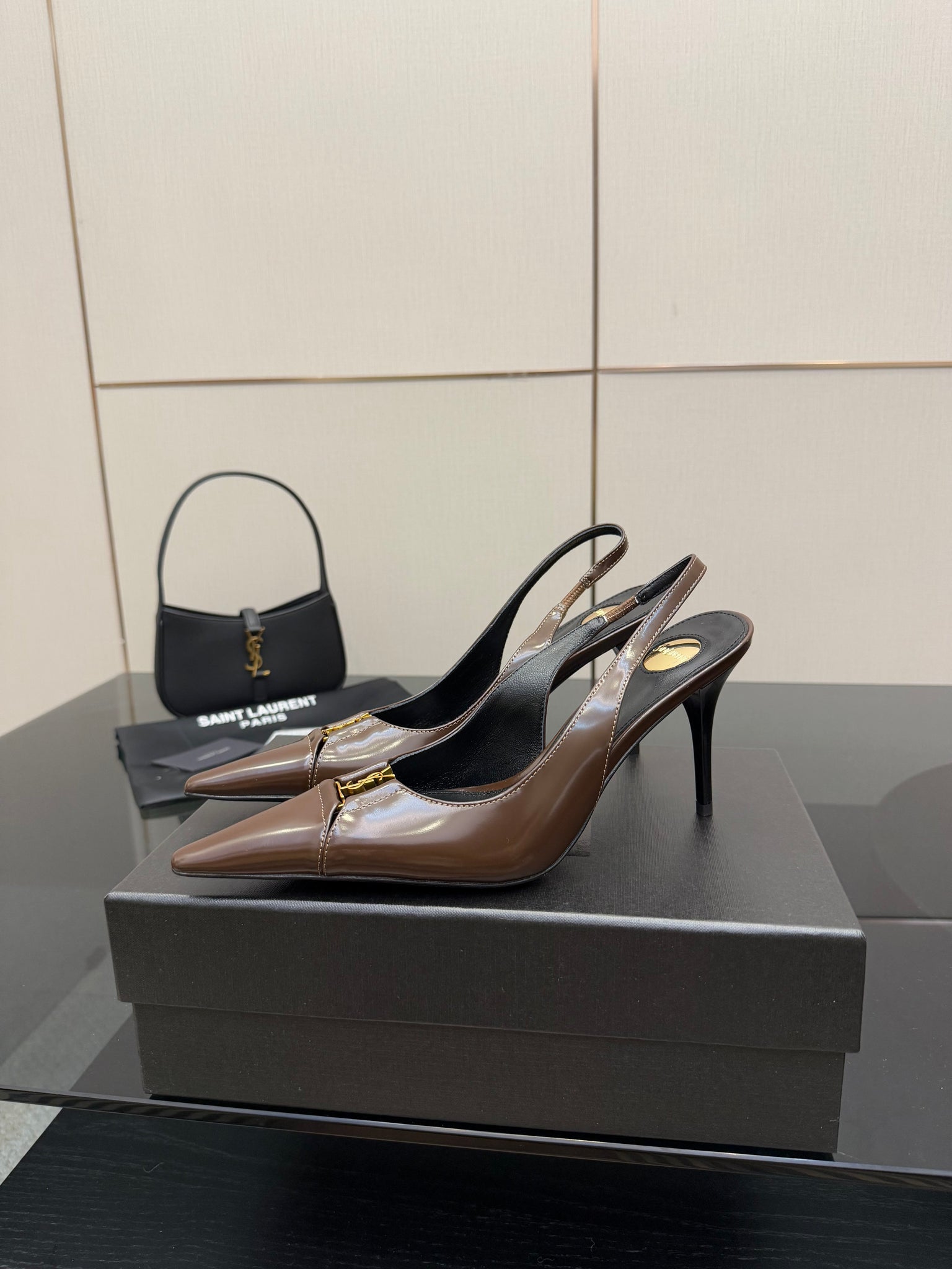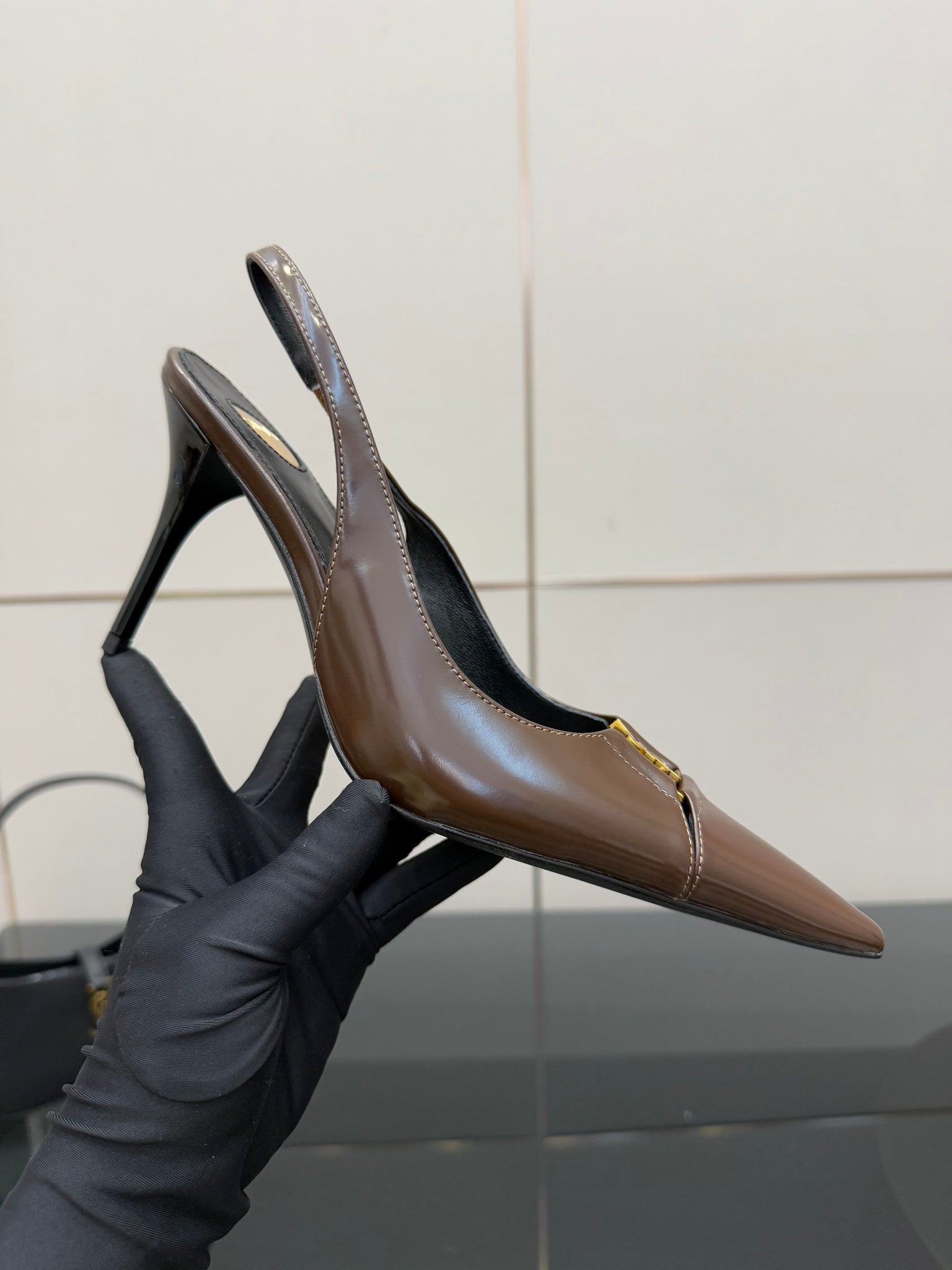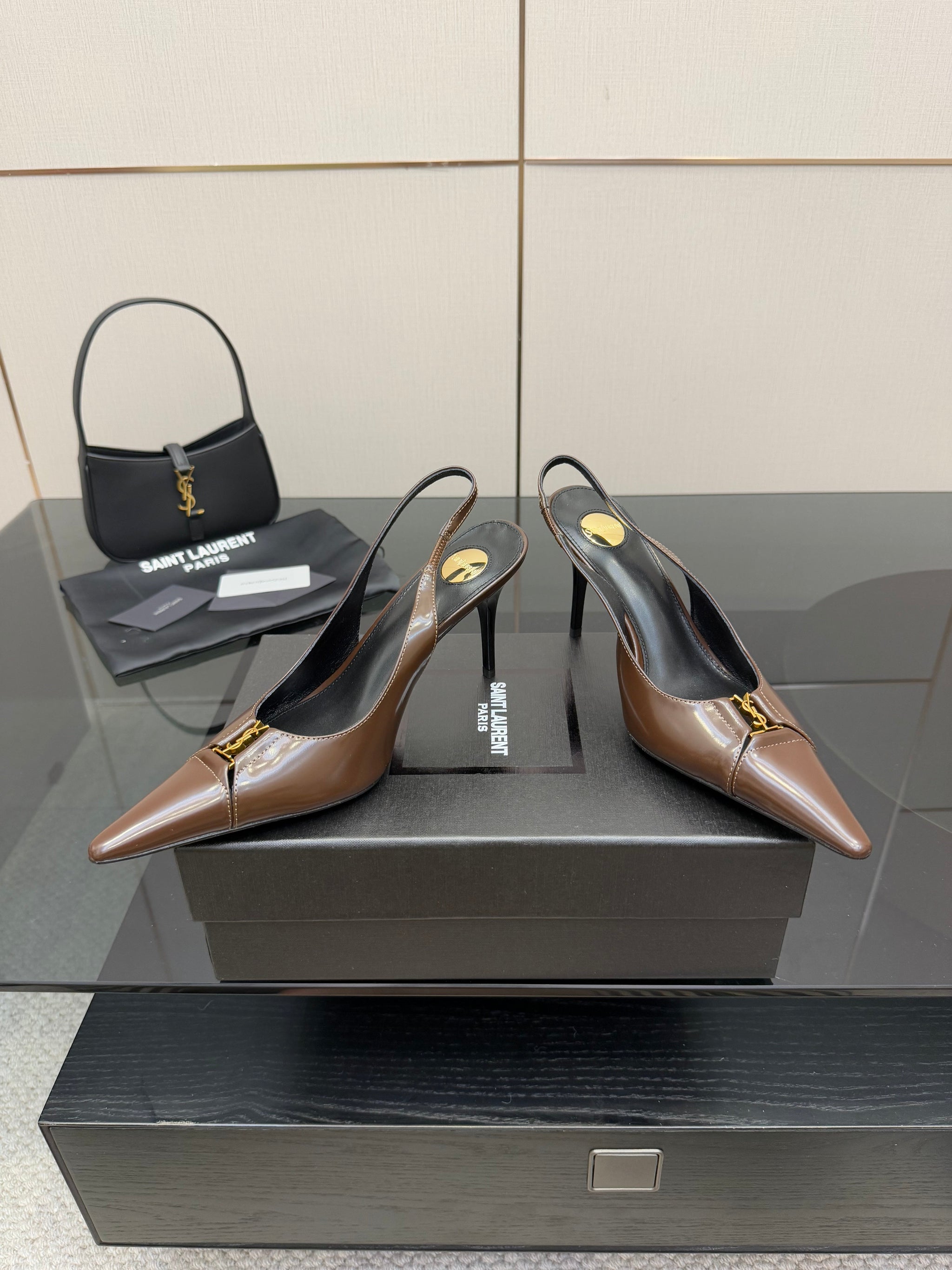 YSL 25S SLINGBACK HIGH HEELS 90 MM IN CHOCOLATE BROWN LAMBSKIN WITH GOLD HARDWARE YSL 25S SLINGBACK HIGH HEELS 90 MM IN CHOCOLATE BROWN LAMBSKIN WITH GOLD HARDWARE STYLE 7