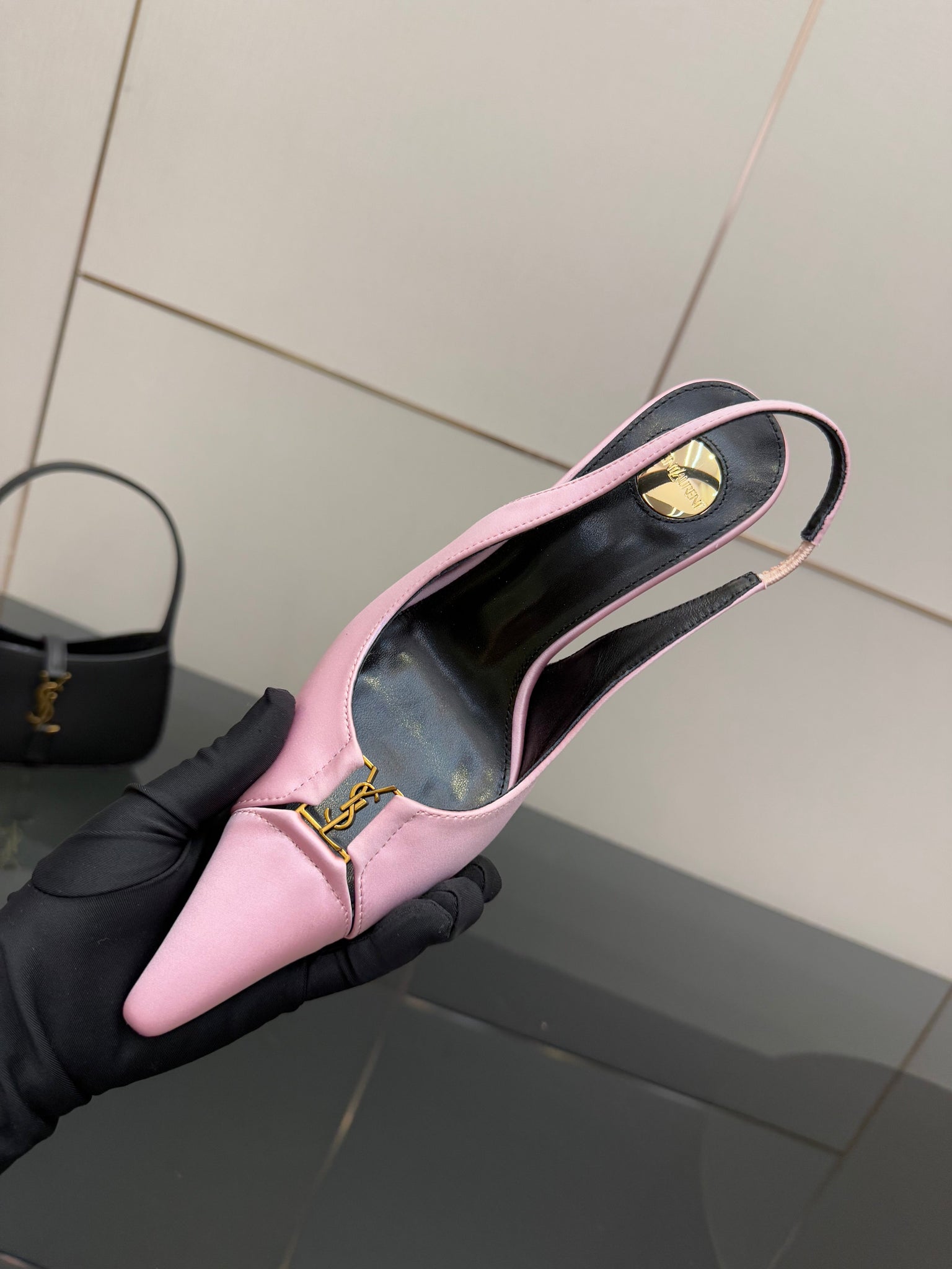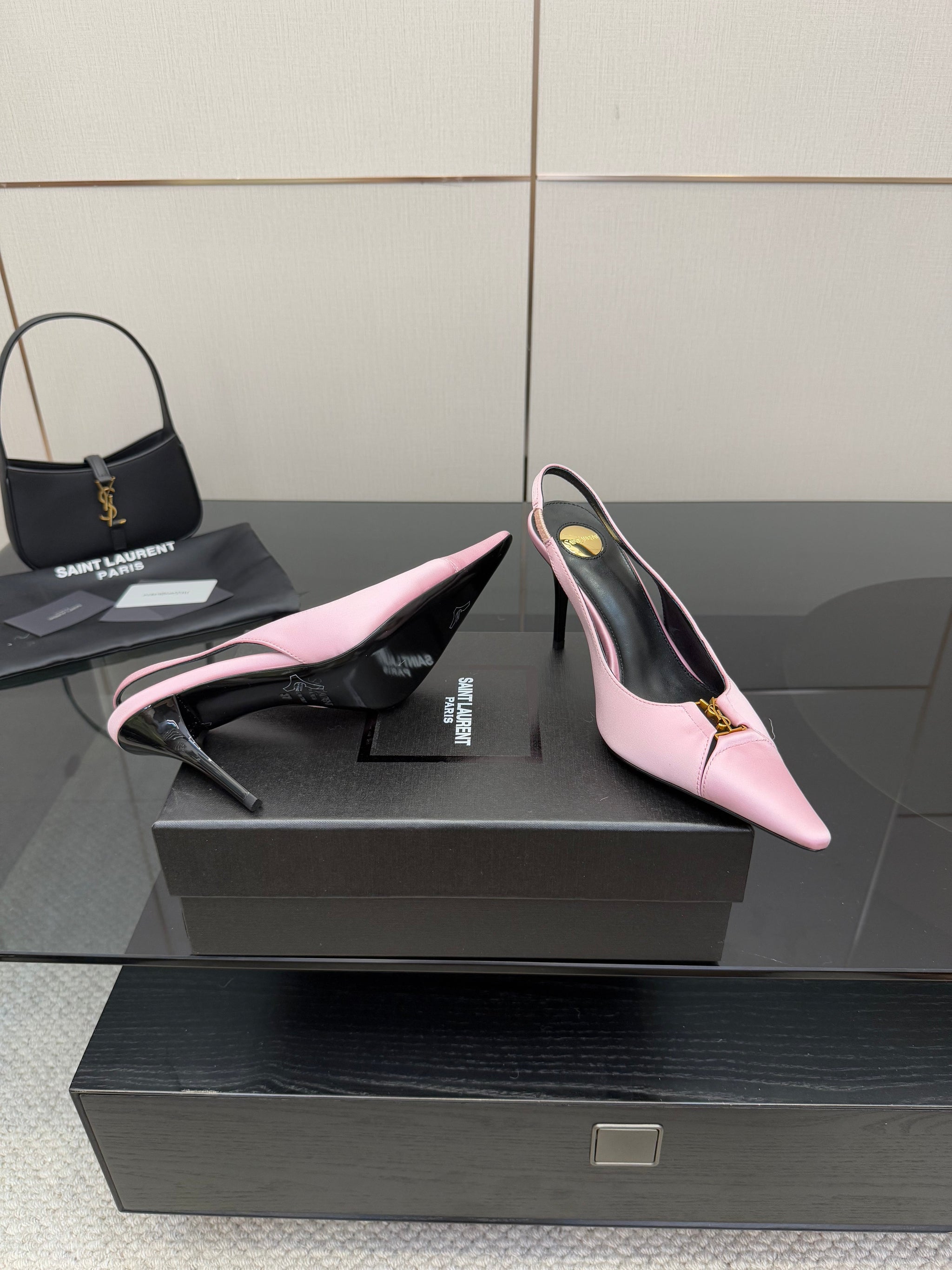 YSL 25S SLINGBACK HIGH HEELS 90 MM IN PINK SATIN WITH GOLD HARDWARE STYLE 17