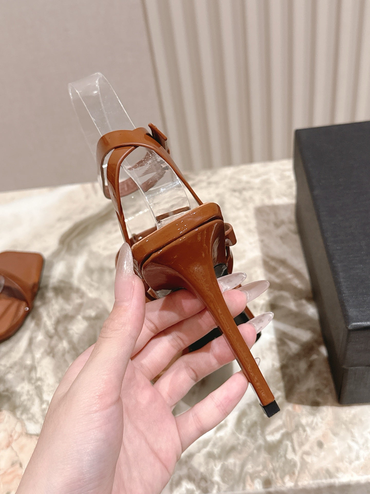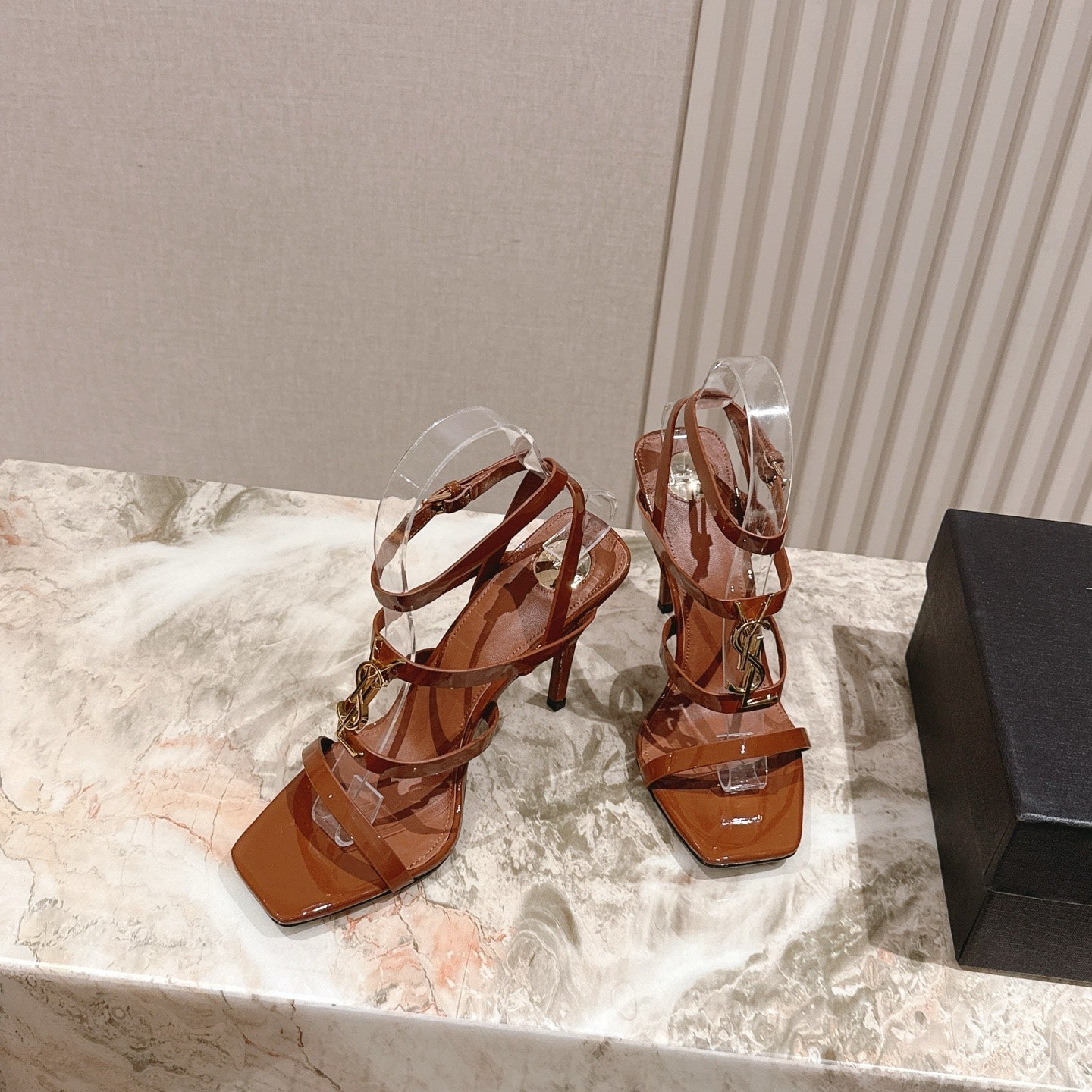 YSL 25S STILETTO HIGH-HEEL SANDALS 100 MM IN BROWN LAMBSKIN WITH GOLD HARDWARE