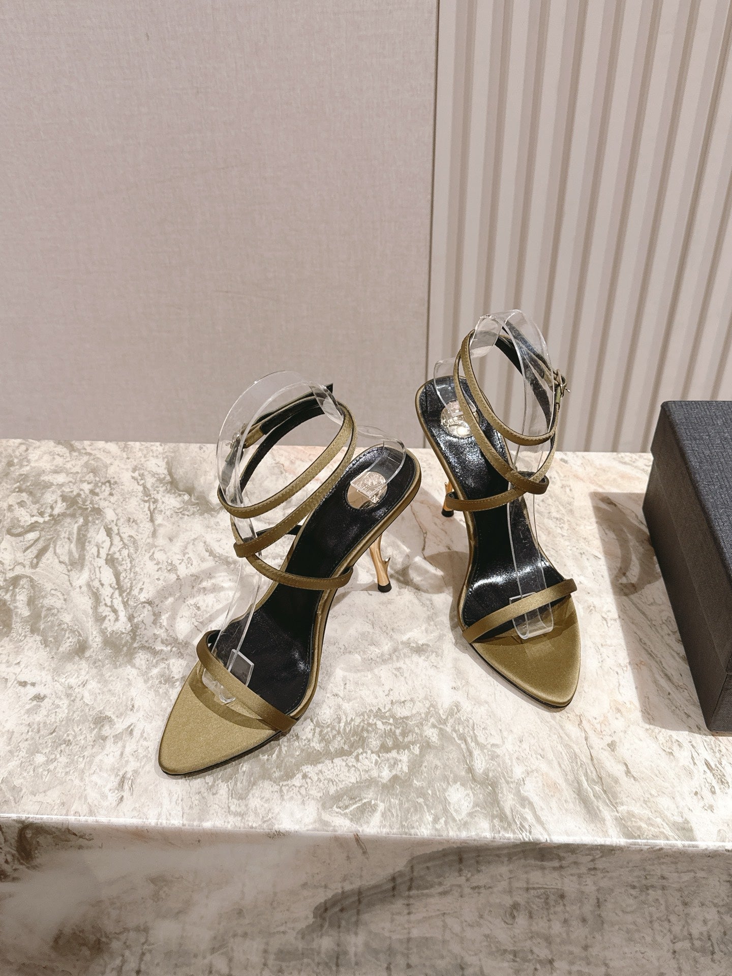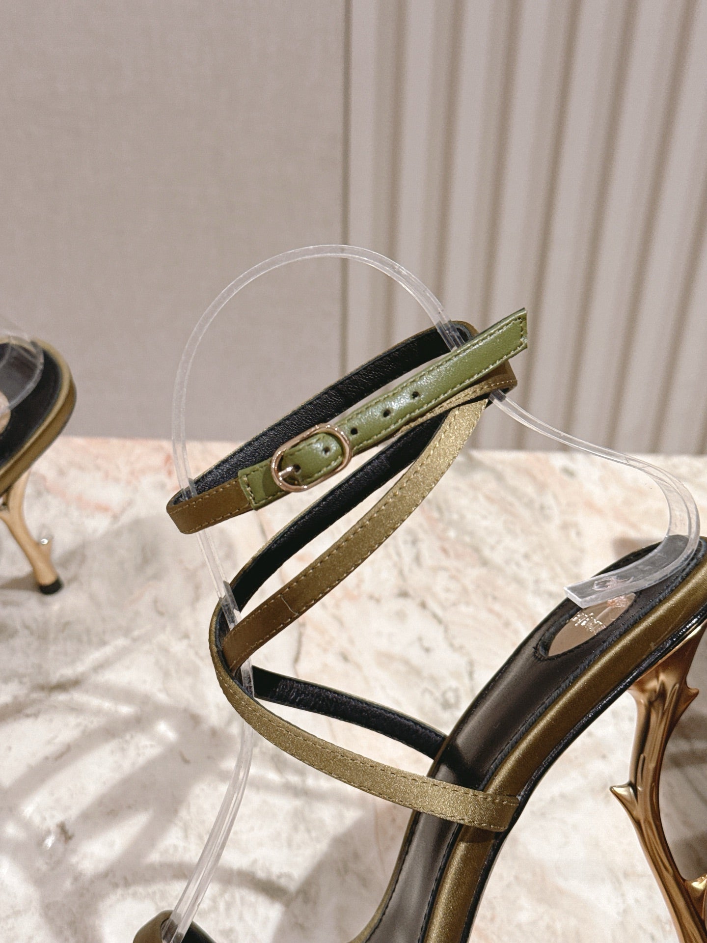 YSL 25S STRAPPY HIGH-HEEL SANDALS 100 MM IN OLIVE GREEN LAMBSKIN