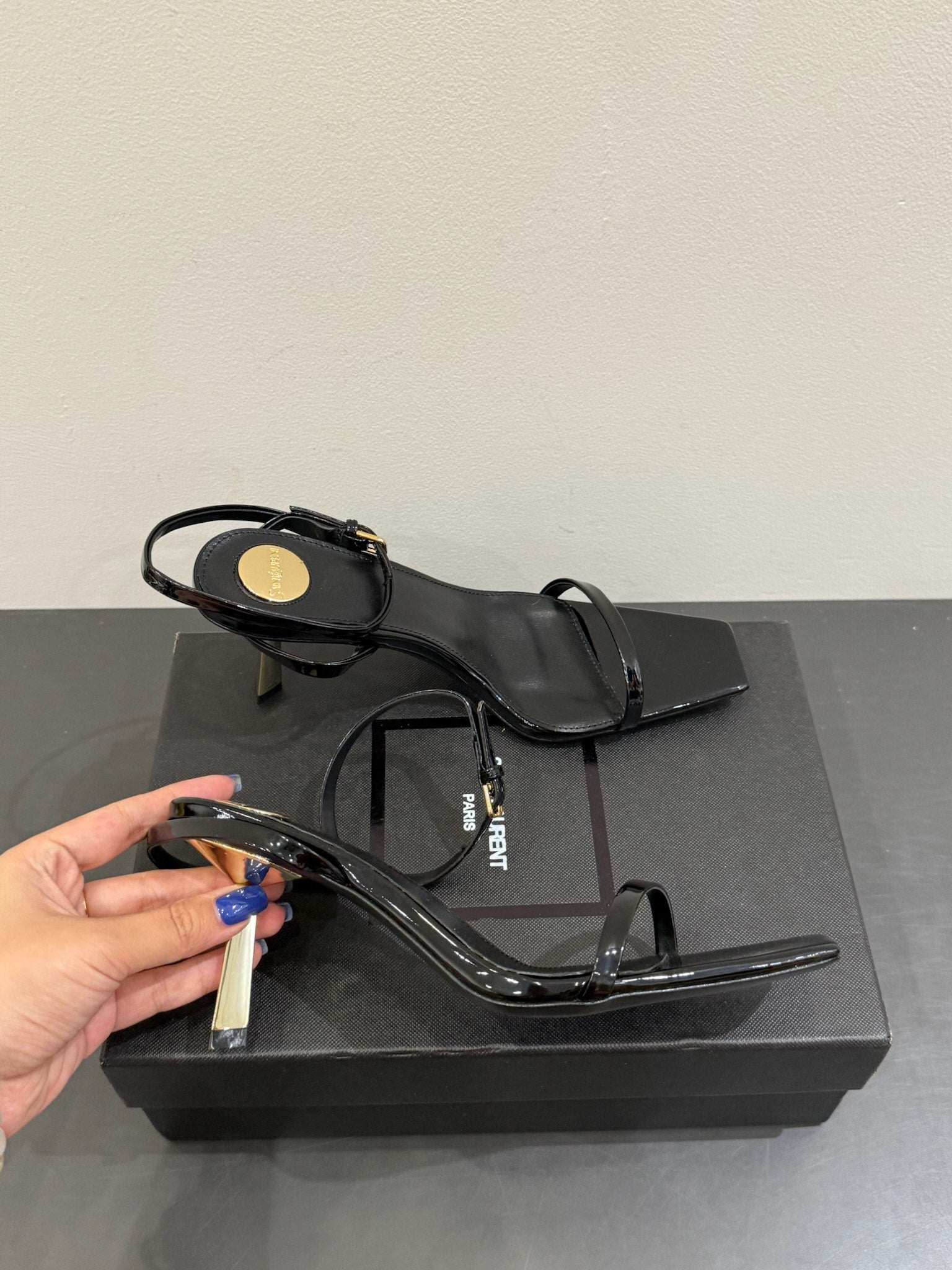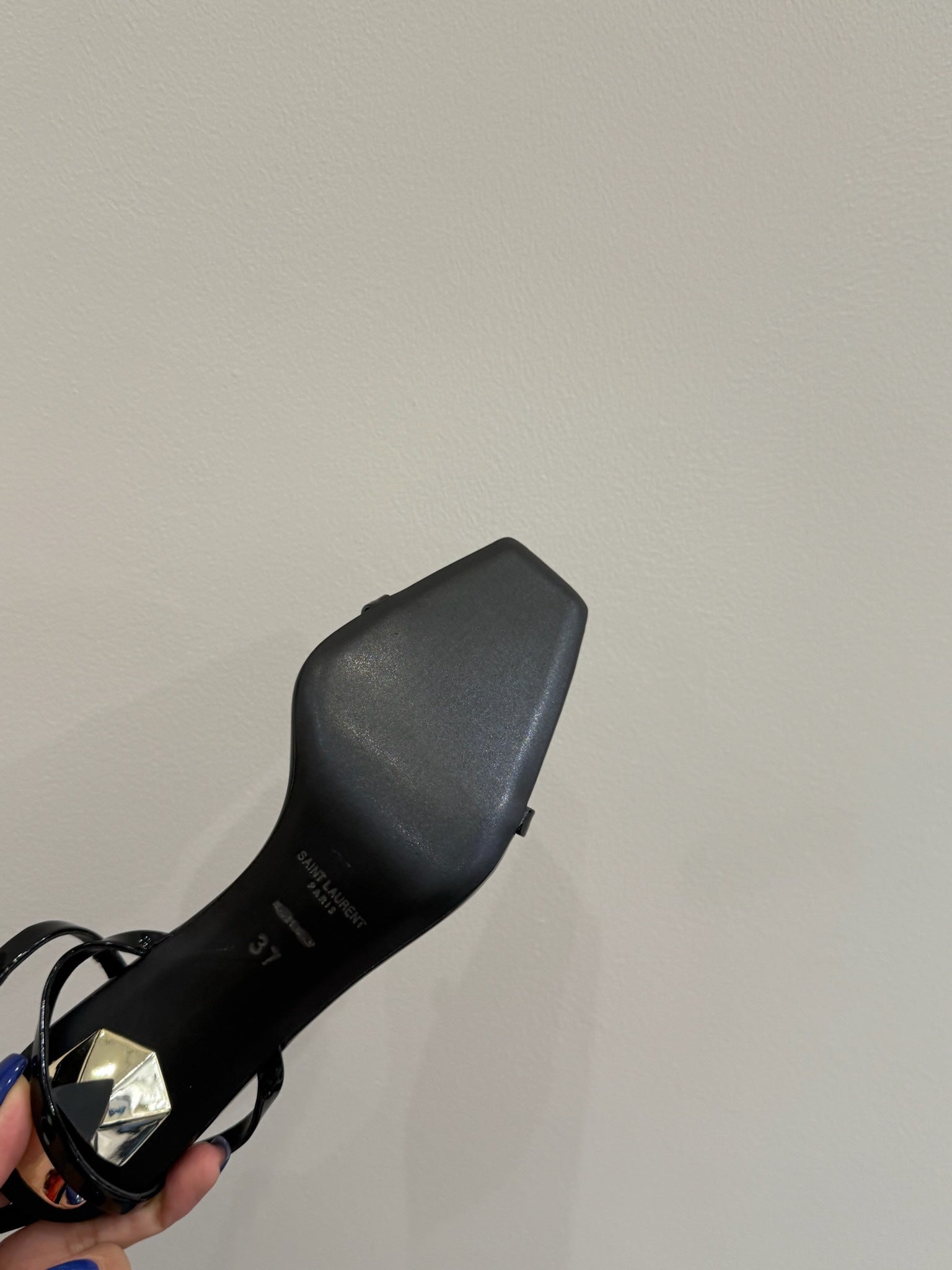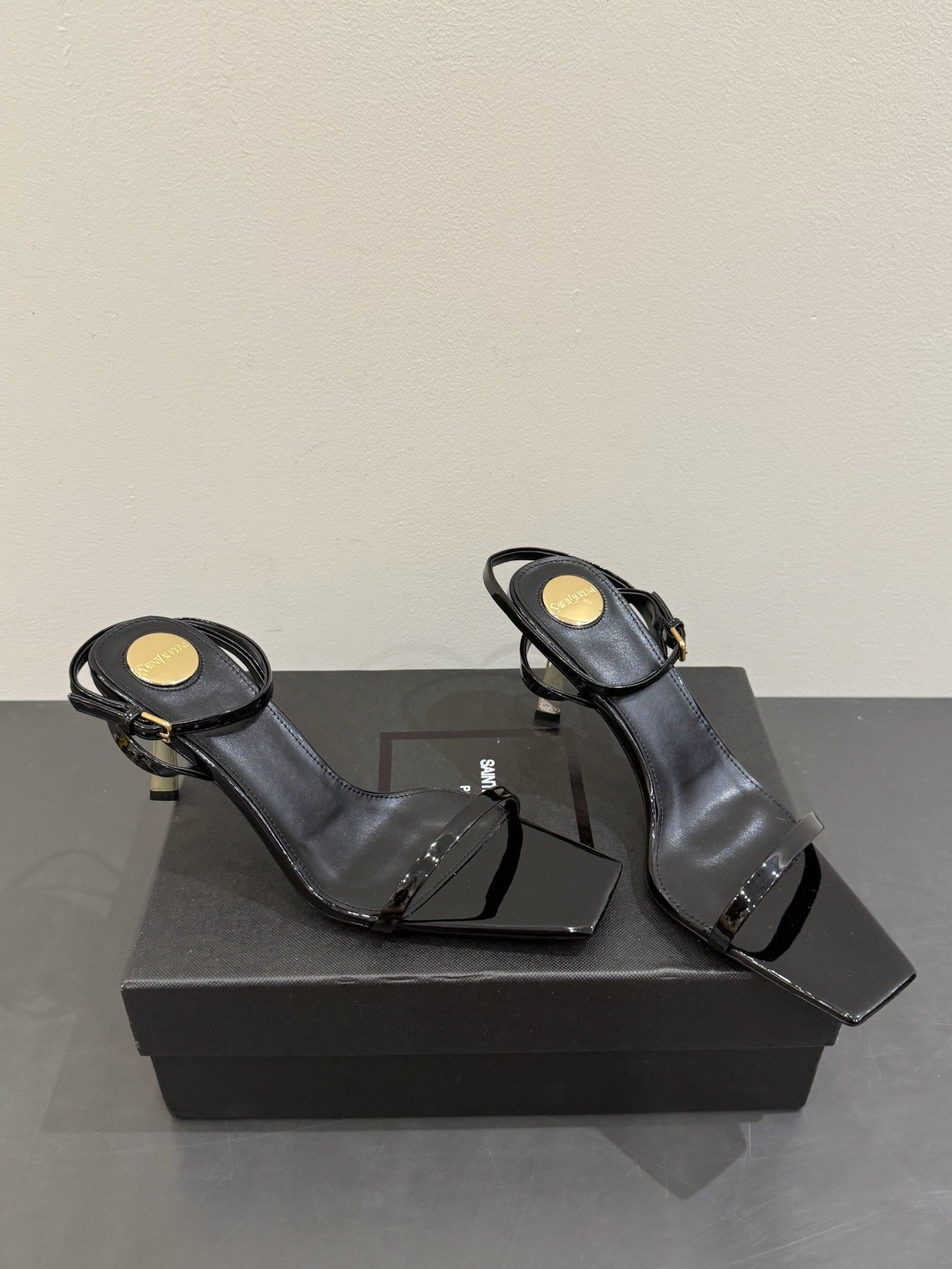 YSL KITTEN HEEL SANDALS 25S IN BLACK GLOSSY LAMBSKIN