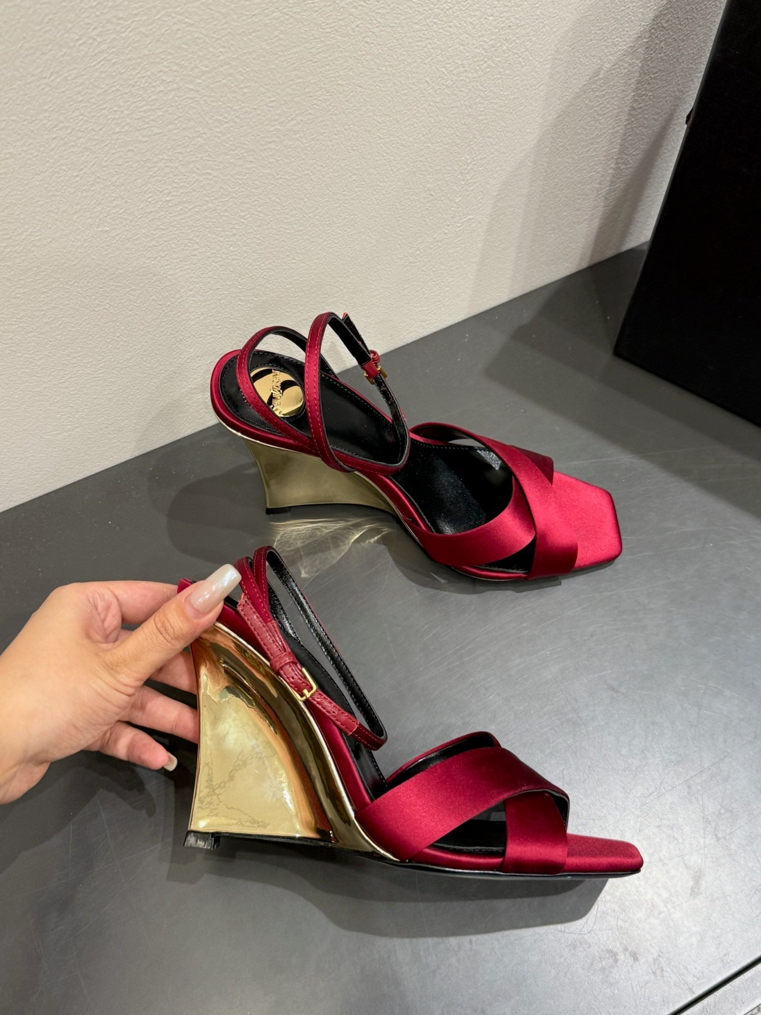 YSL STRAPPY WEDGE SANDALS 25S IN DARK RED SATIN