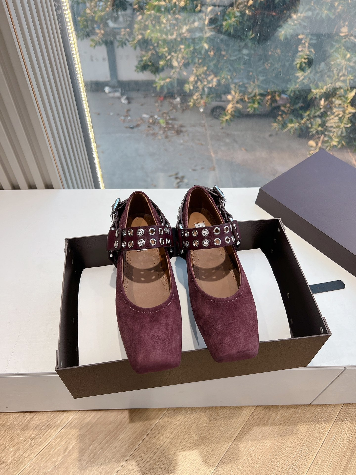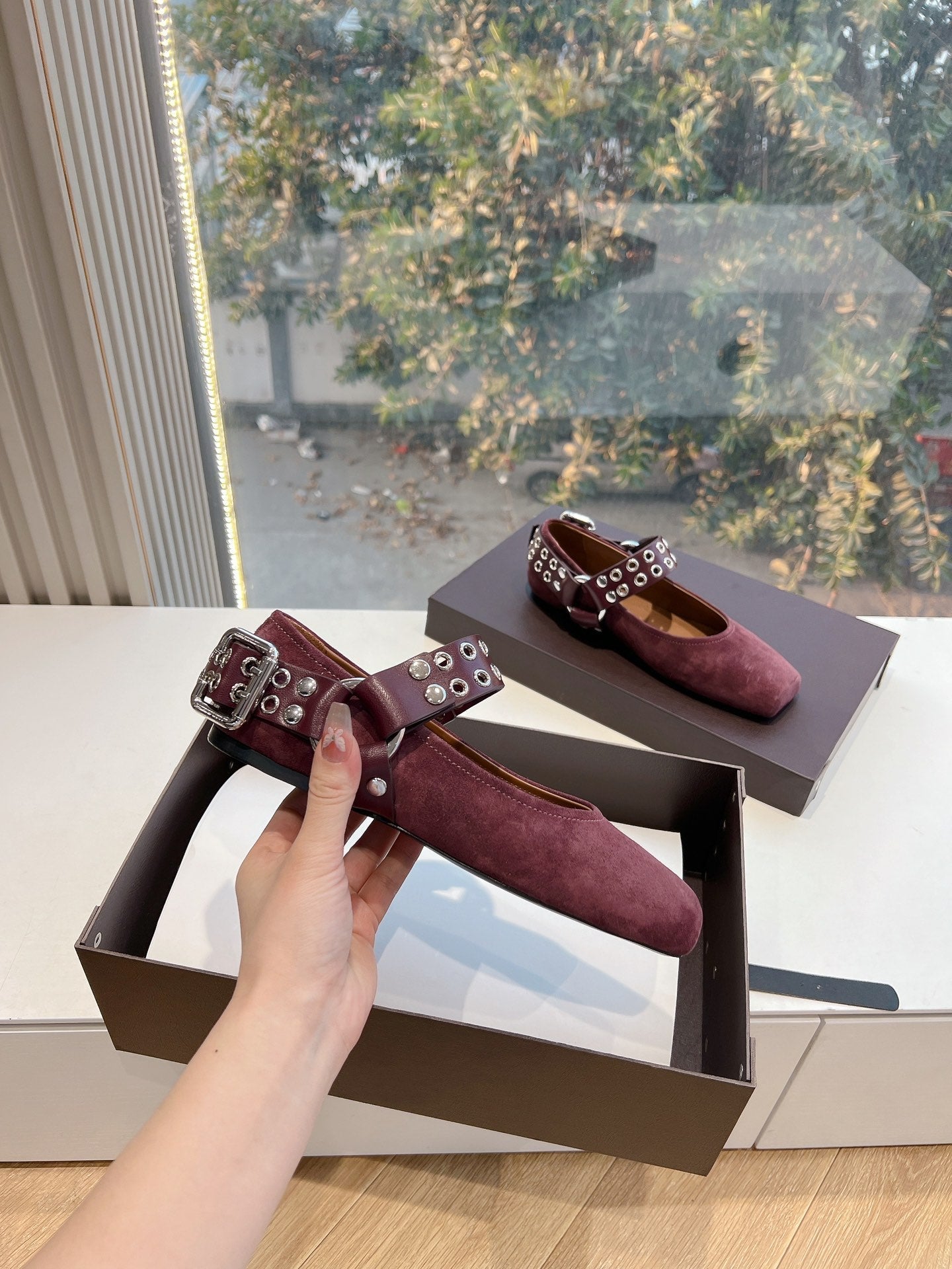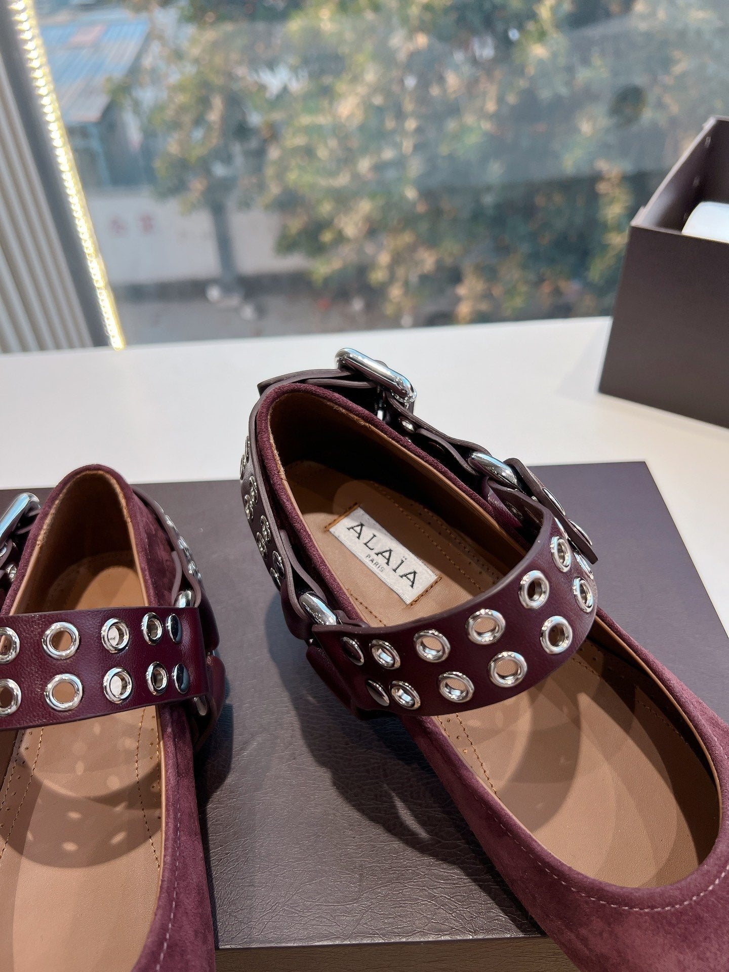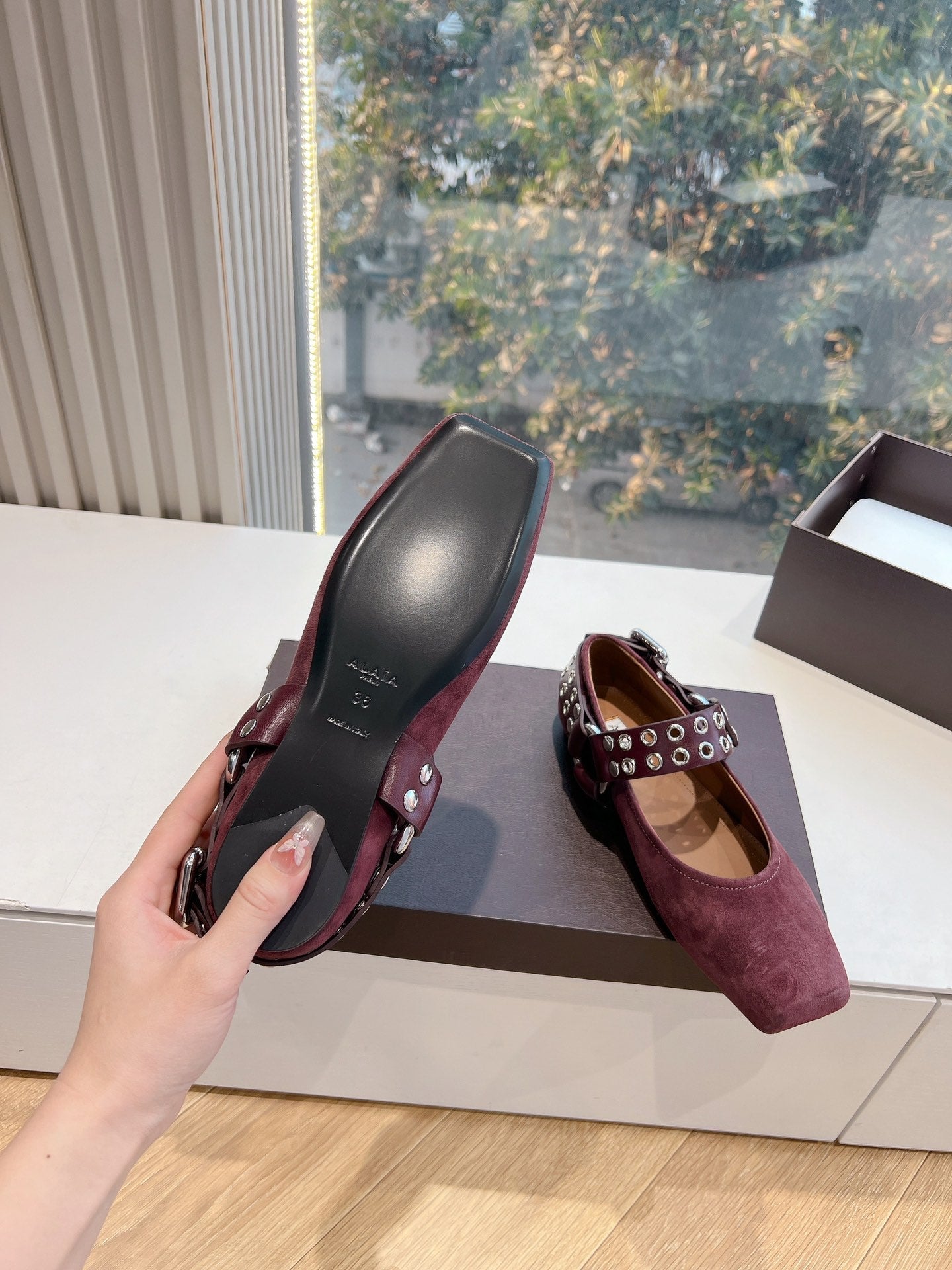 ALAIA 26S FLATS IN DARK RED SUEDE WITH SILVER STUD STRAP