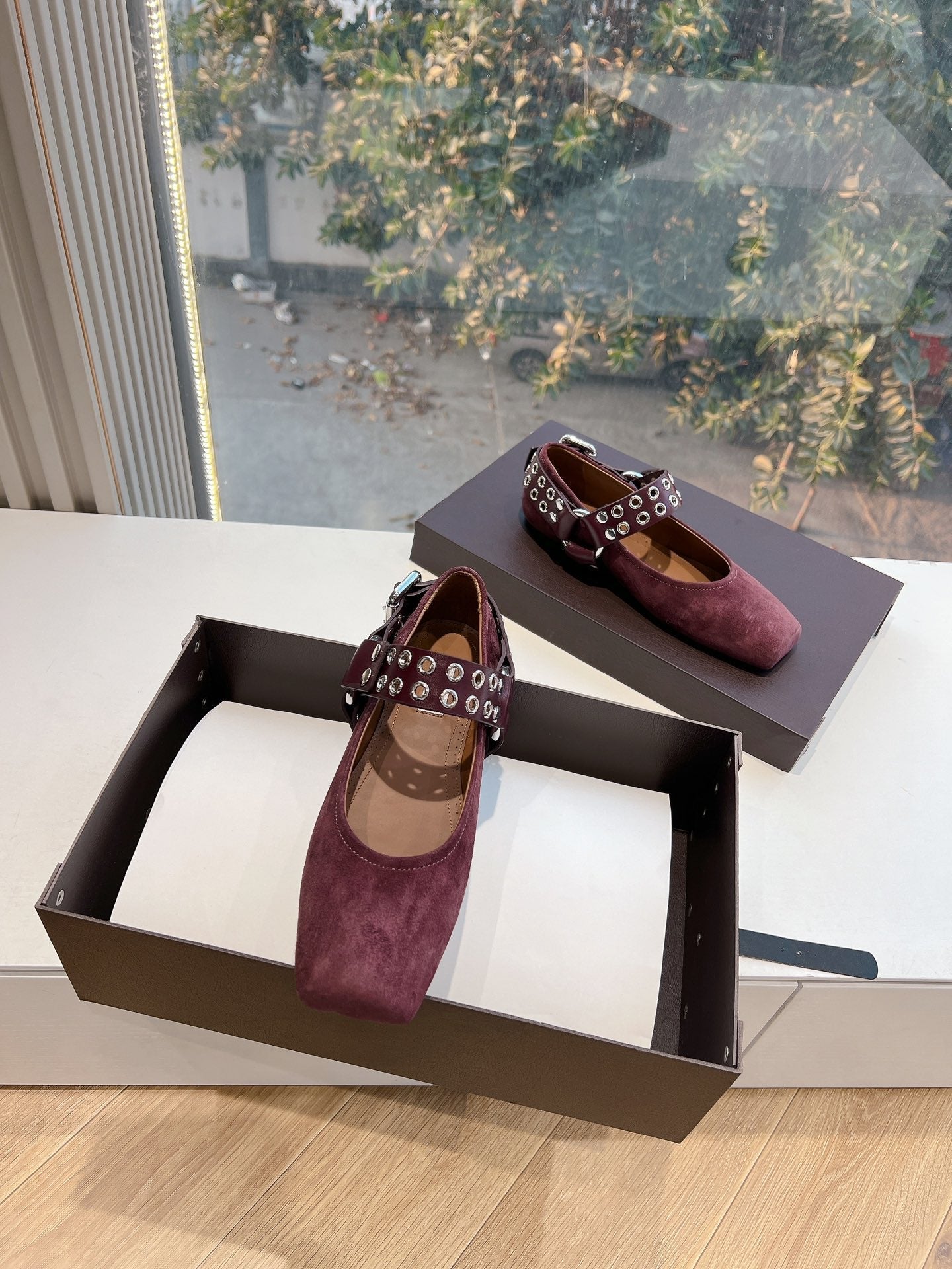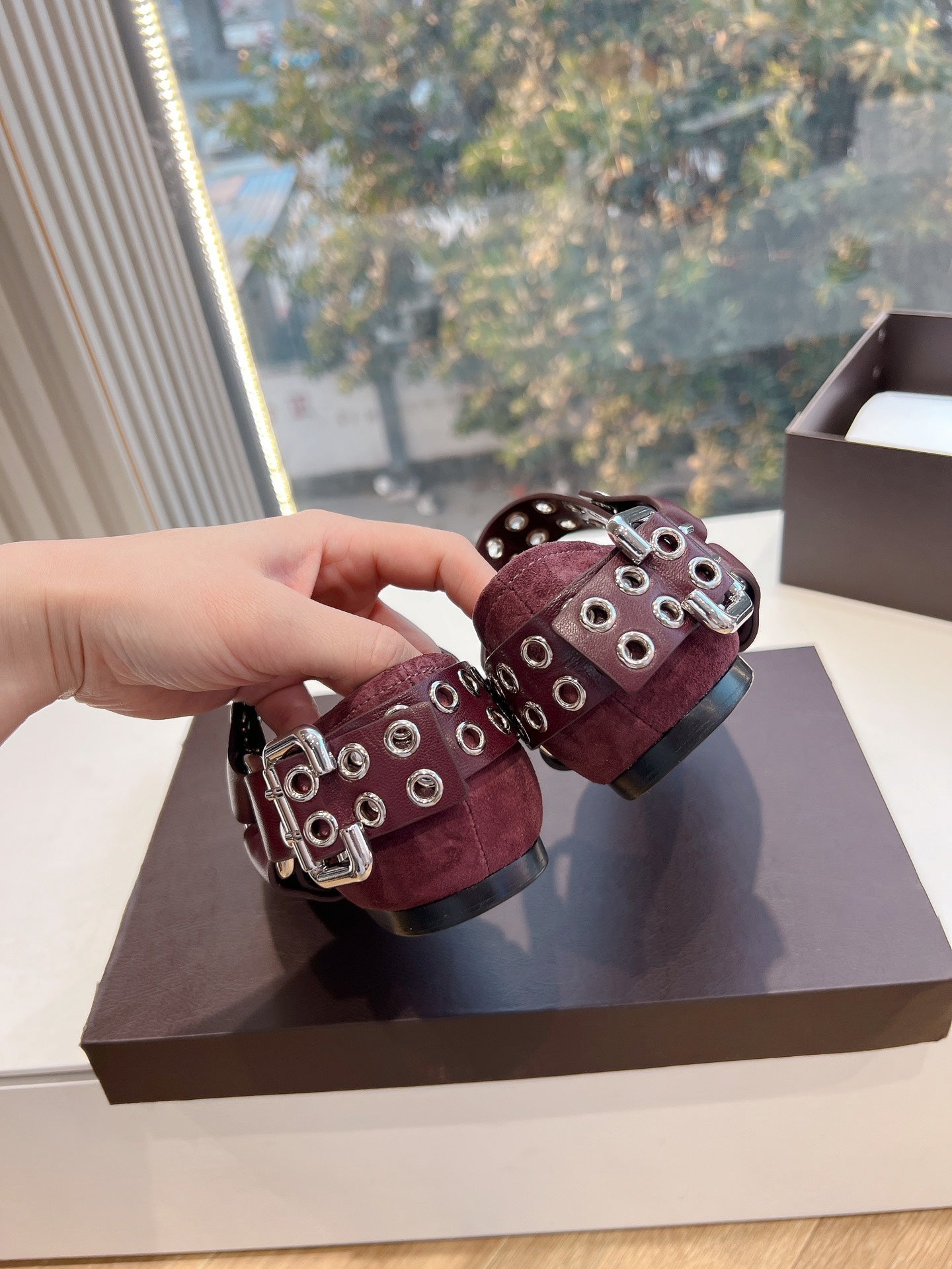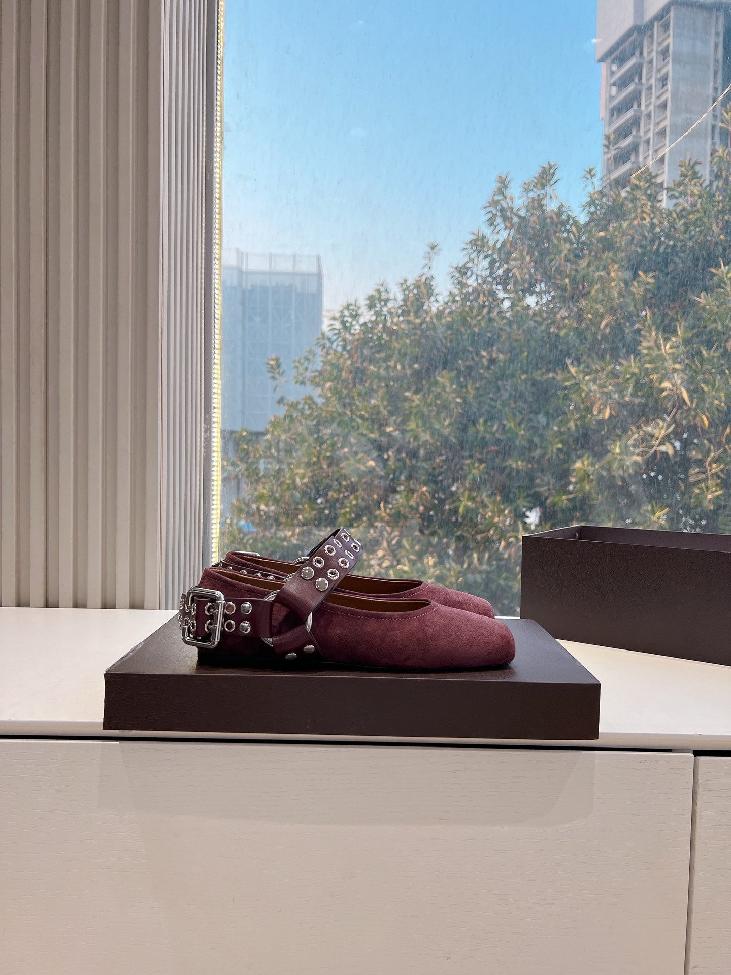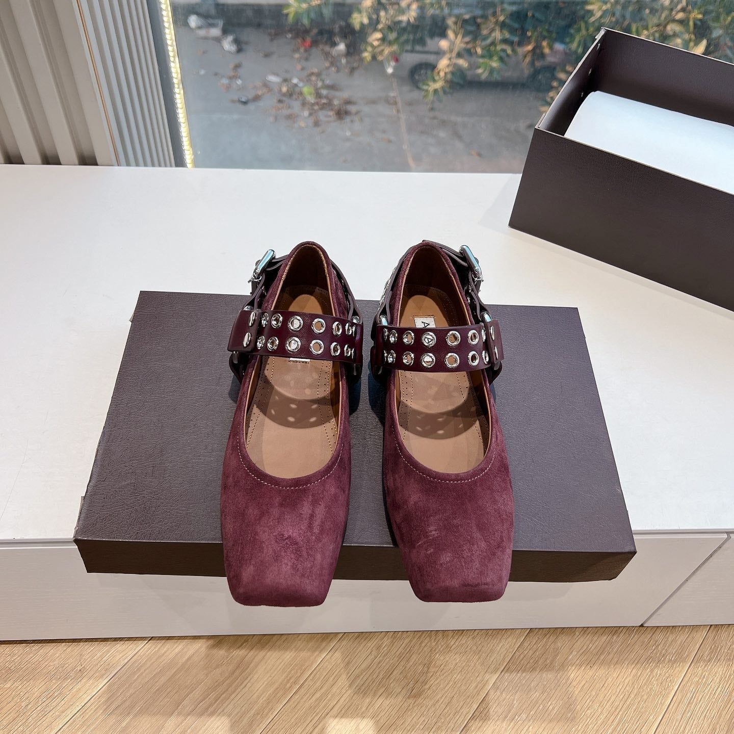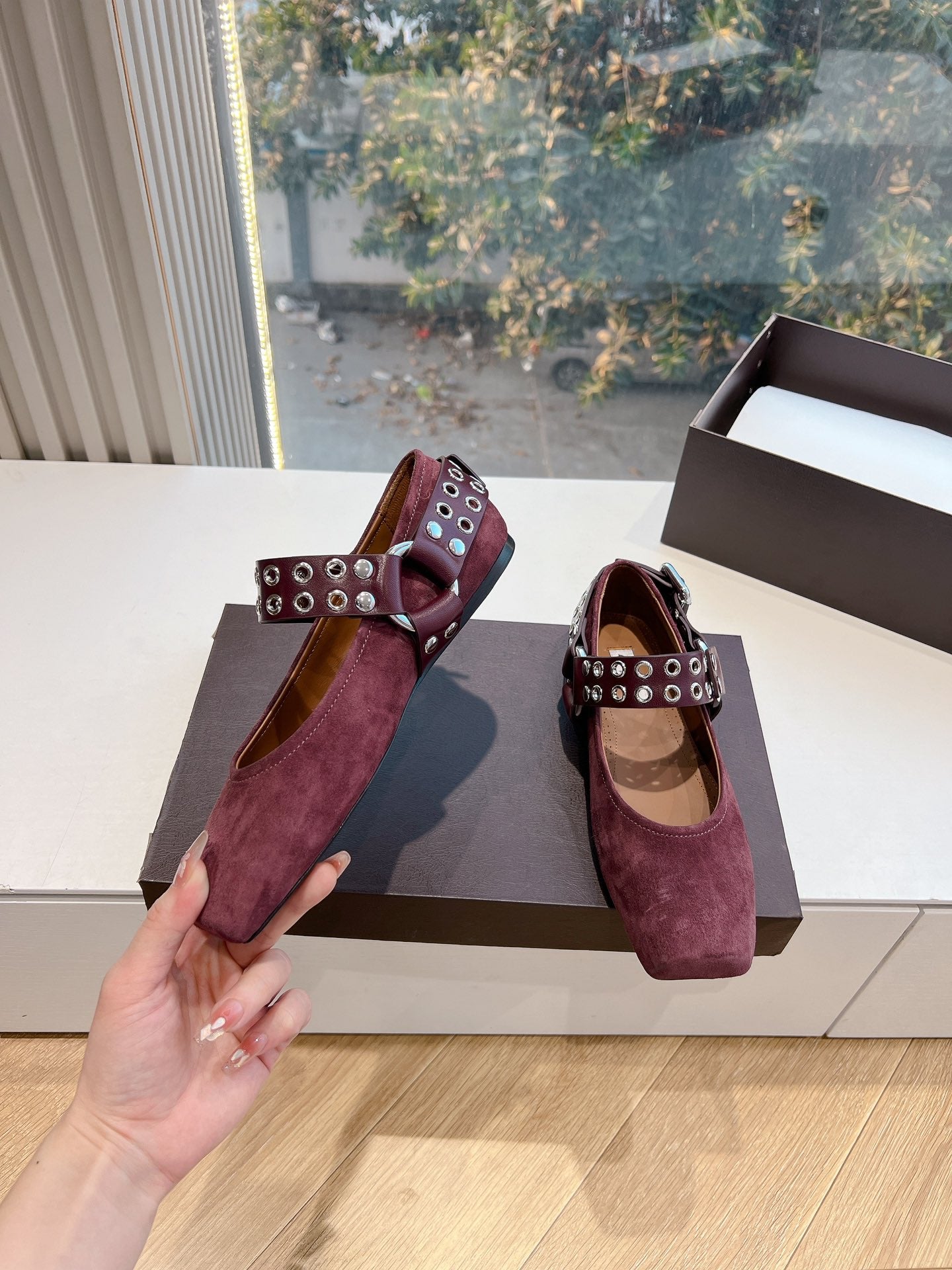 ALAIA 26S FLATS IN DARK RED SUEDE WITH SILVER STUD STRAP