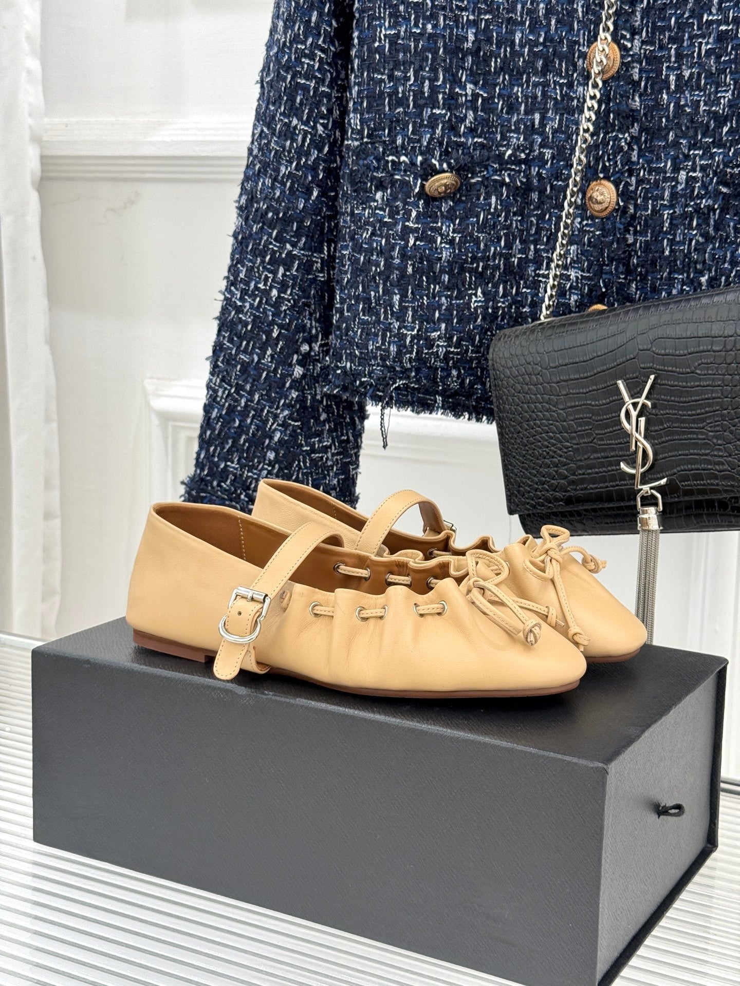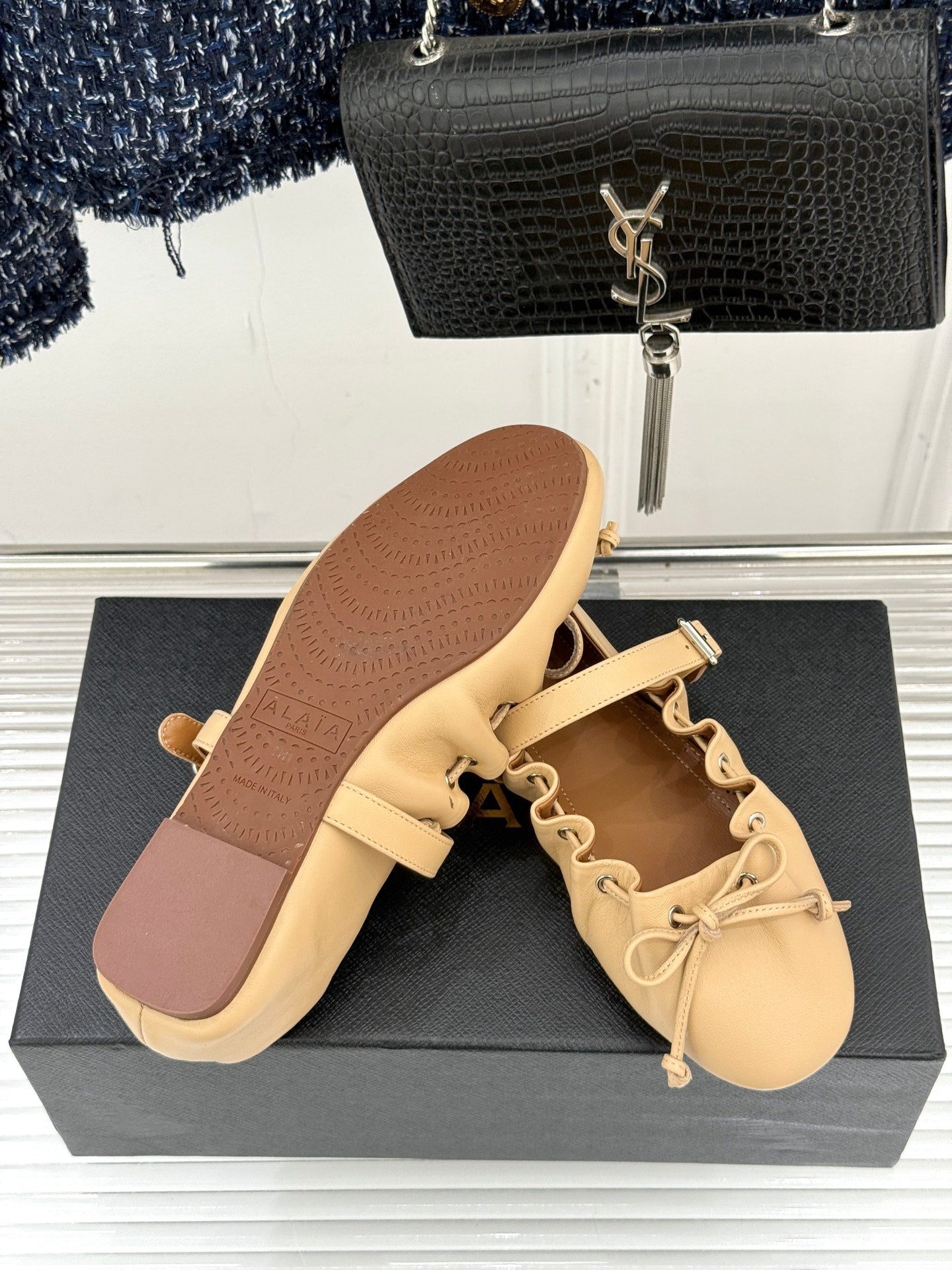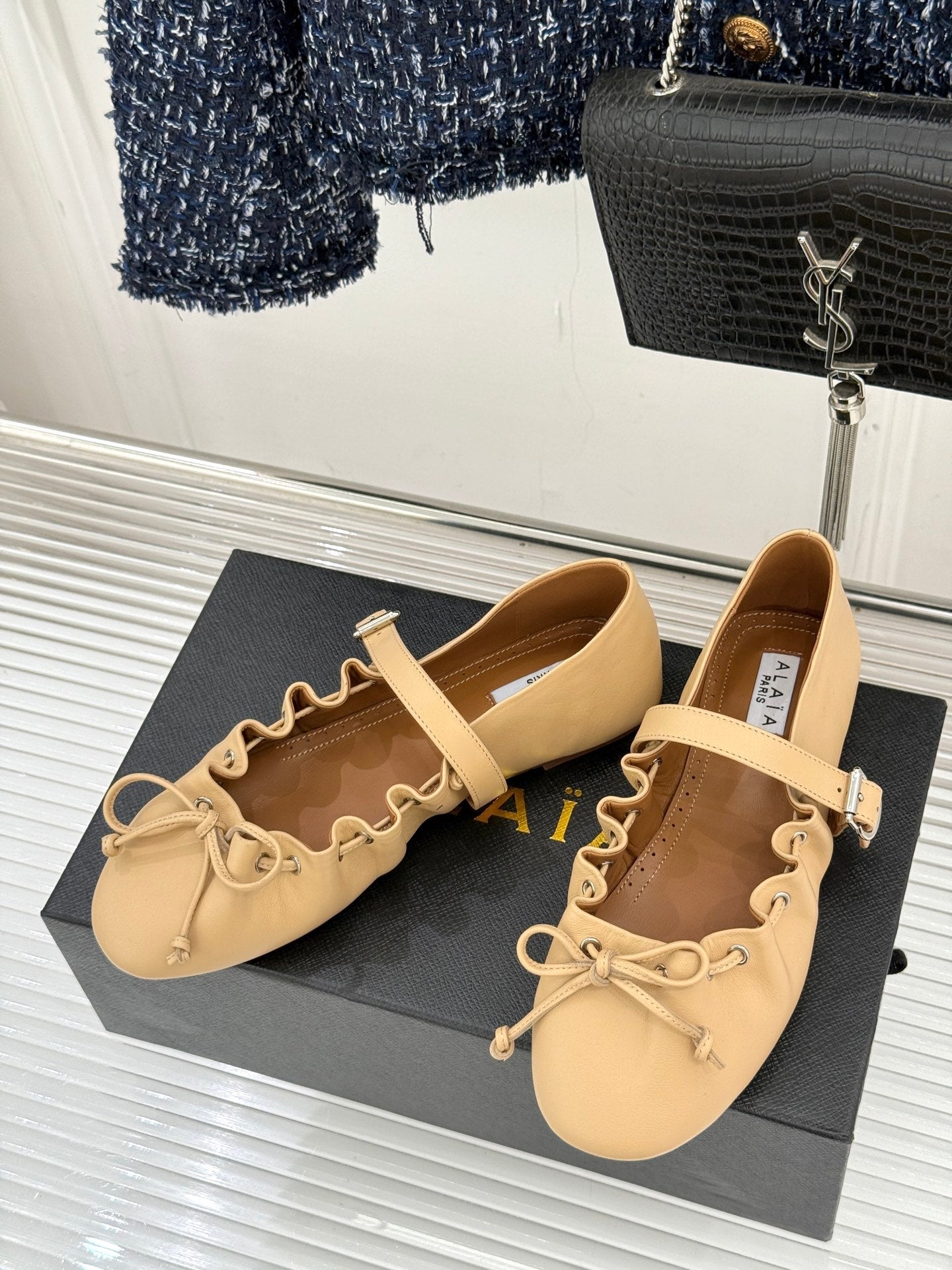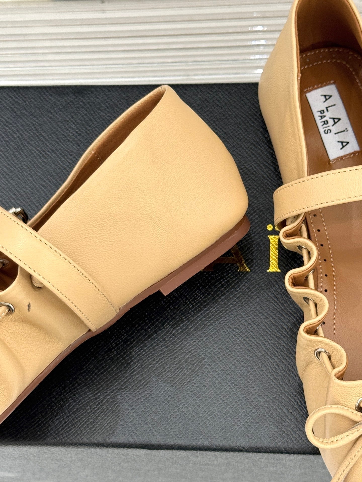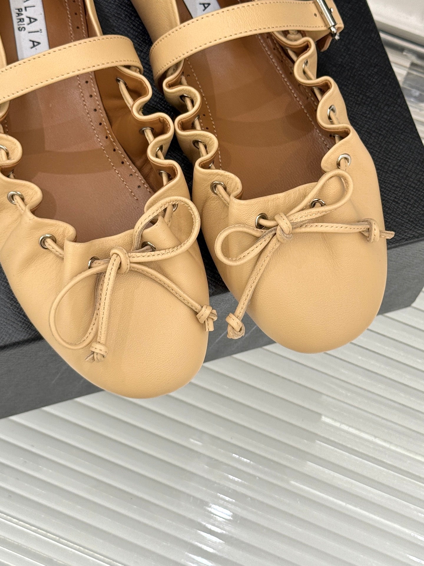 ALAIA 26S MARY JANE FLATS IN LIGHT YELLOW BEIGE LAMBSKIN WITH BOW