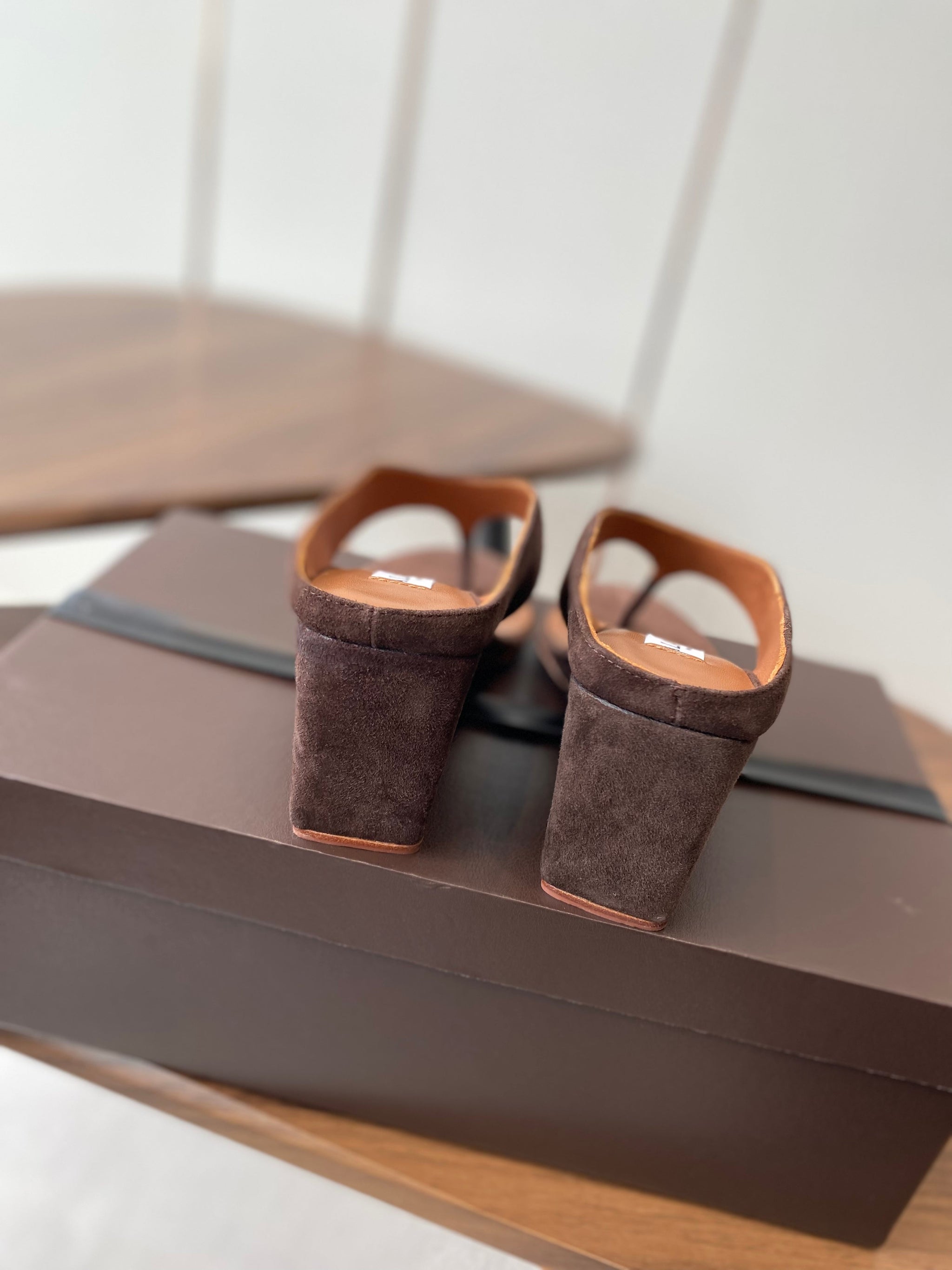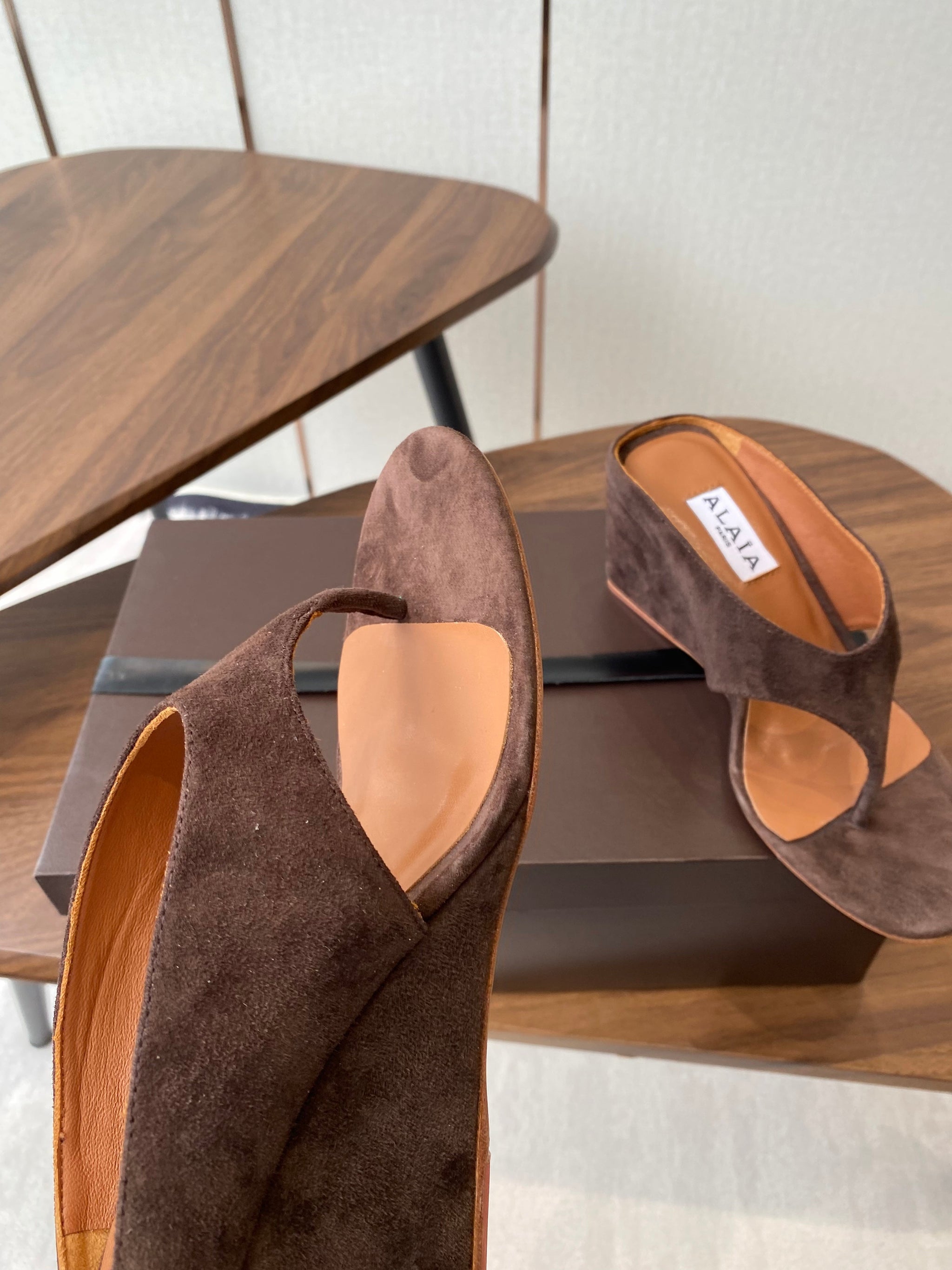 ALAIA WEDGE THONG SANDALS 25S IN BROWN SUEDE