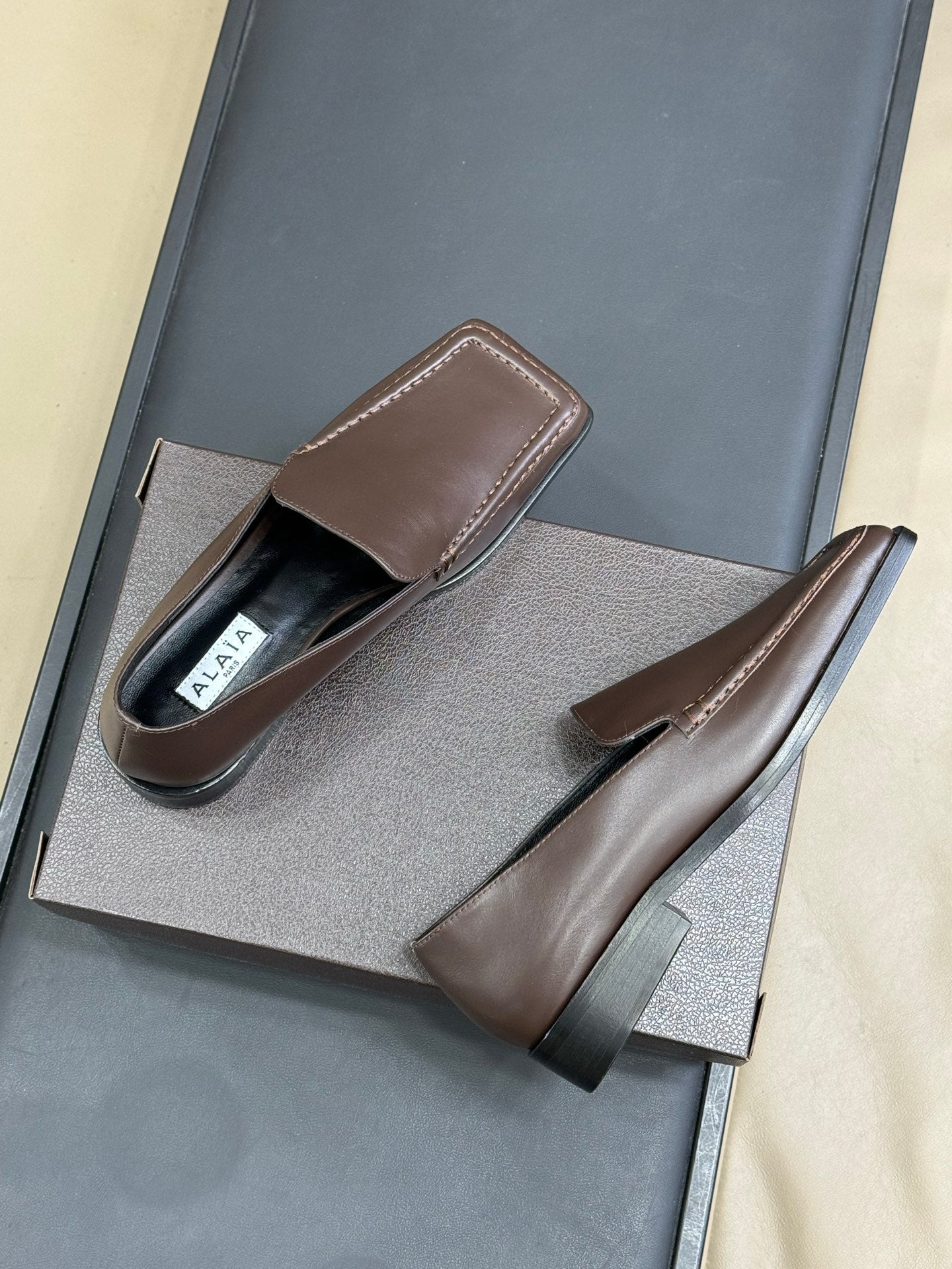 ALAIA 25S SQUARE TOE LOAFER IN BROWN CALFSKIN