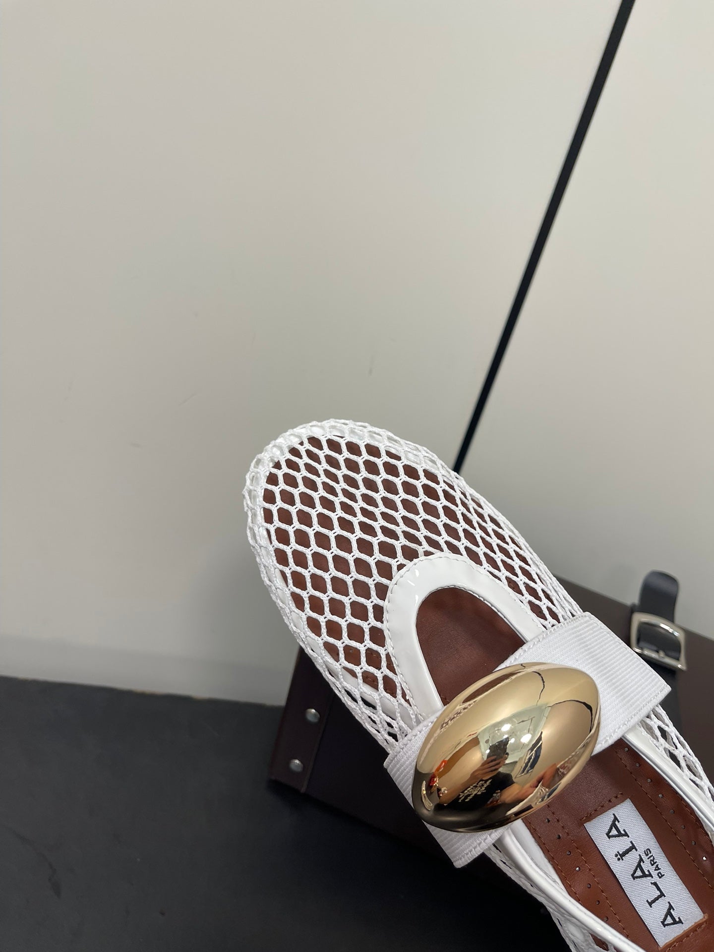 ALAIA BALLET FLATS IN WHITE MESH FISHNET WITH GOLD HARDWARE