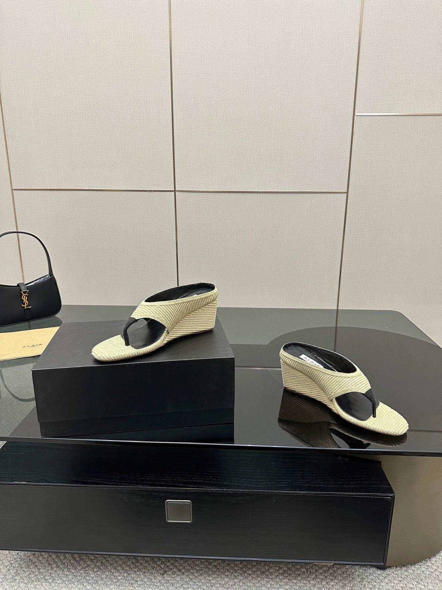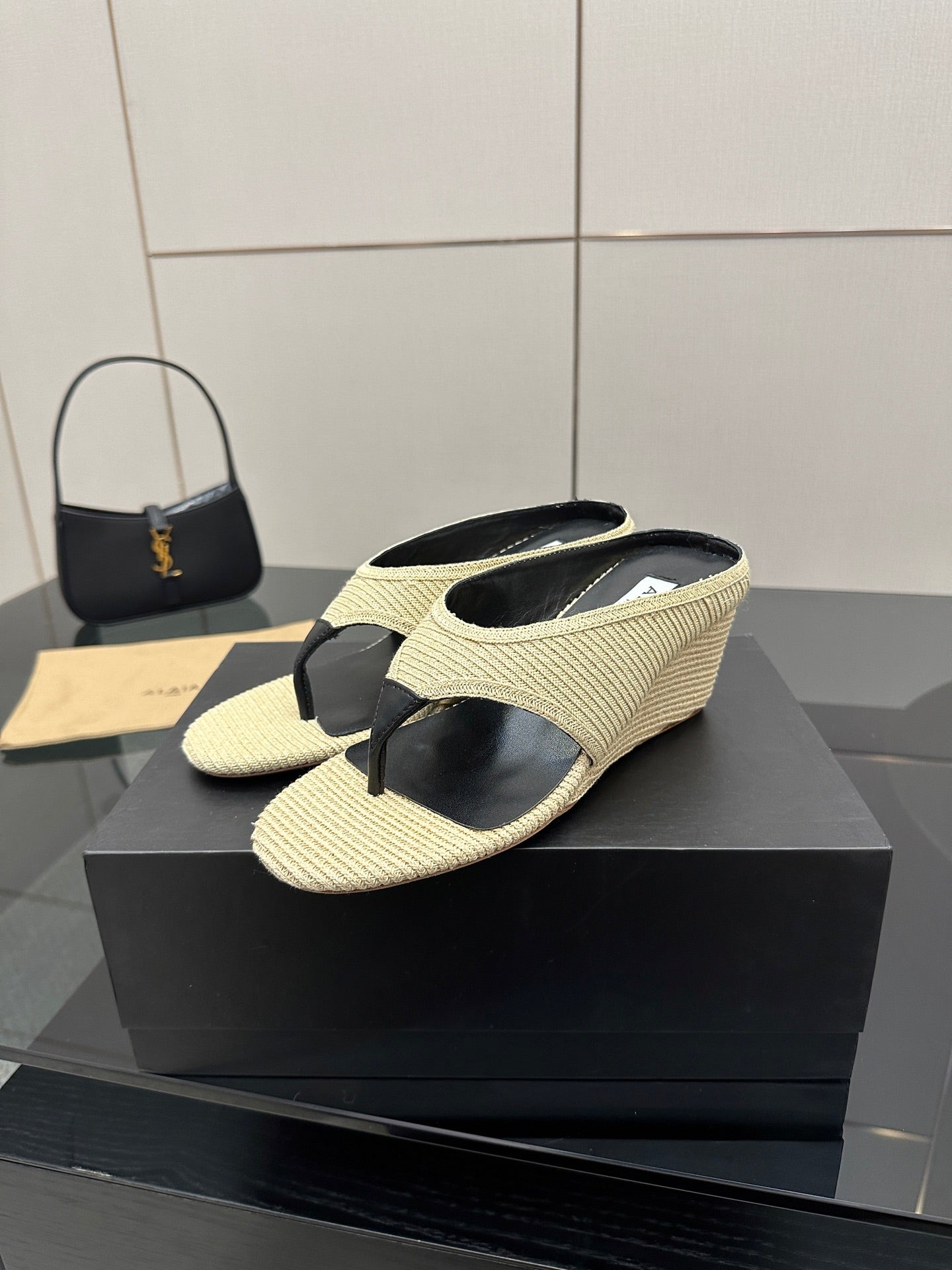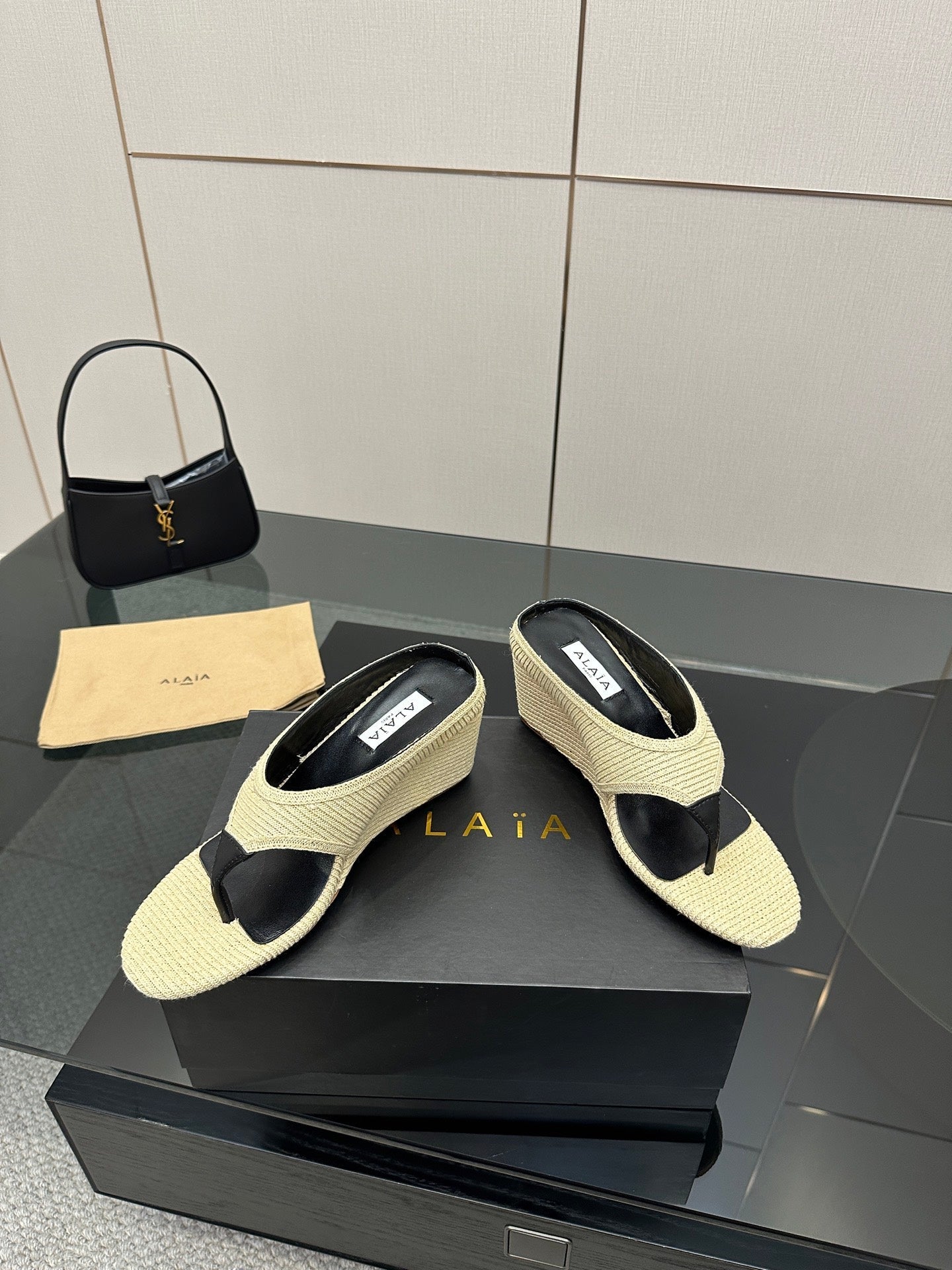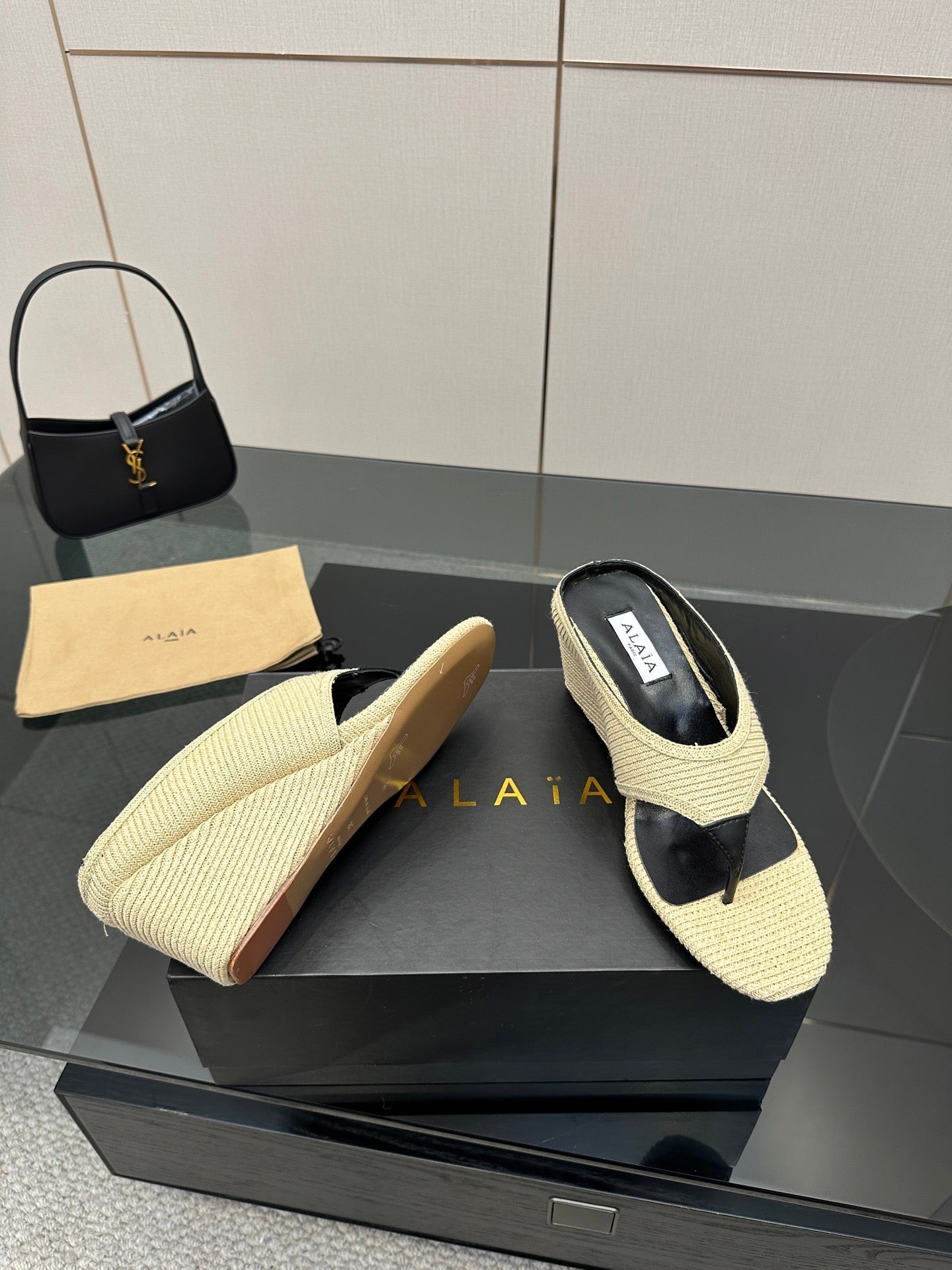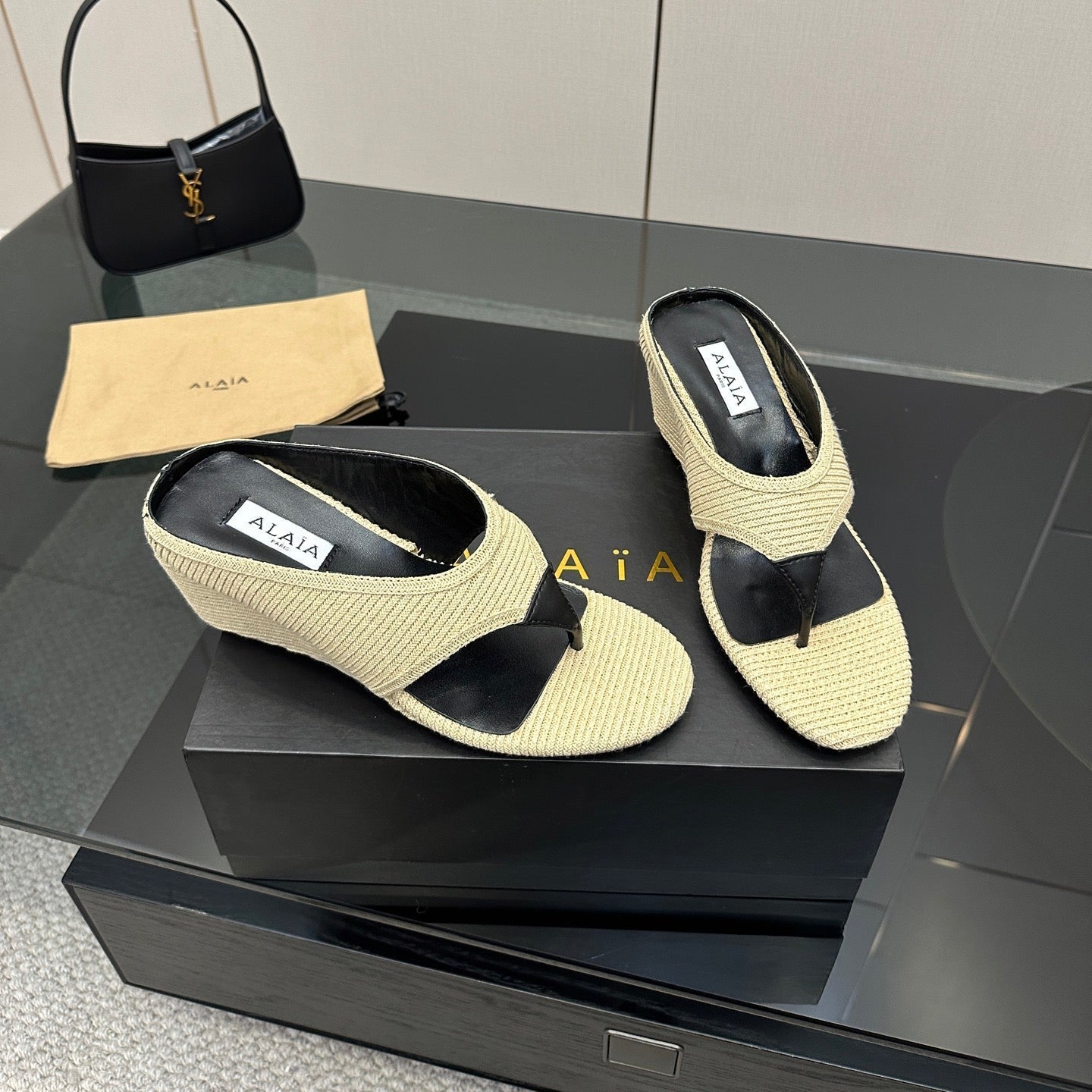 ALAIA WEDGE THONG SANDALS 25S IN LIGHT BEIGE RAFFIA