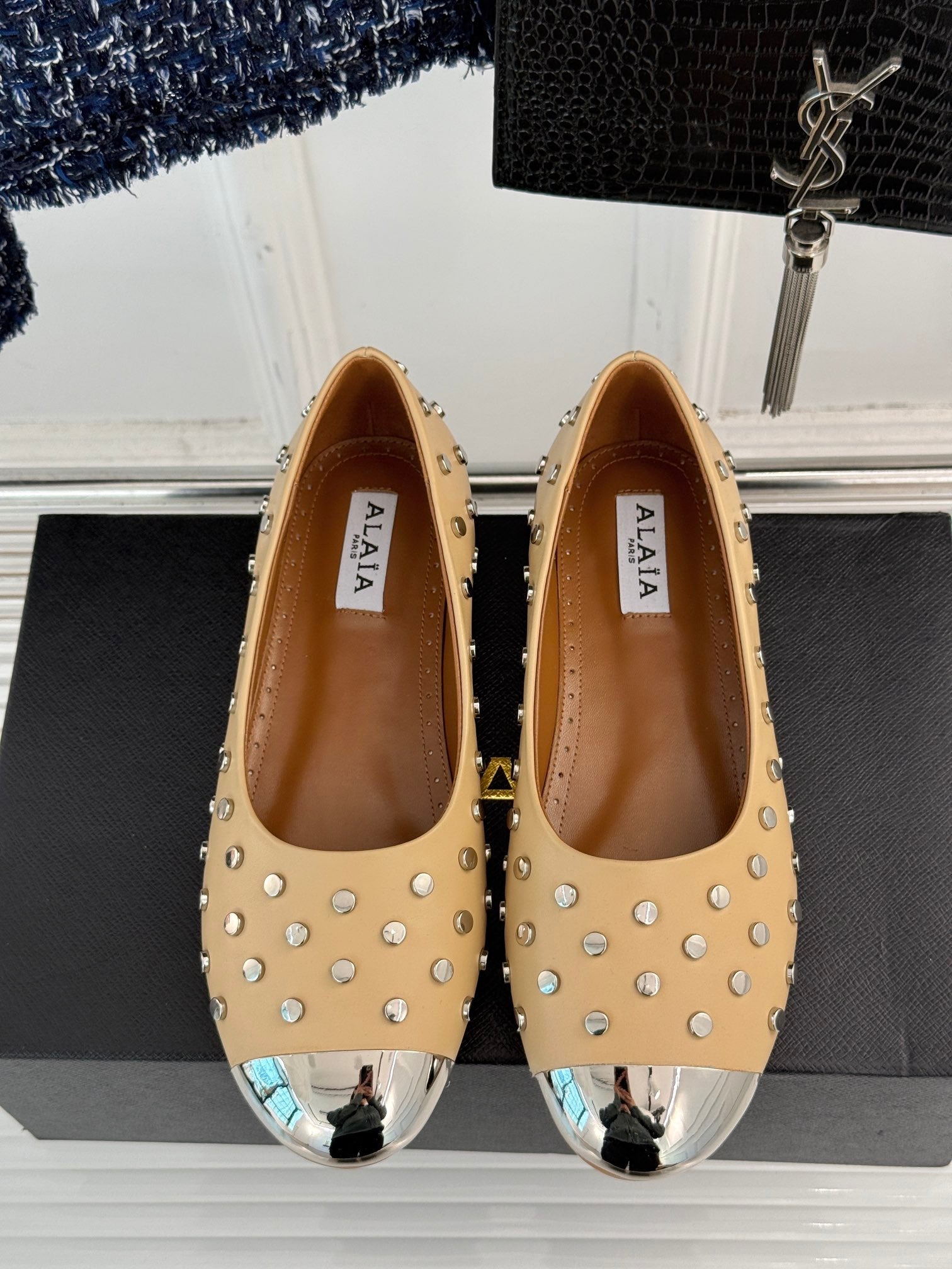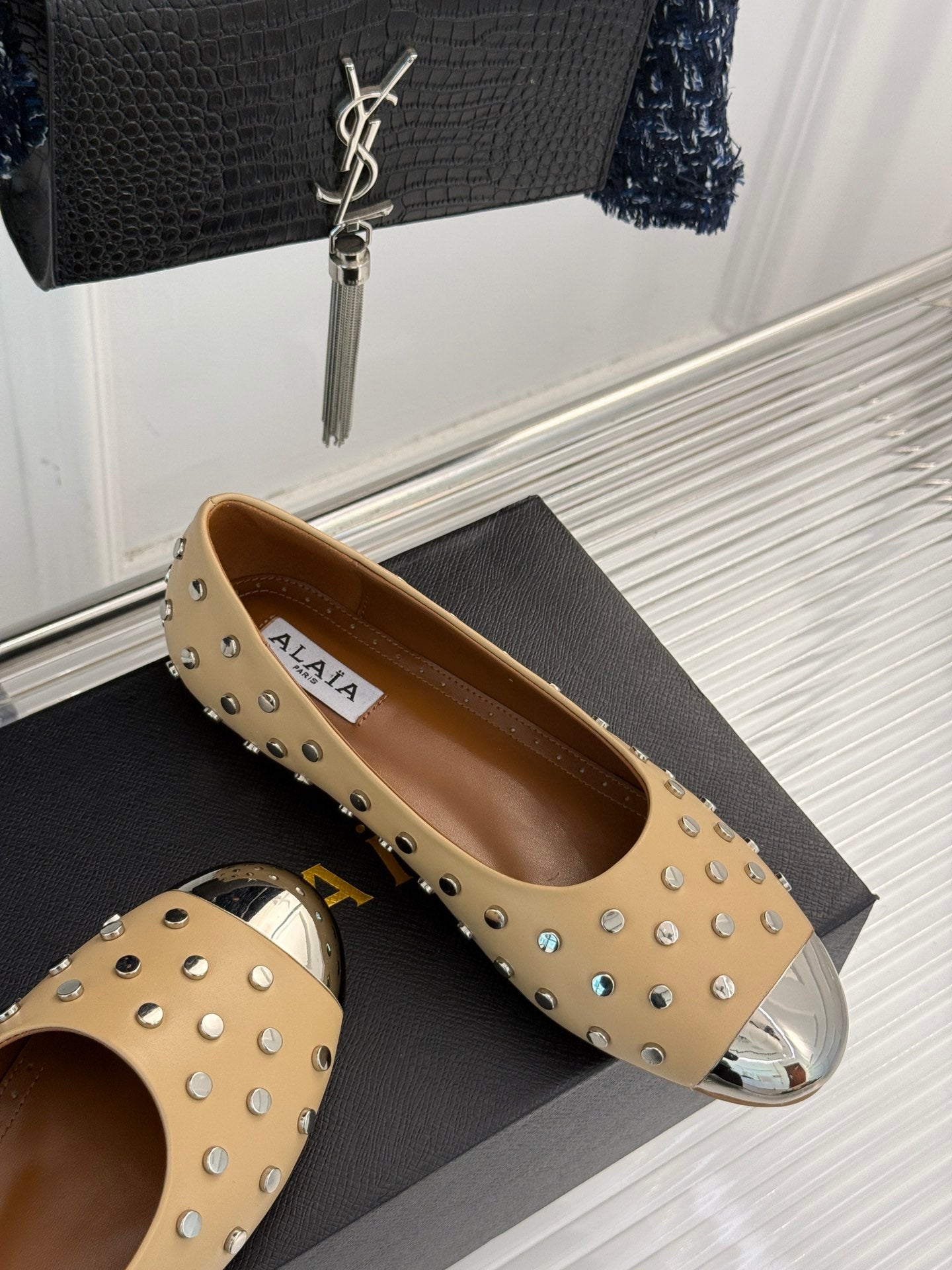 STUD-EMBELLISHED BALLET FLATS IN SEPIA TAN CALFSKIN