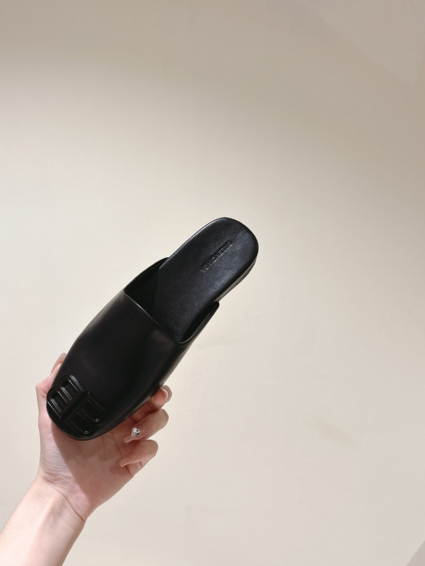 BLACK SHINY LAMBSKIN SQUARE TOE FLAT MULES BLACK BUCKLE