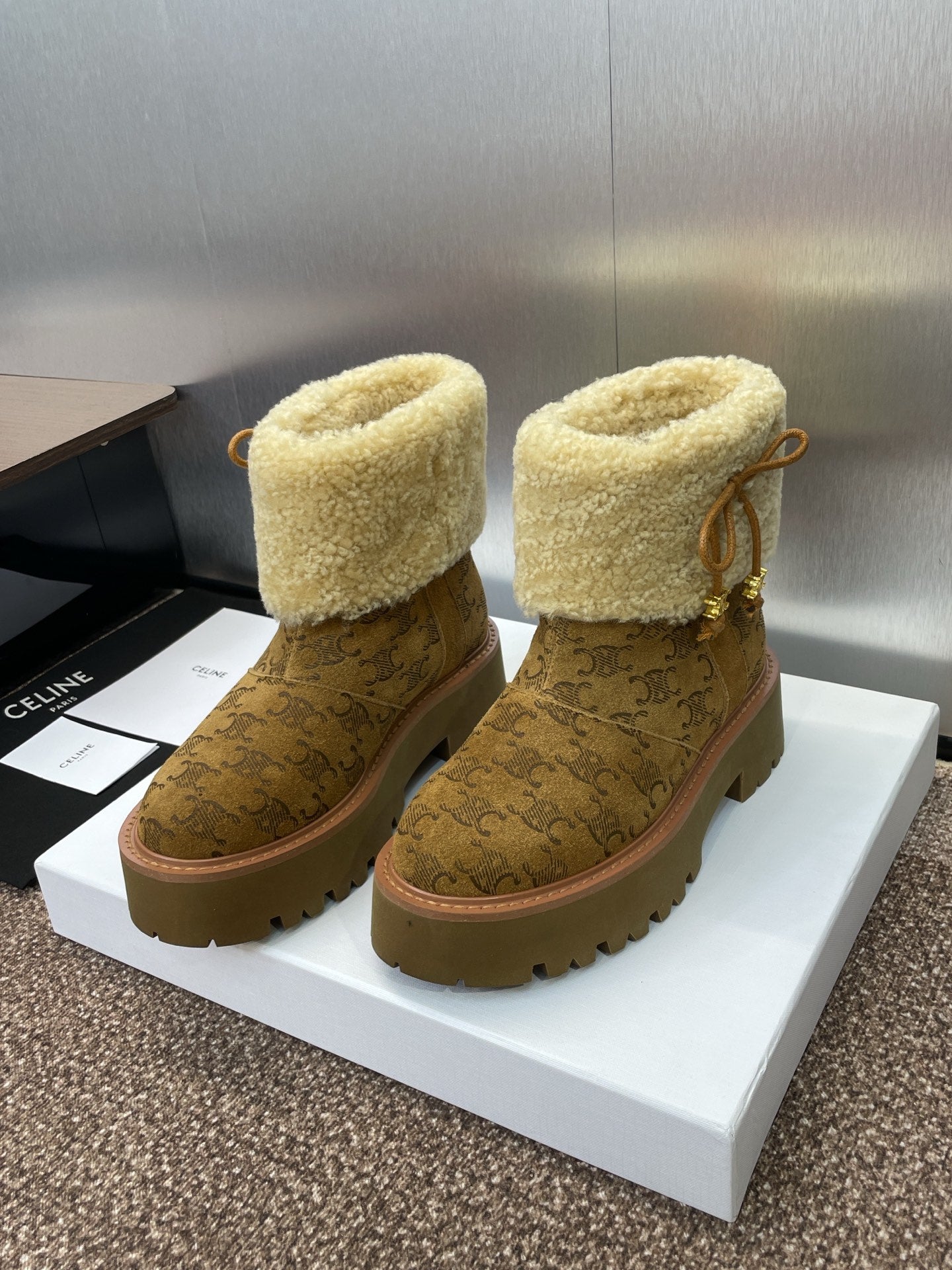 CELINE 26S ANKLE BOOTS 45 MM IN BROWN SUEDE AND BEIGE WOOL