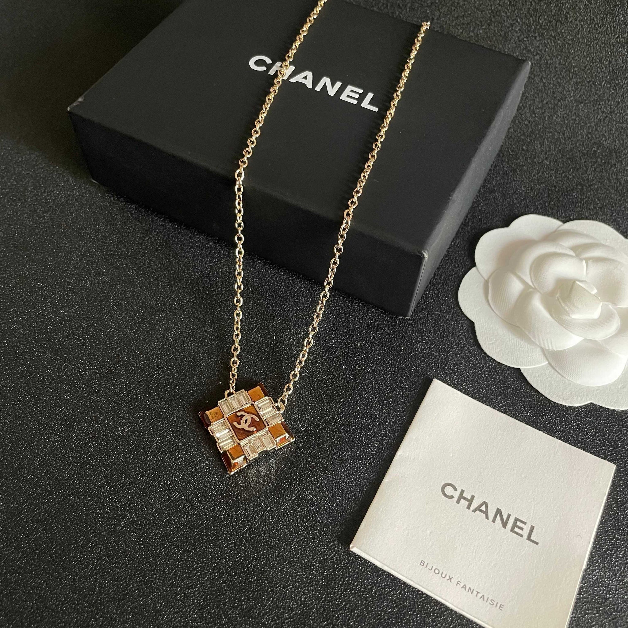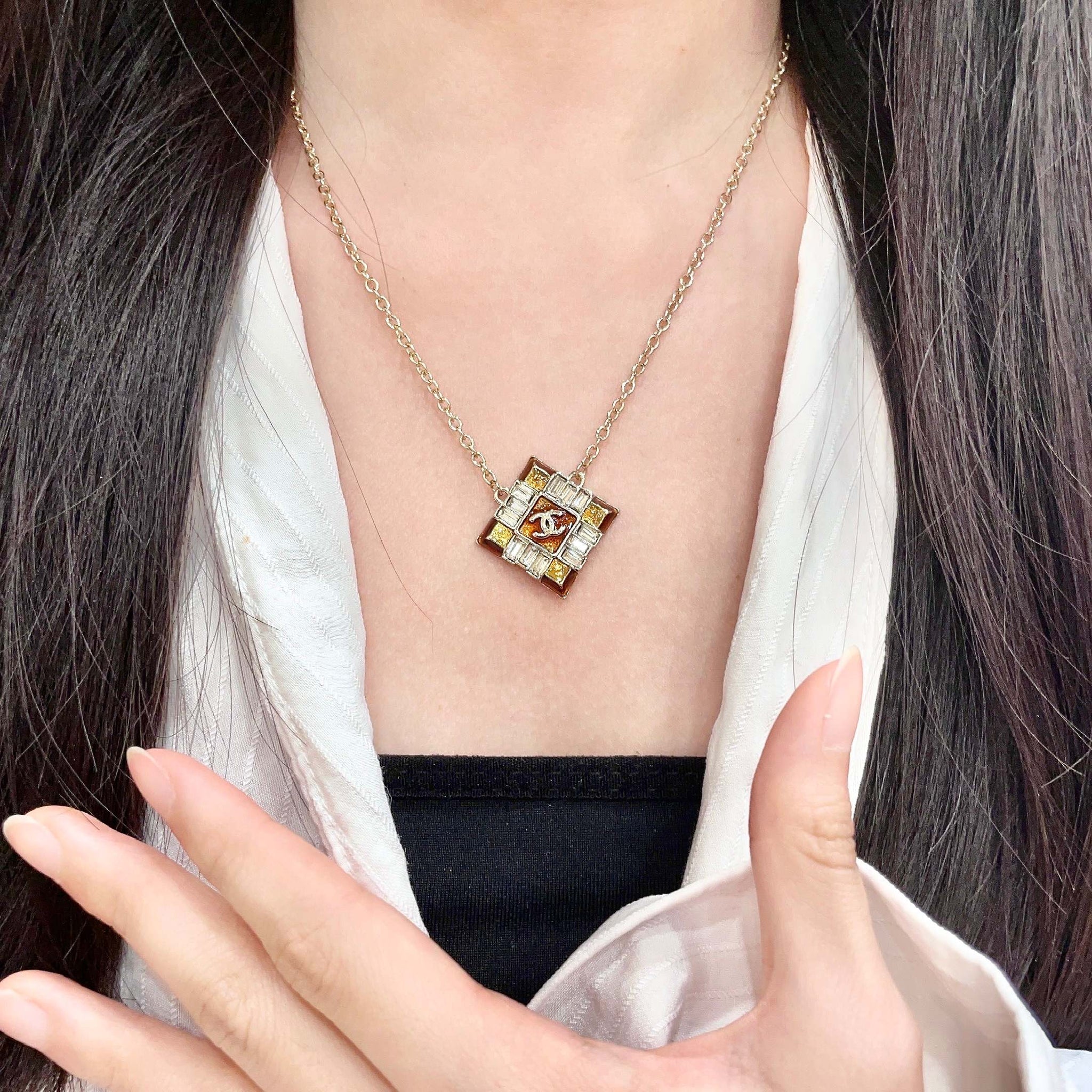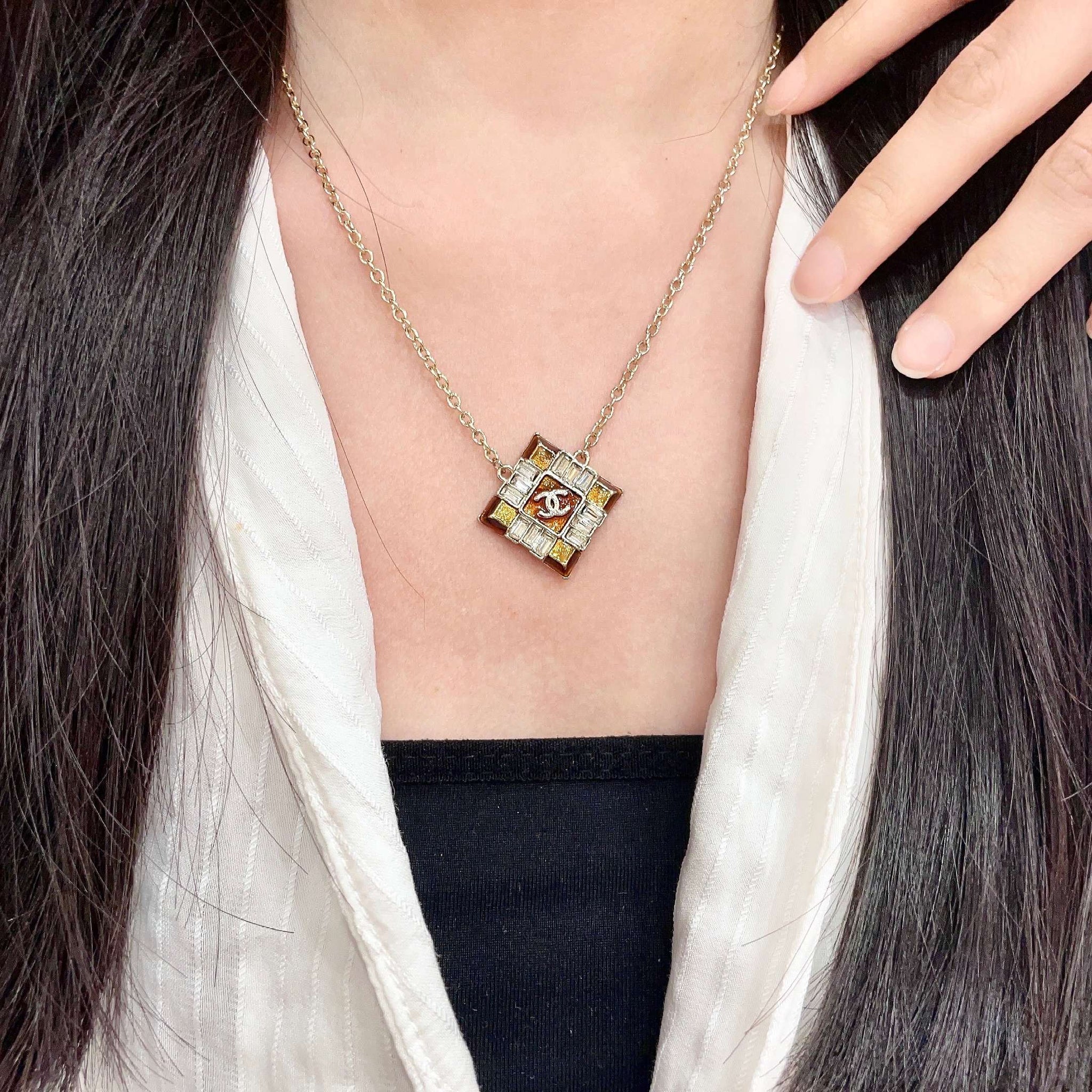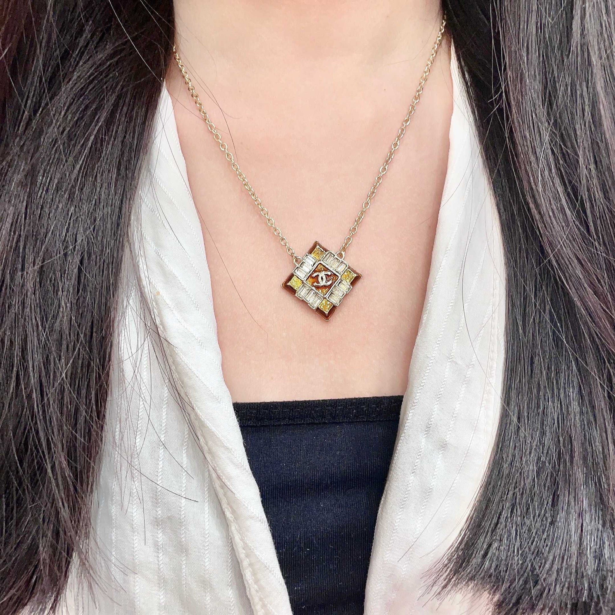 CHANEL 26S DOUBLE C LOGO AMBER CRYSTAL SQUARE PENDANT NECKLACE IN GOLD METAL 633294