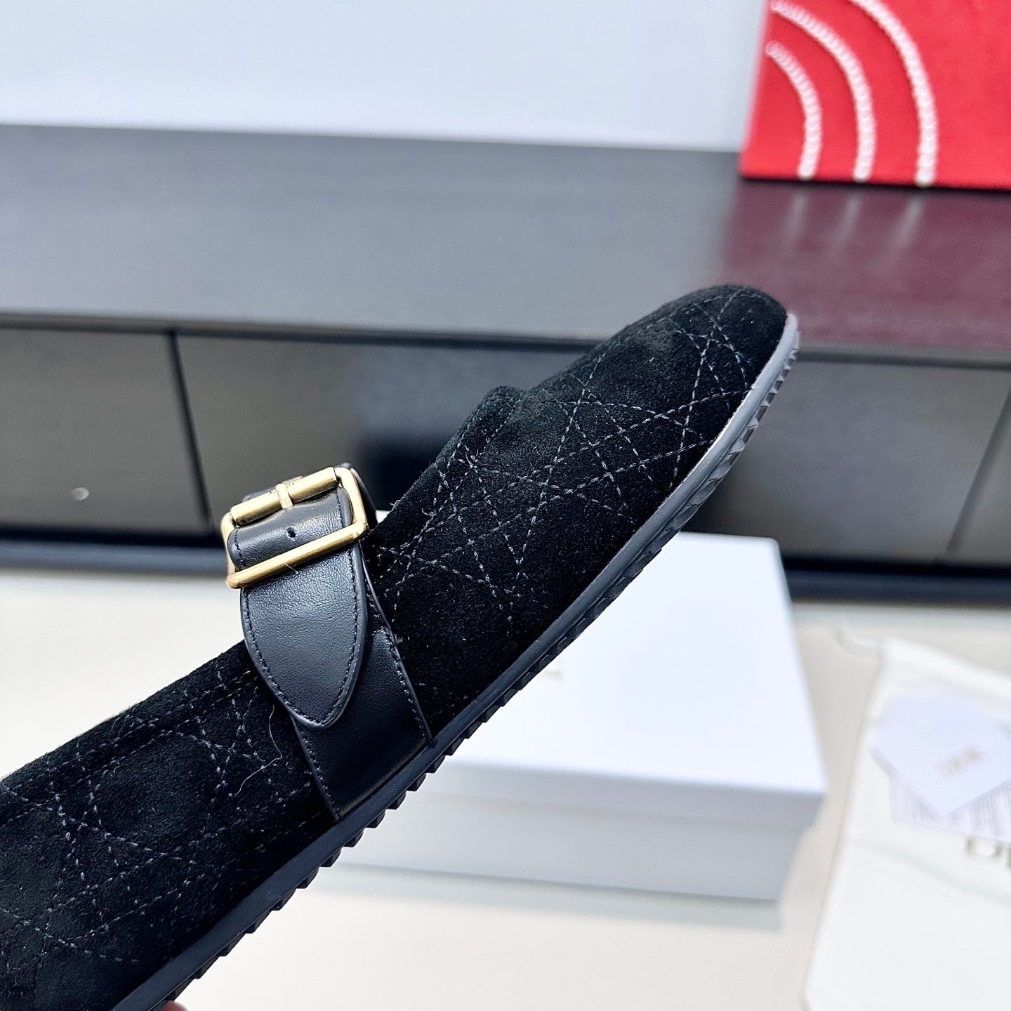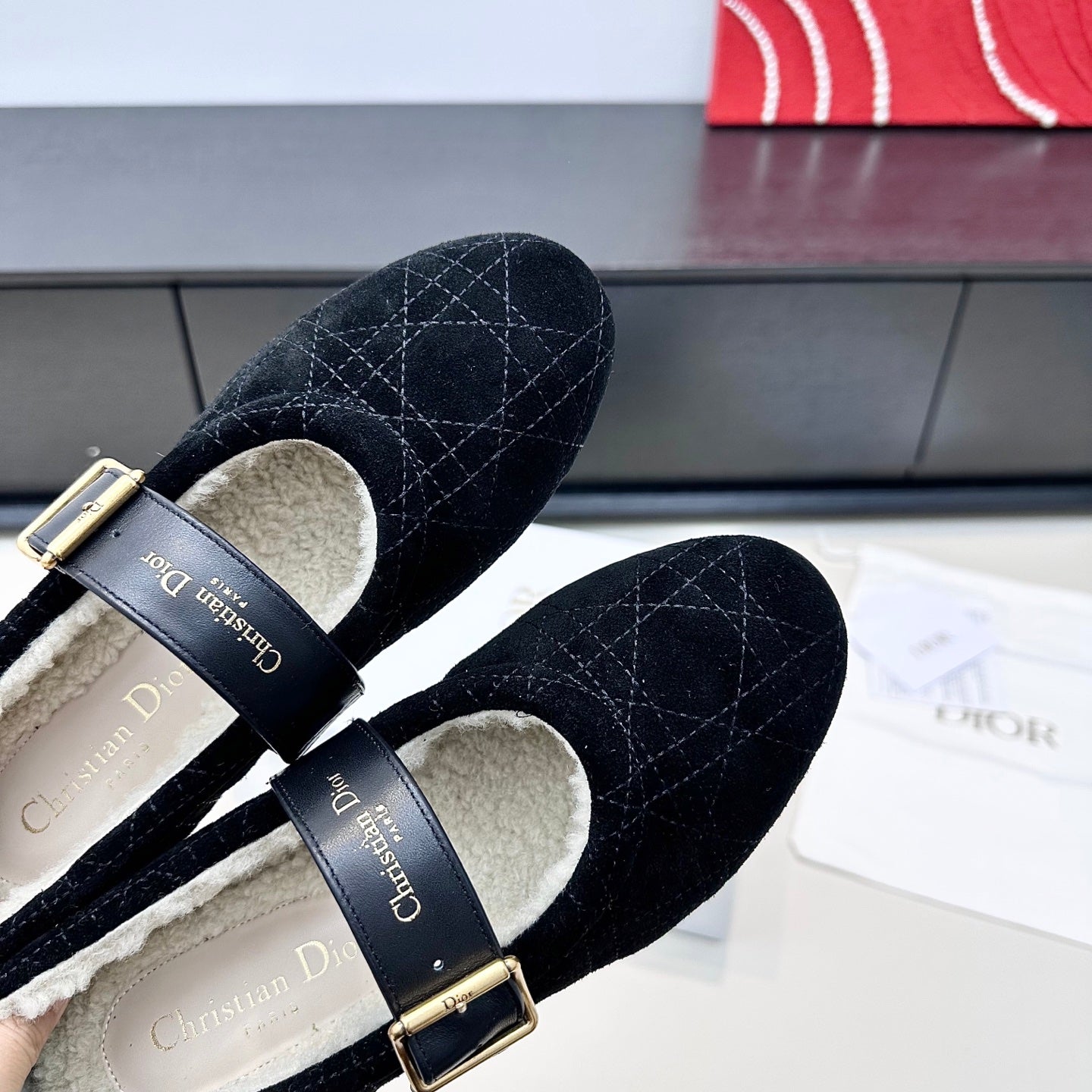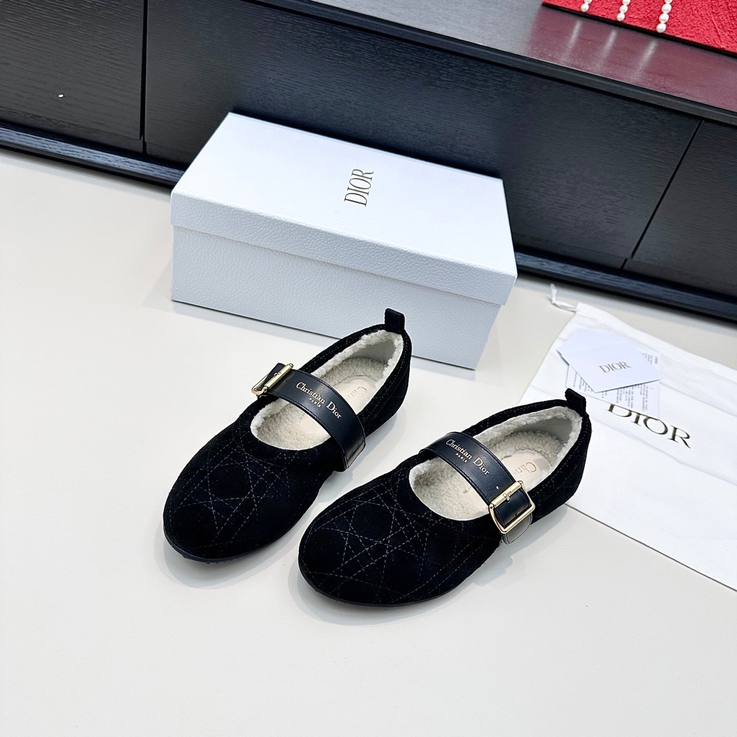 DIOR 26S FROST BALLET FLAT IN BLACK CANNAGE SUEDE AND CALFSKIN