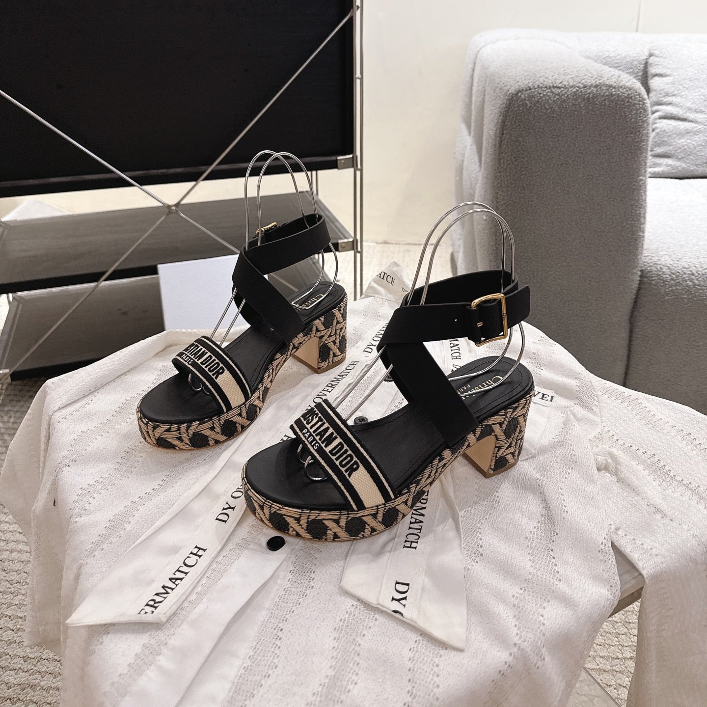 DIORACT SANDALS IN BLACK AND BEIGE EMBROIDERY AND CALFSKIN
