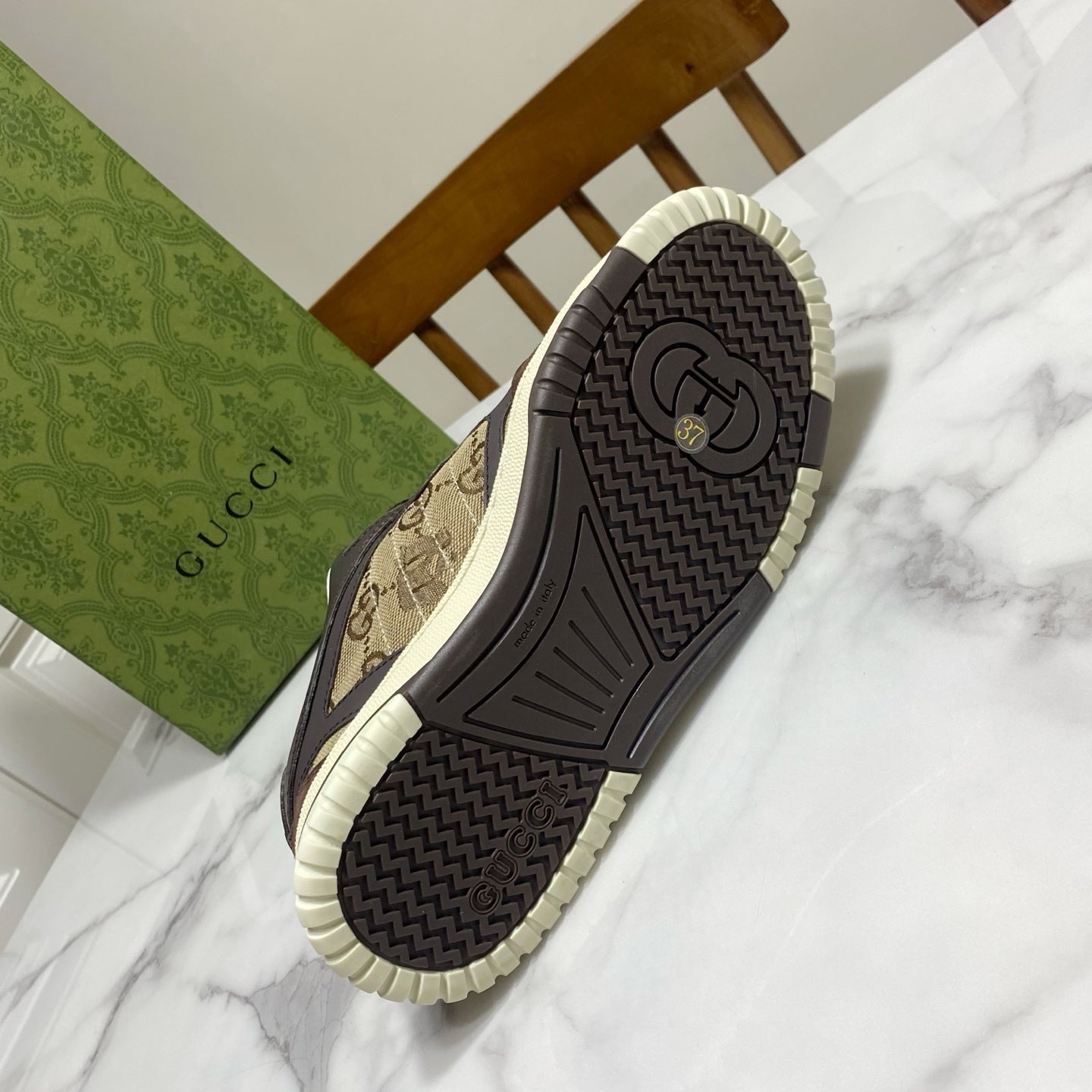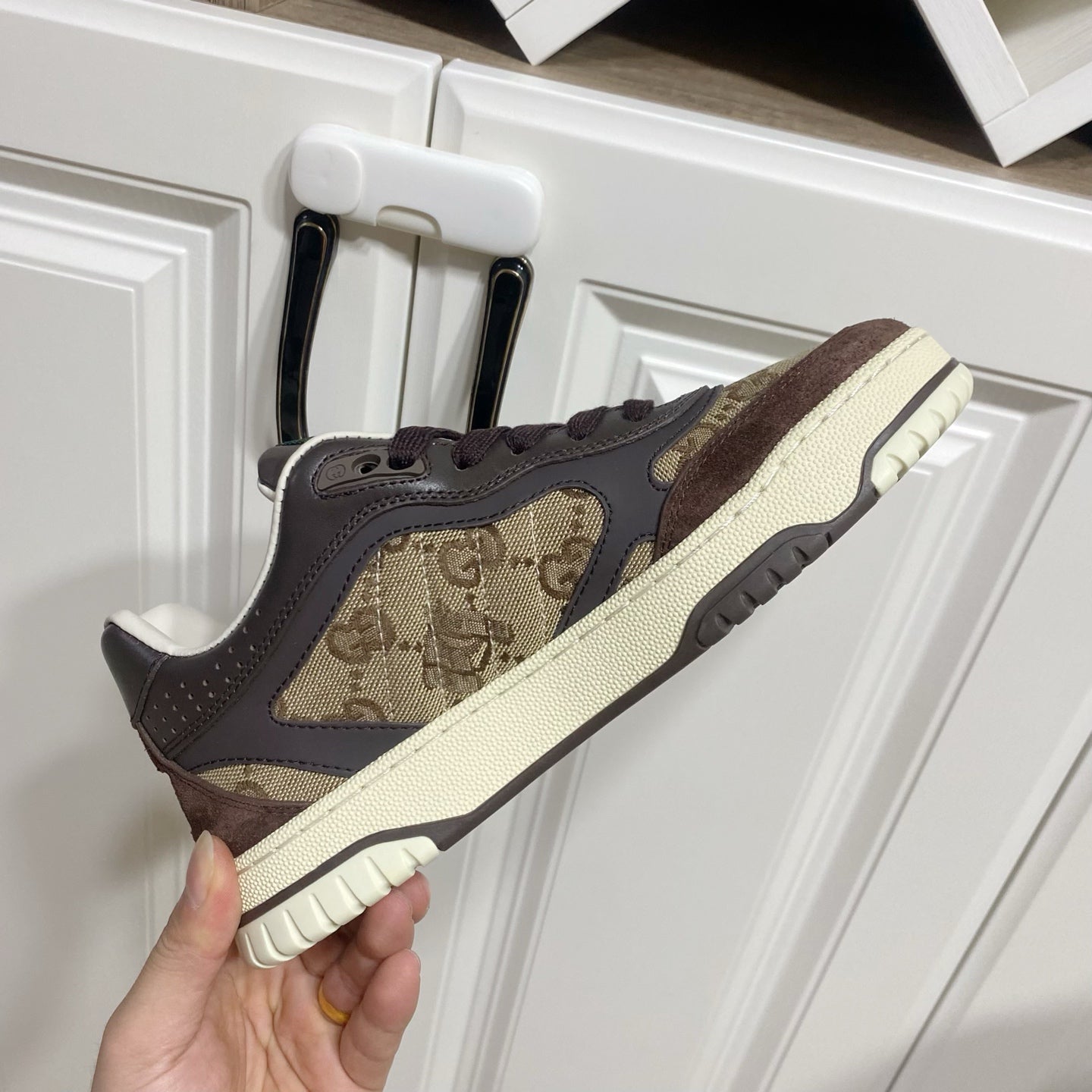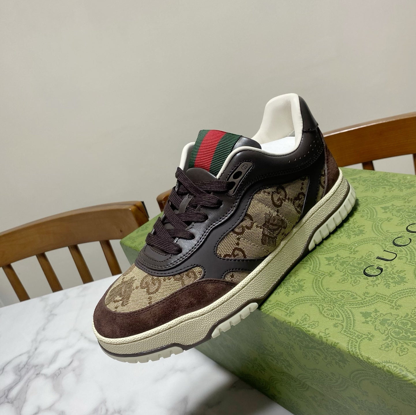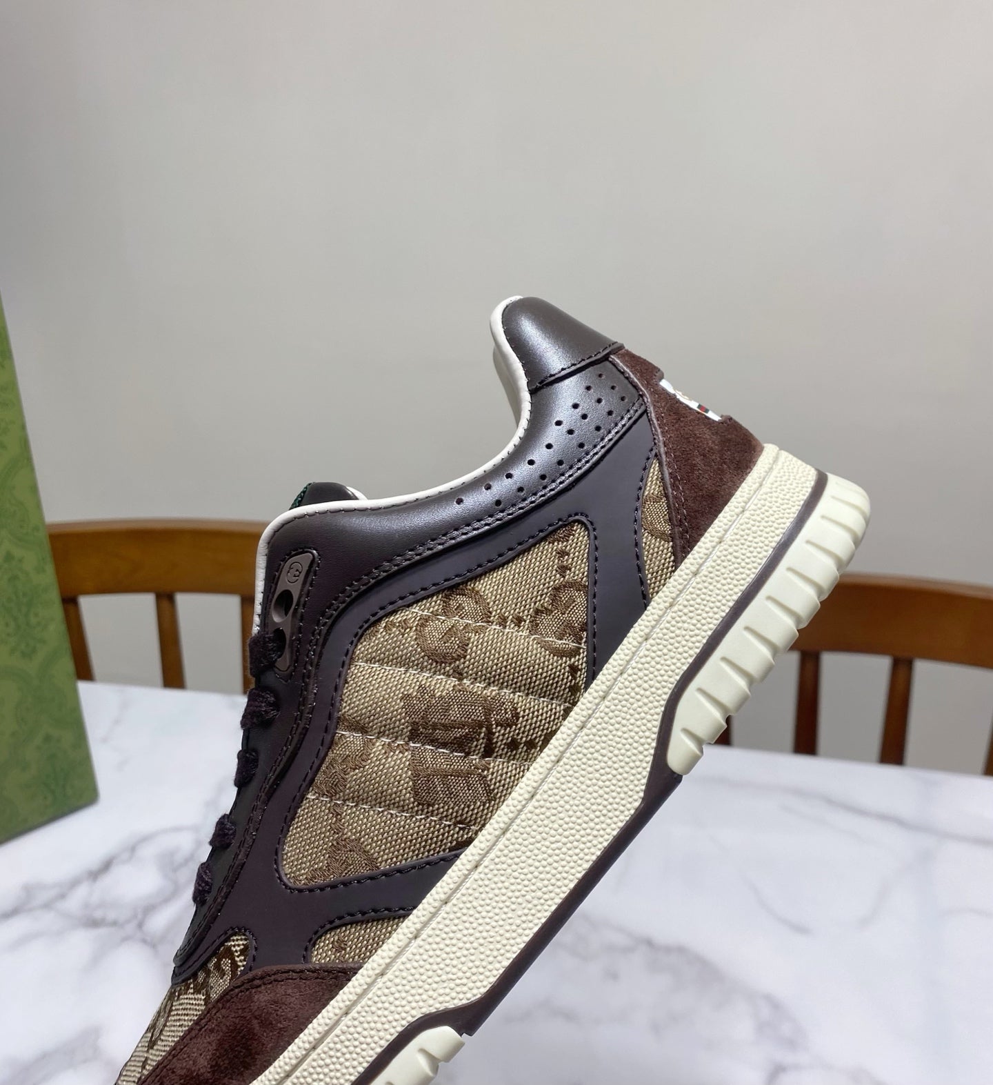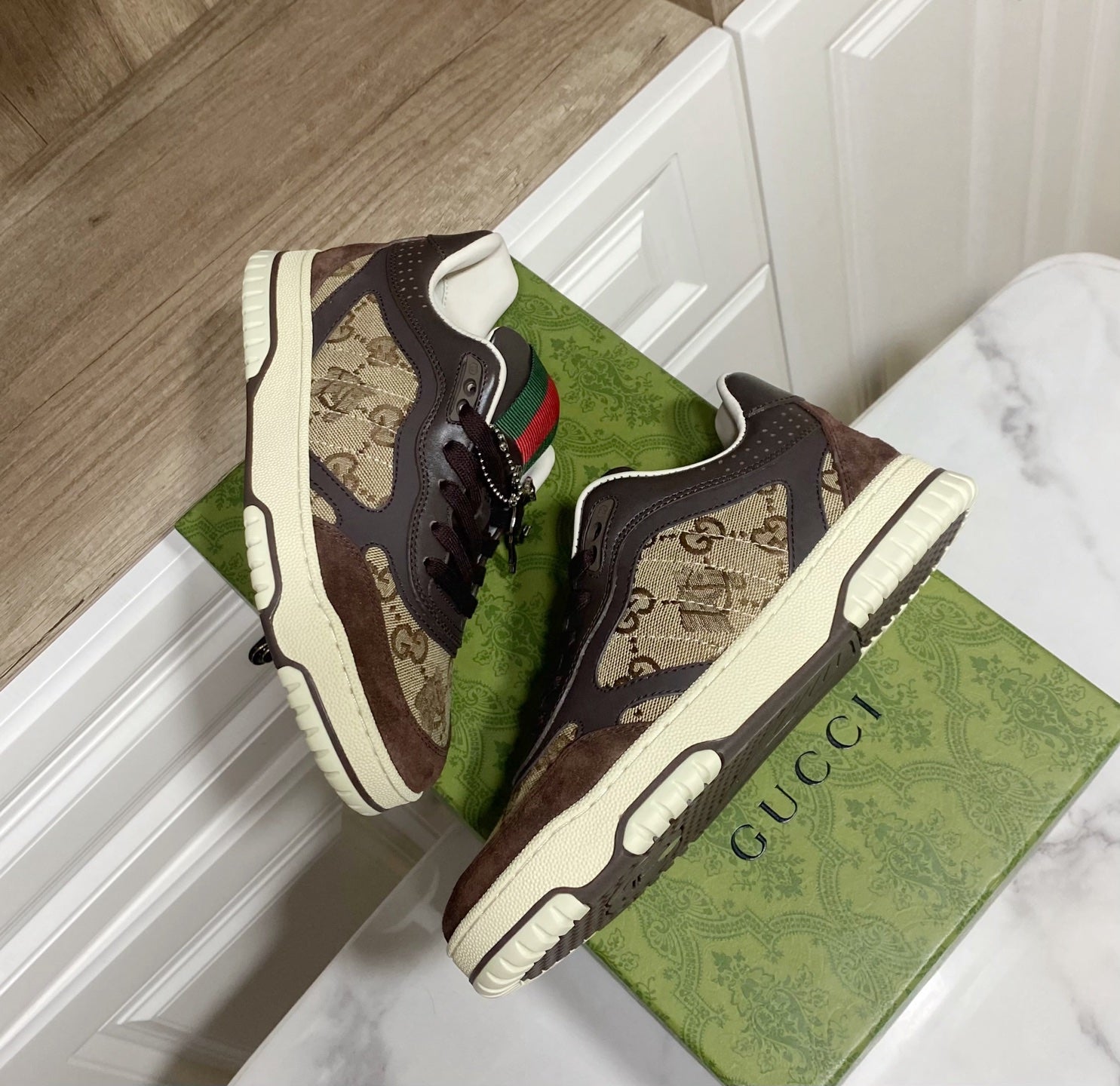 GUCCI 26S RE-WEB TRAINER SNEAKERS IN BROWN CALFSKIN AND BEIGE CANVAS