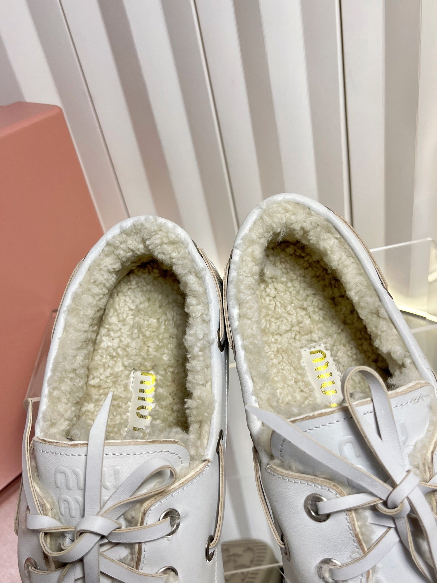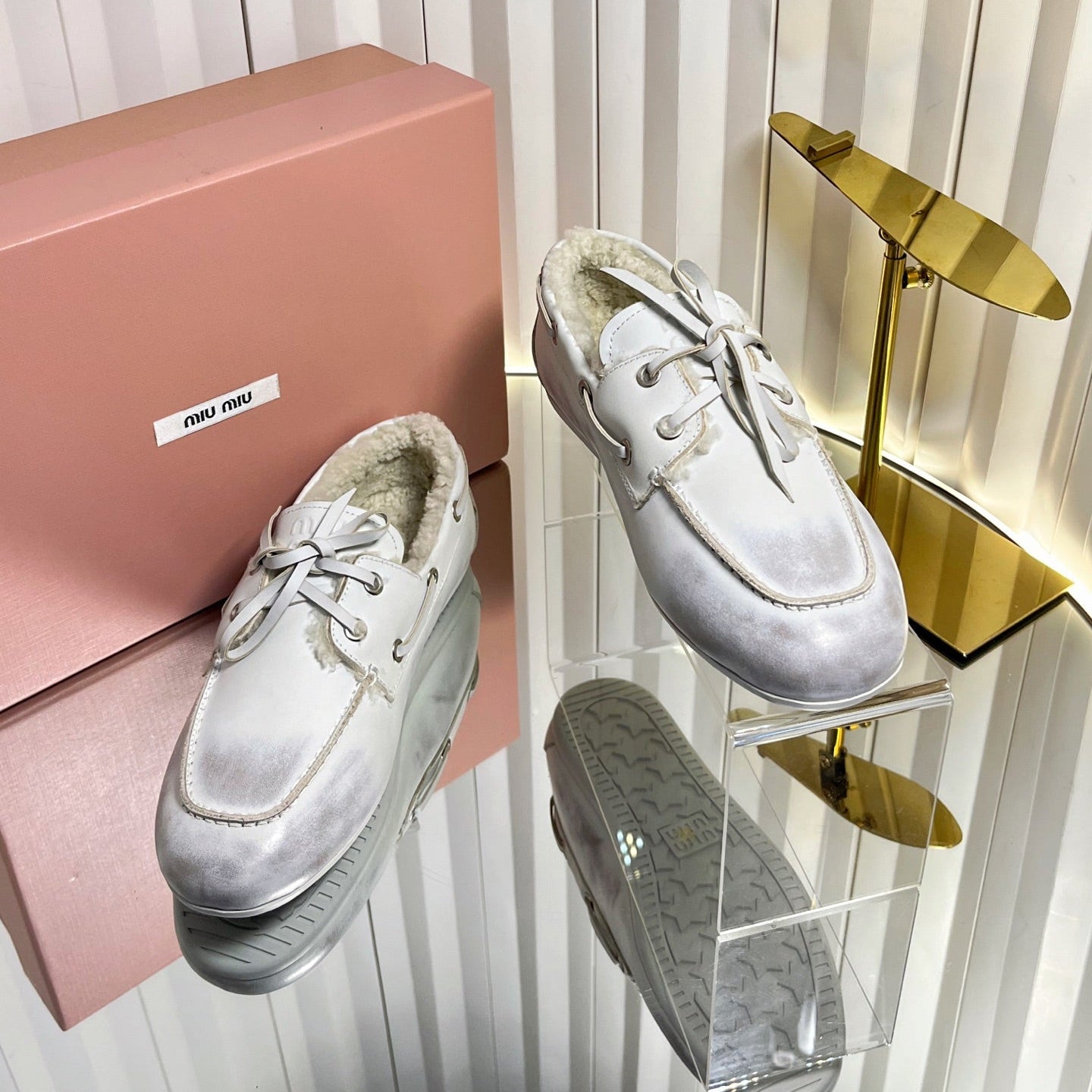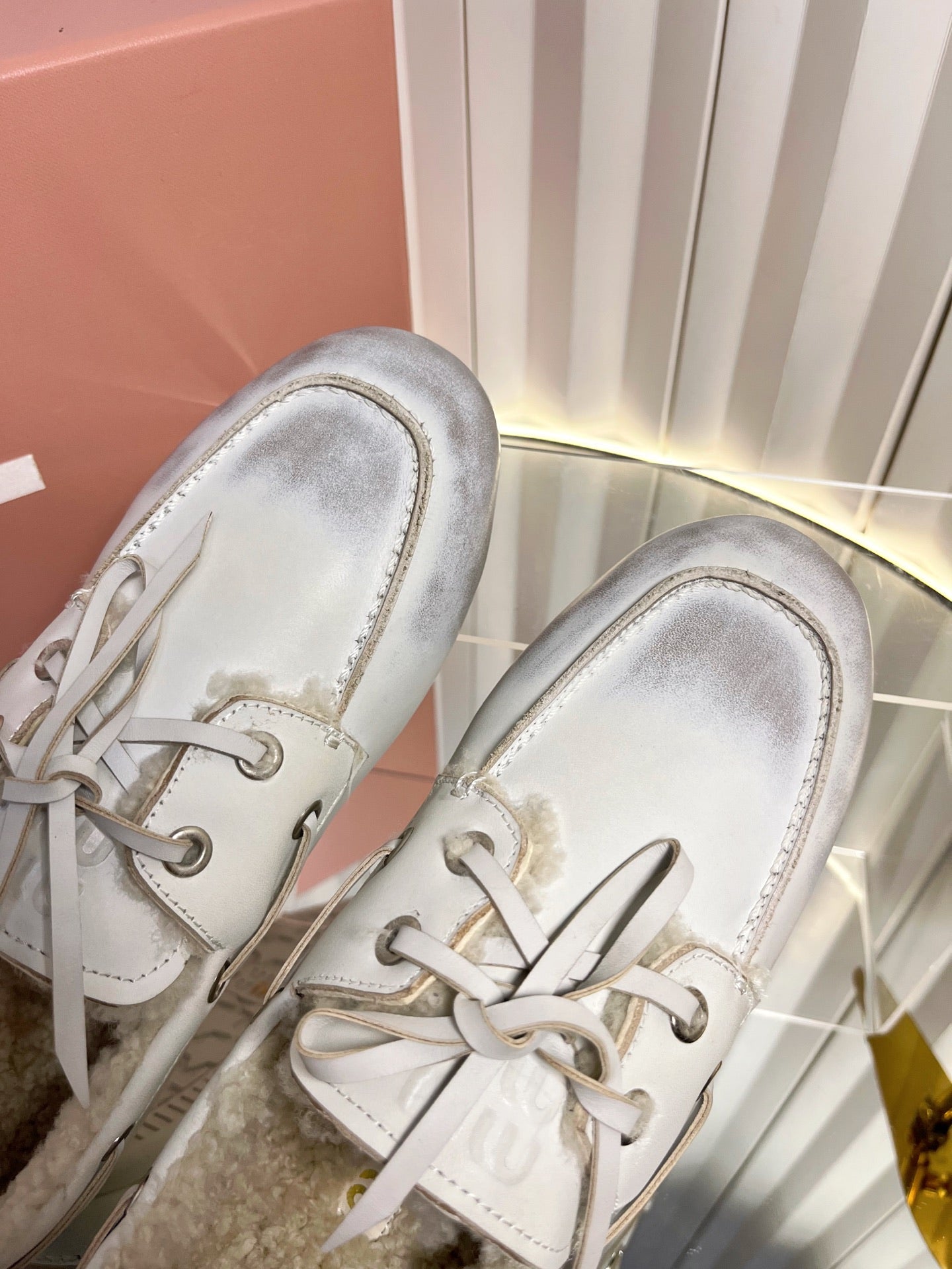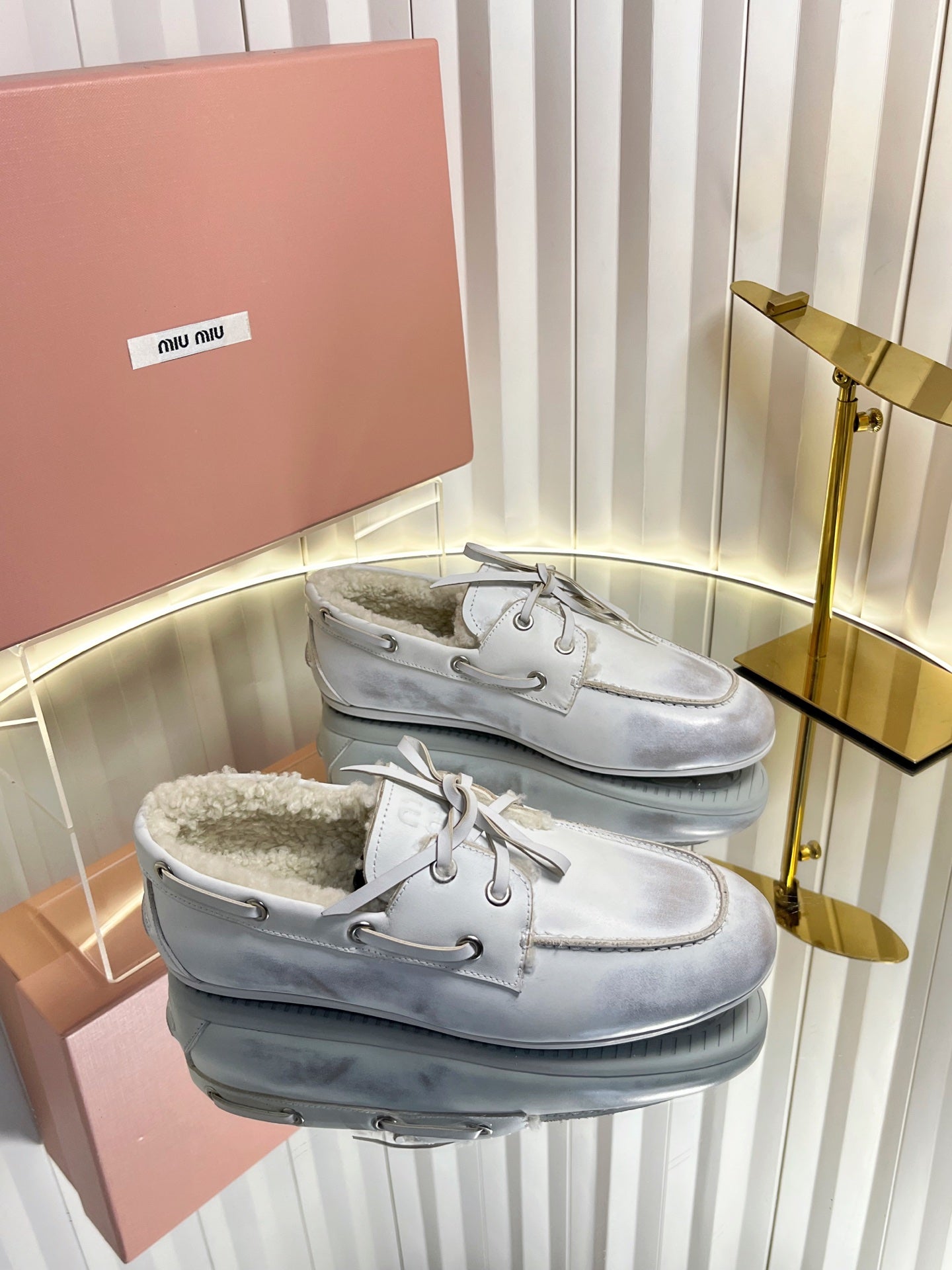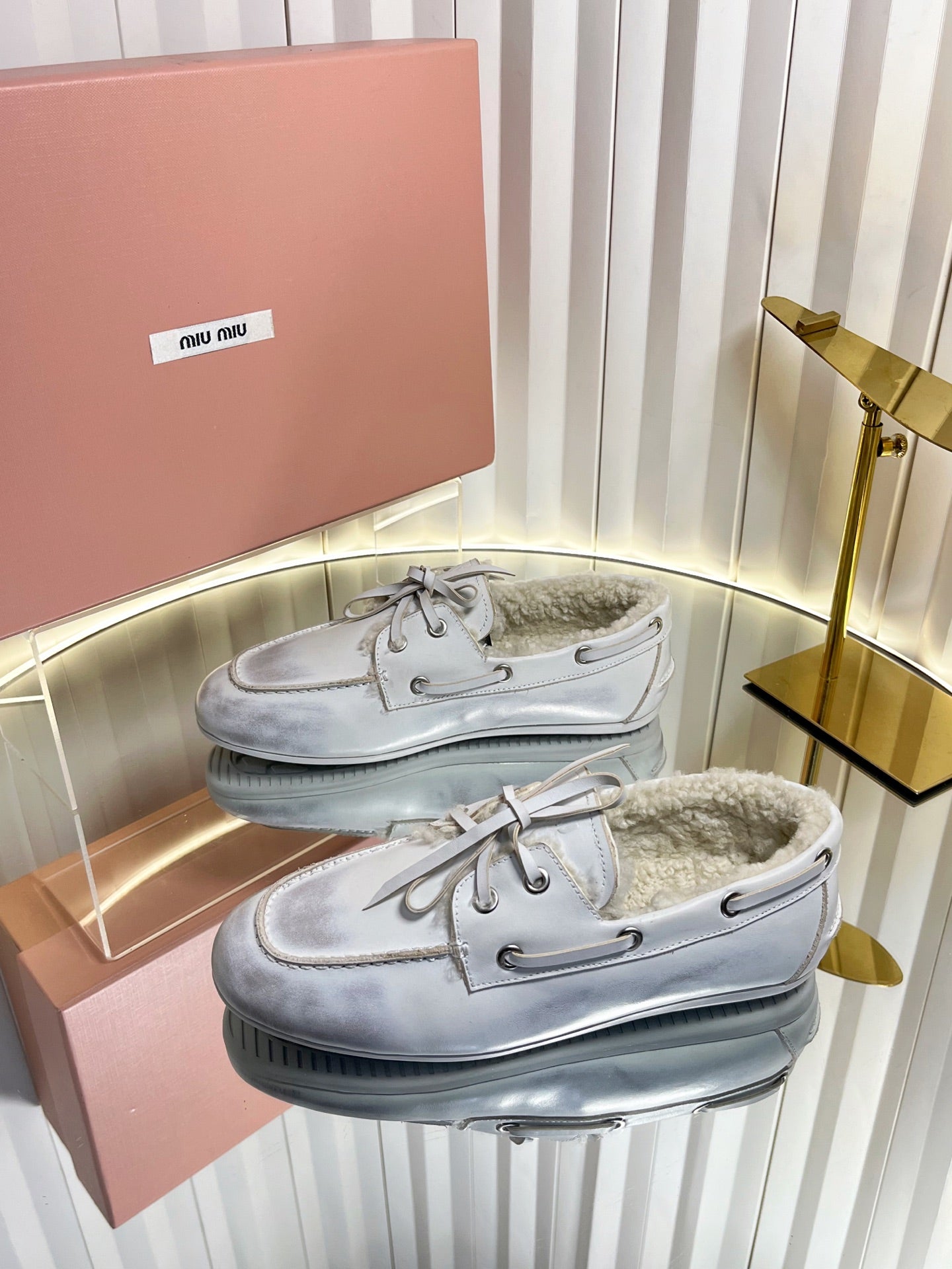 MIUMIU 26S FUR BOAT SHOES IN LIGHT GRAY CALFSKIN