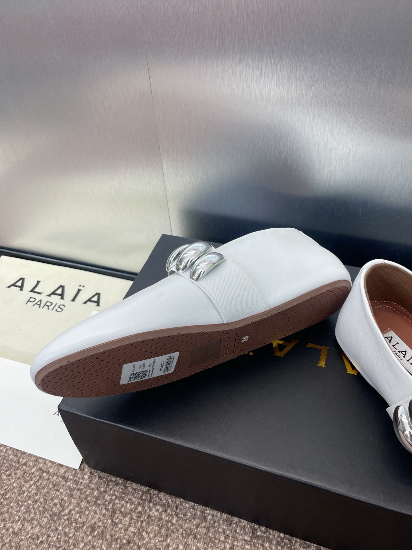 ALAIA MARY JANE FLATS 25S IN WHITE CALFSKIN WITH SILVER HARDWARE
