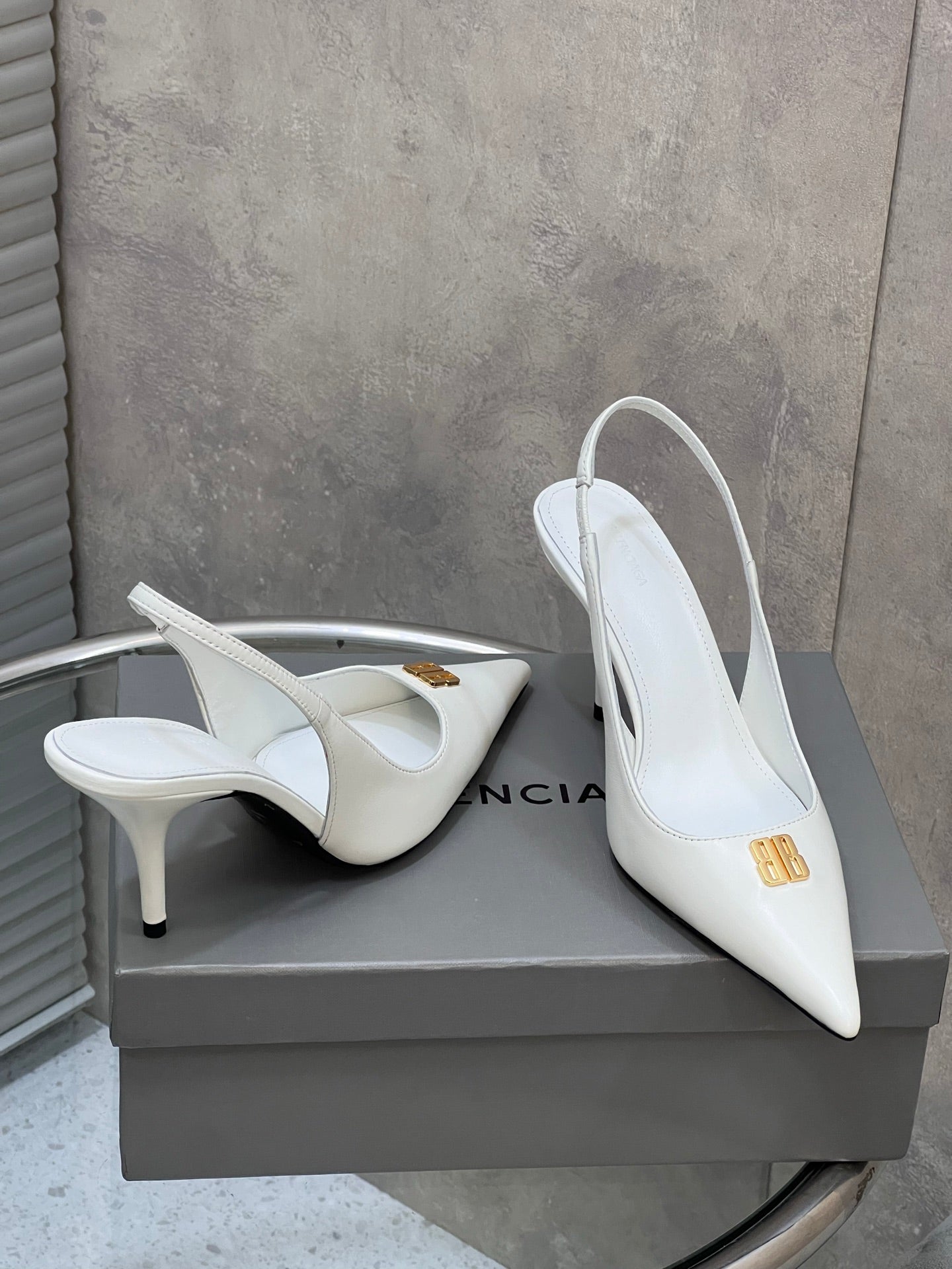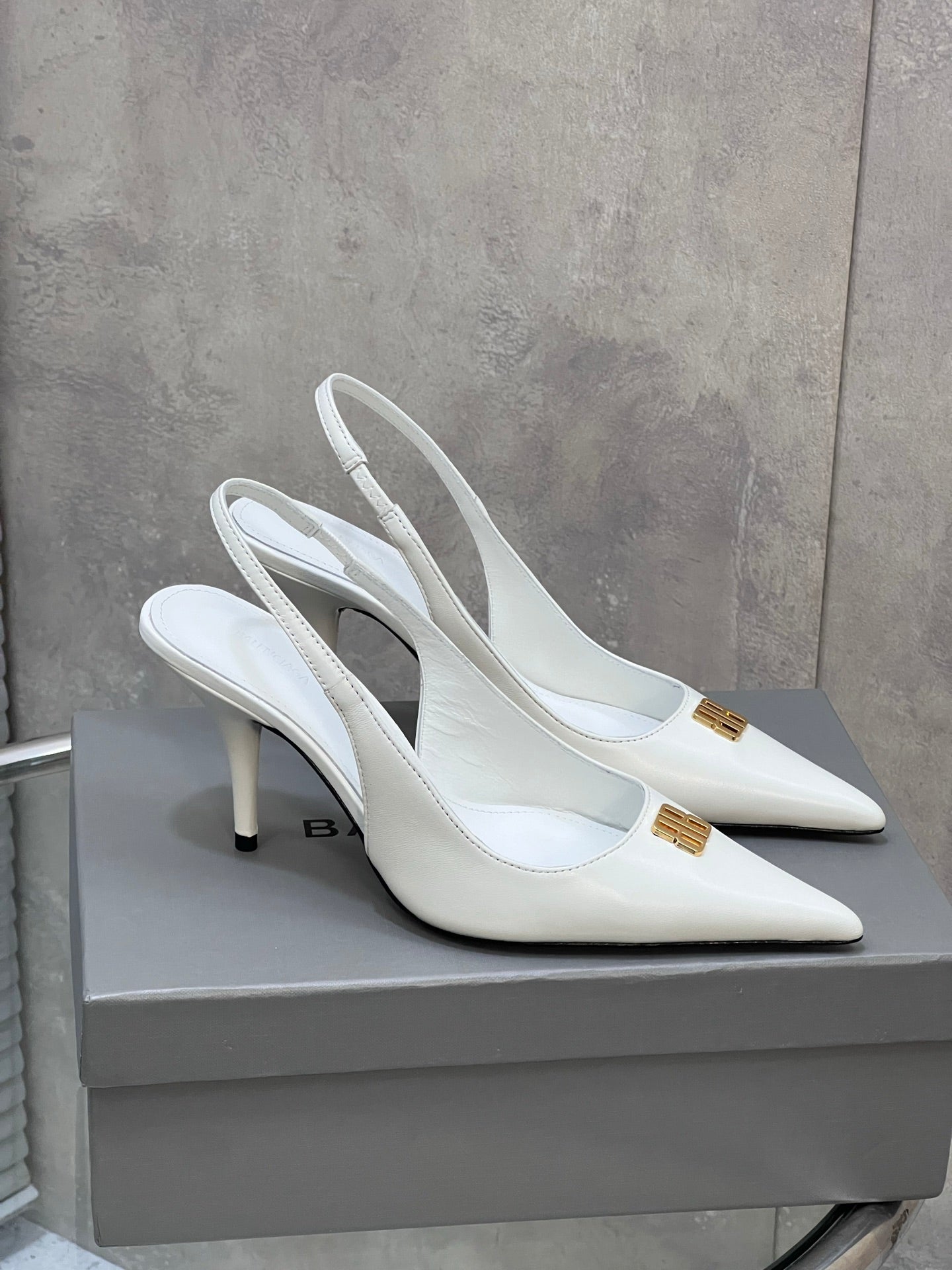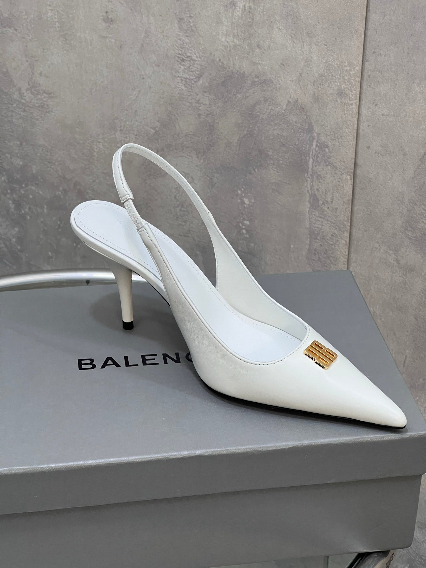 BALENCIAGA 25S HIGH-HEEL SLINGBACK 85 MM IN WHITE COW LEATHER WITH GOLD HARDWARE