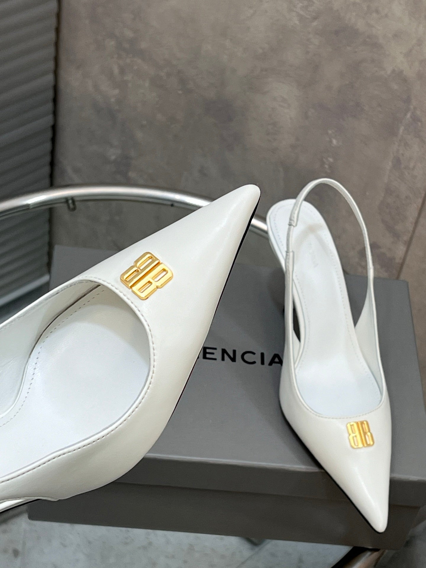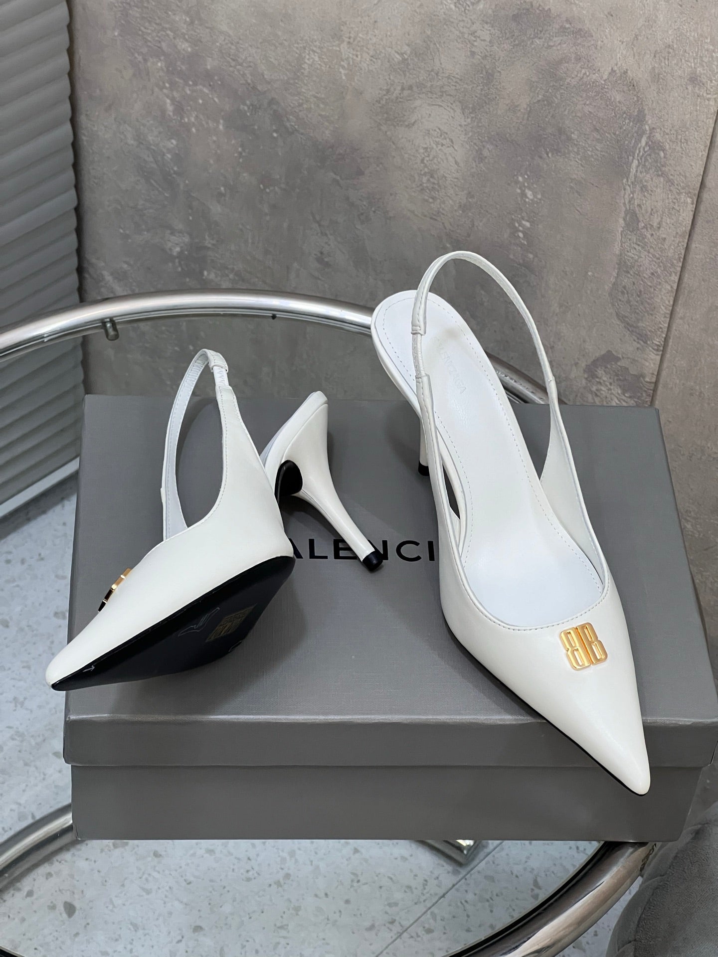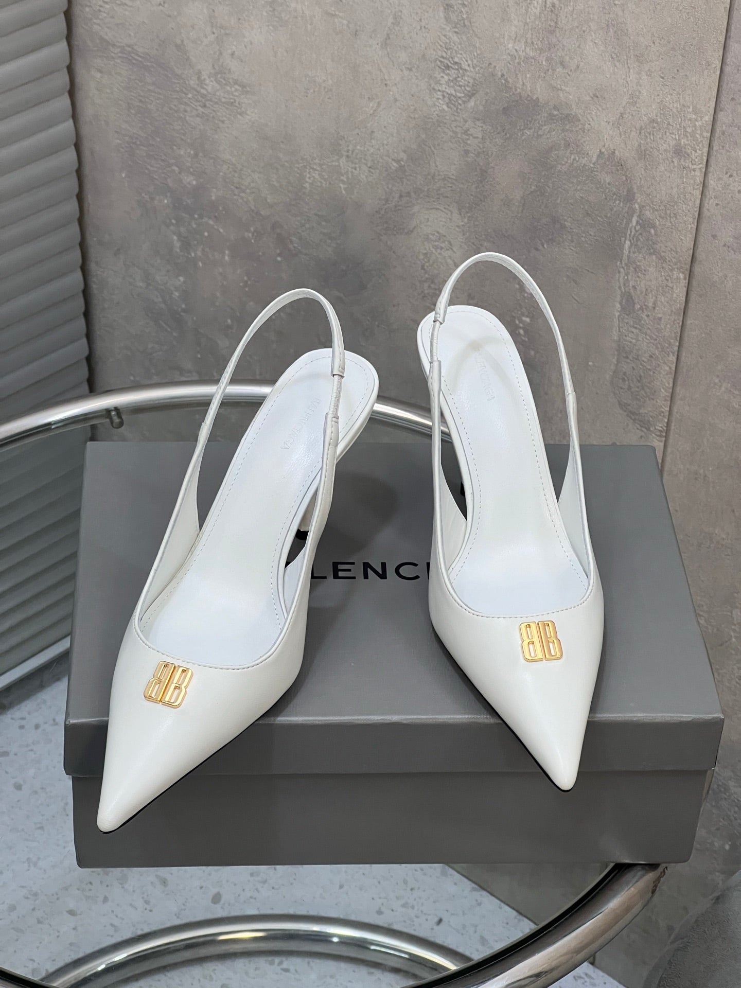 BALENCIAGA 25S HIGH-HEEL SLINGBACK 85 MM IN WHITE COW LEATHER WITH GOLD HARDWARE