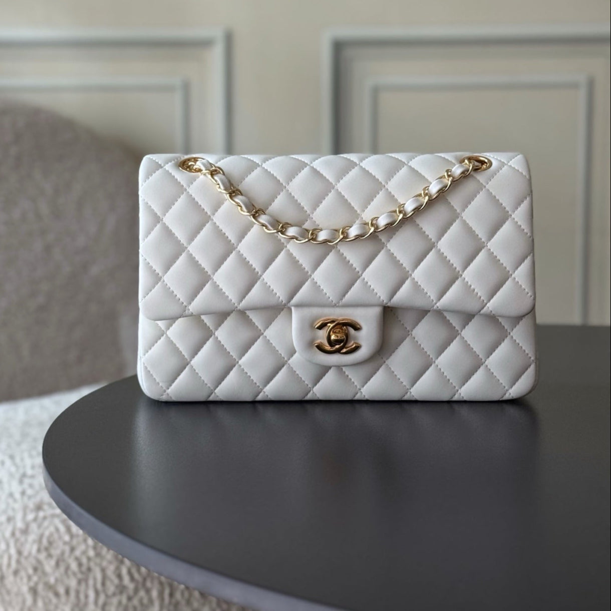 CHANEL 25S CLASSIC FLAP BAG 25 CM IN WHITE LAMBSKIN WITH GOLD HARDWARE