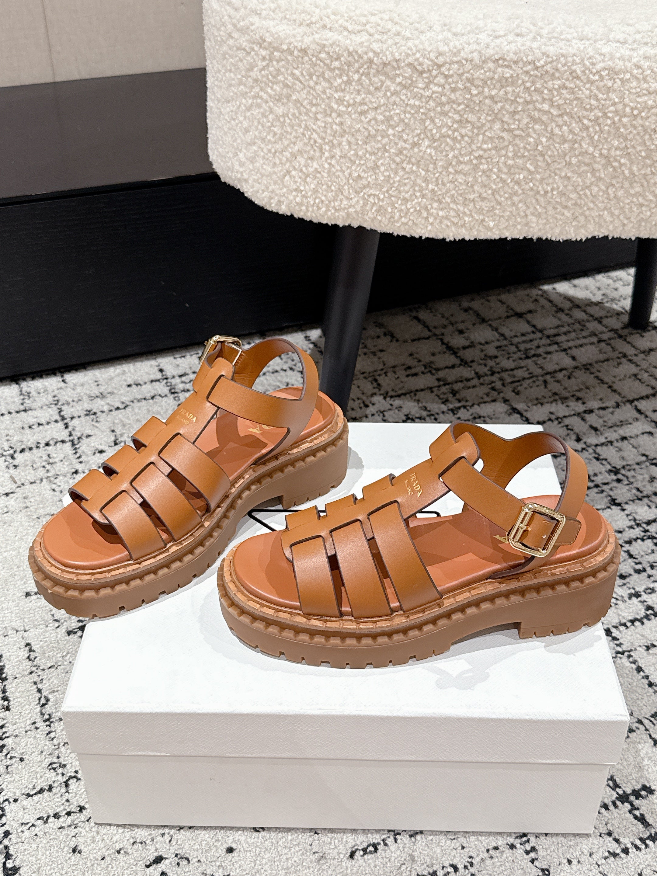 PRADA 25S FISHERMAN OPEN TOE SANDALS IN BURNT ORANGE CALFSKIN