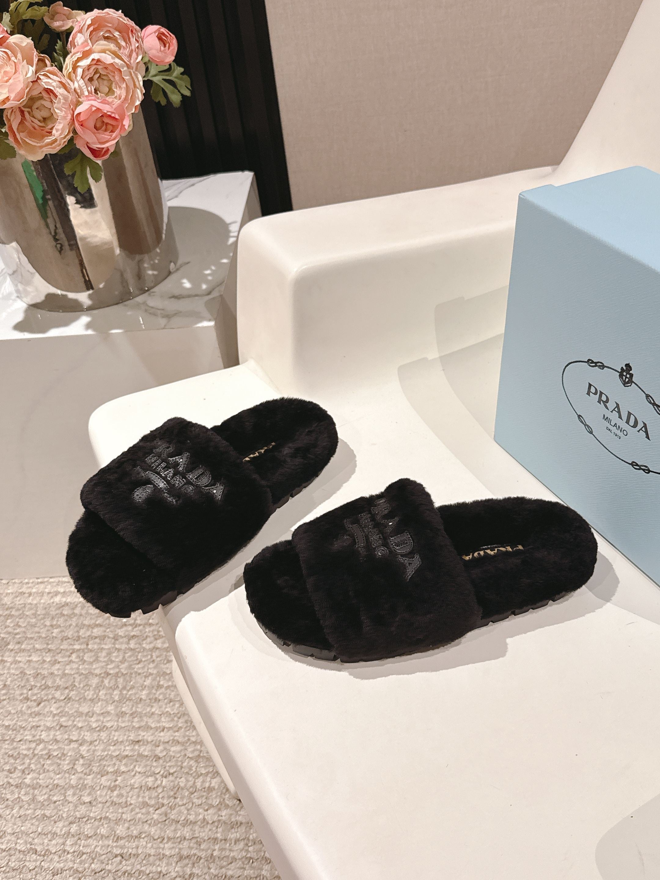 PRADA 25S FLAT MULES IN BLACK RABBIT FUR