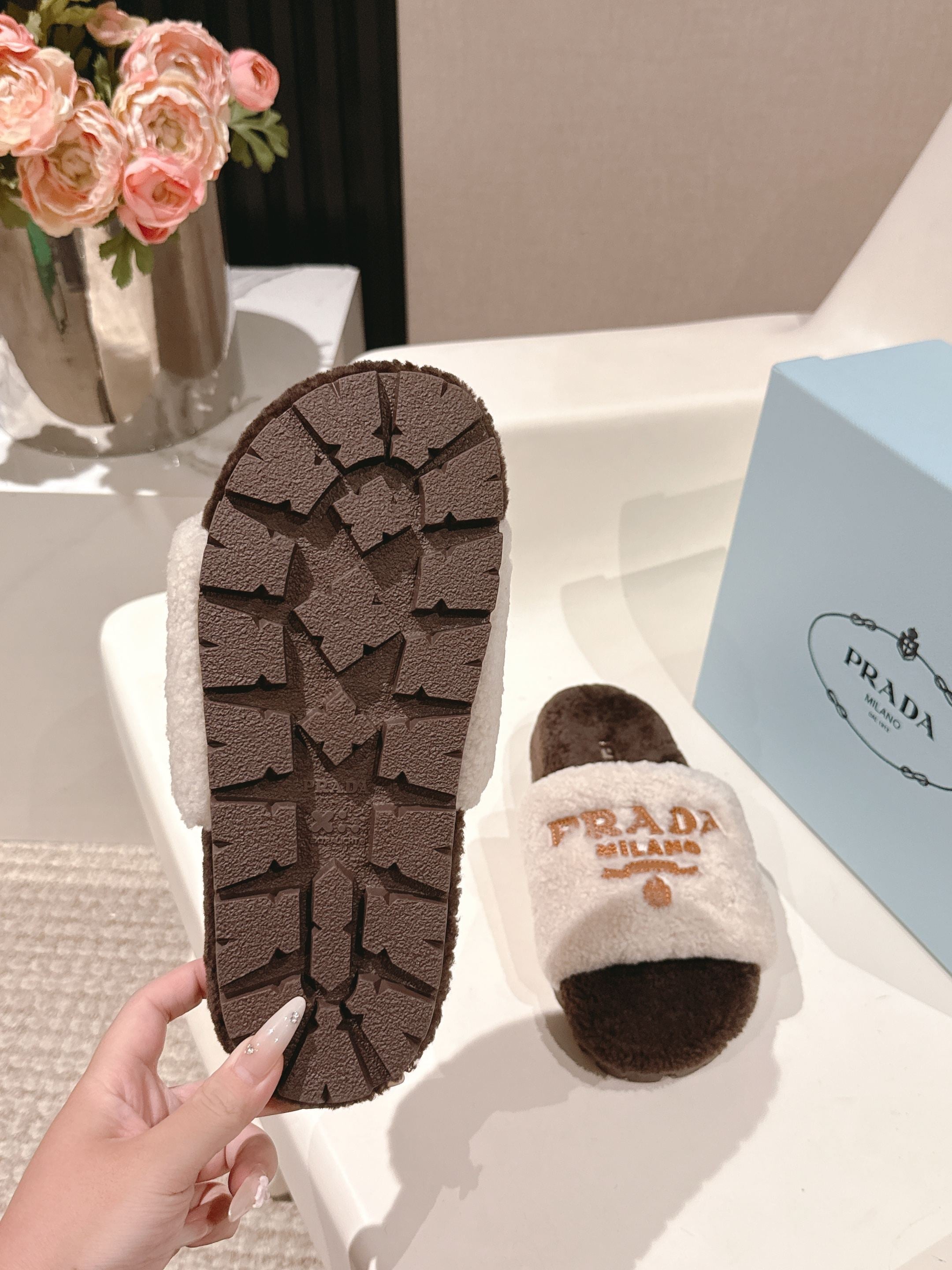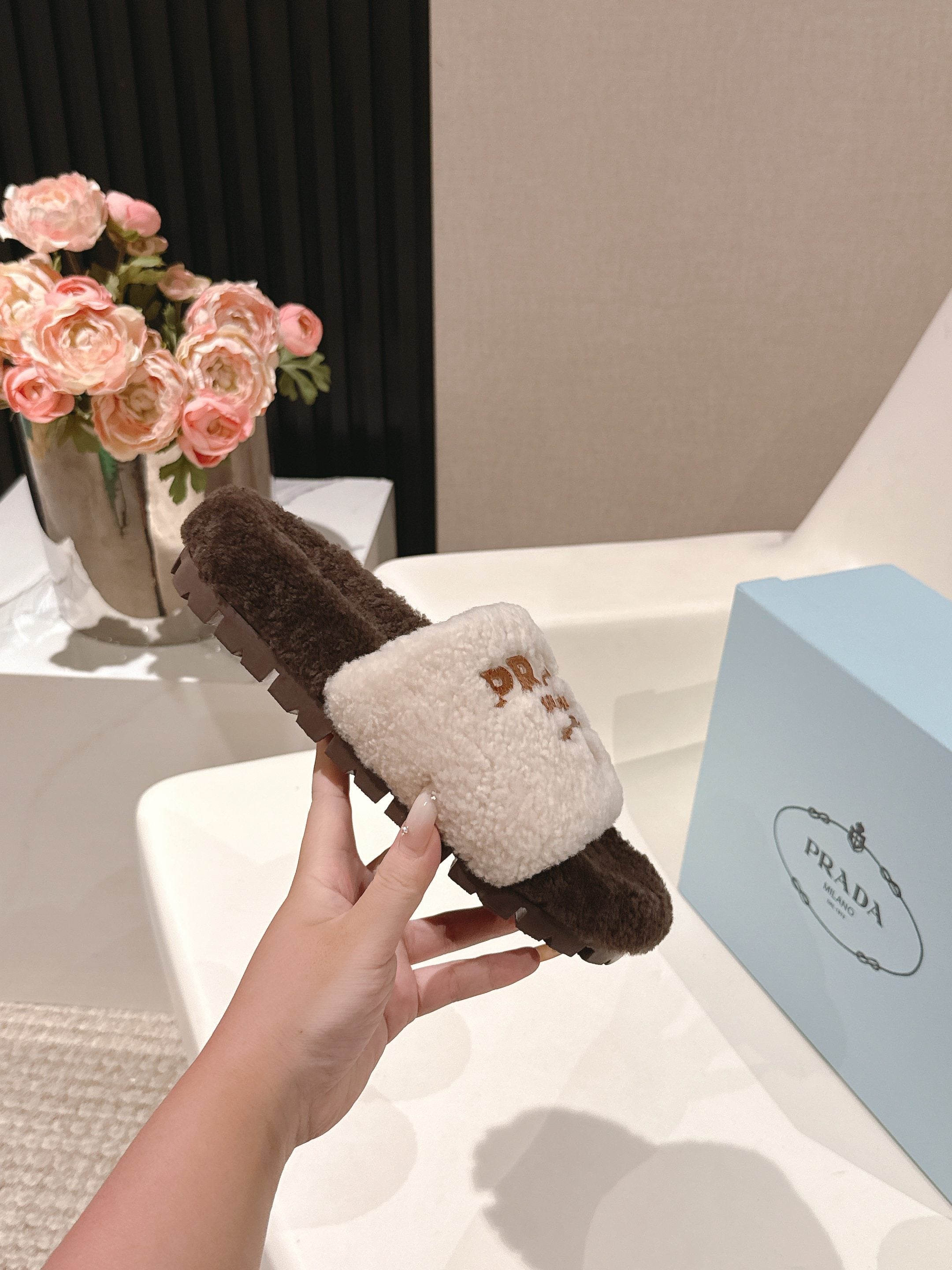PRADA 25S FLAT MULES IN WHITE AND DARK BROWN RABBIT FUR