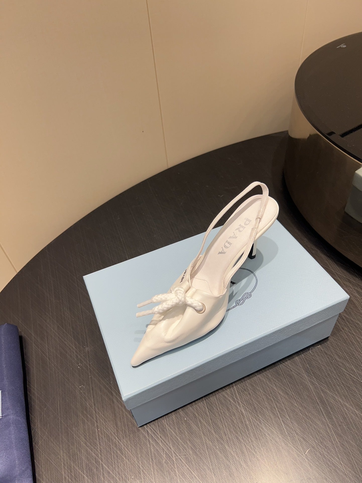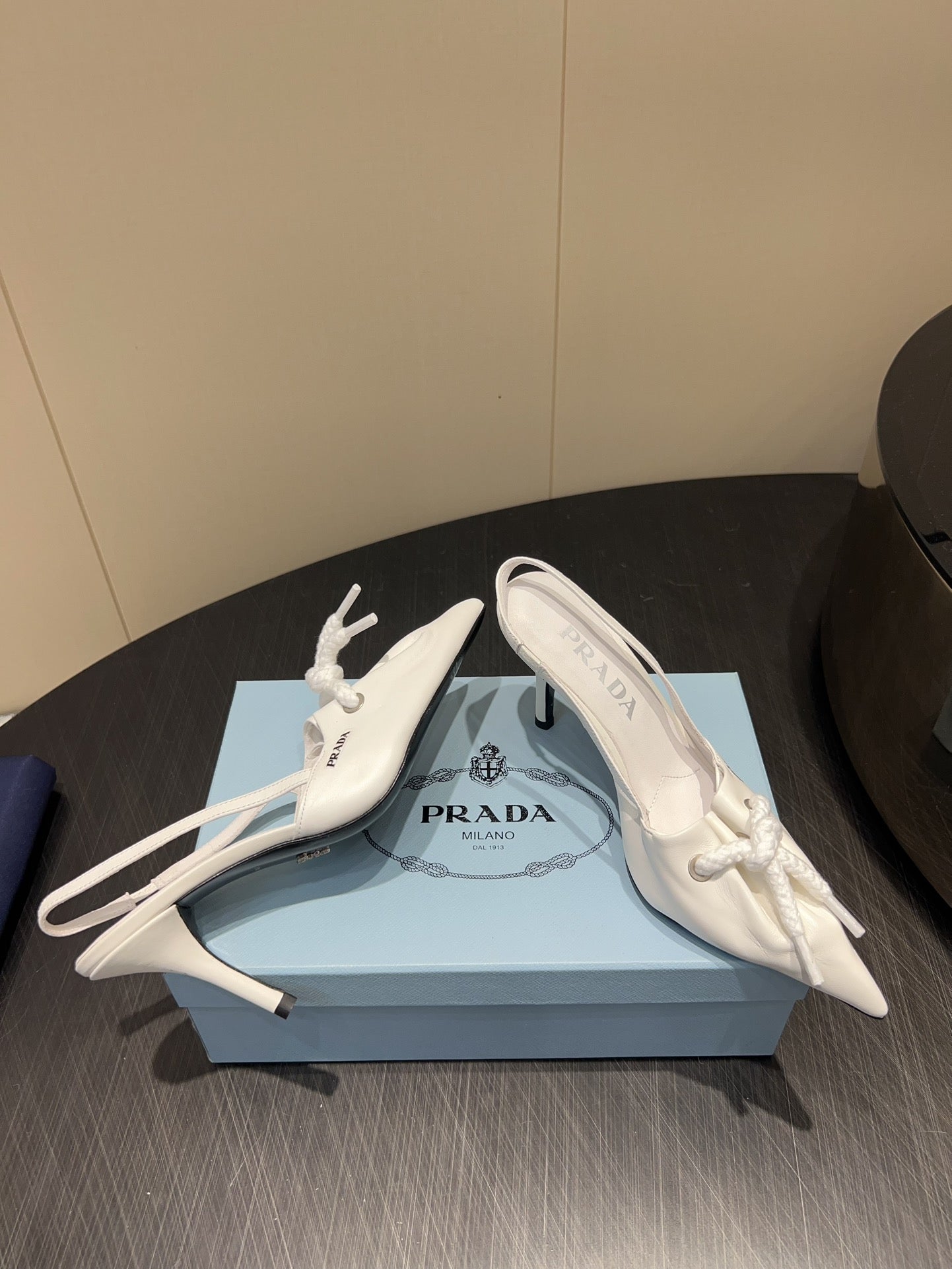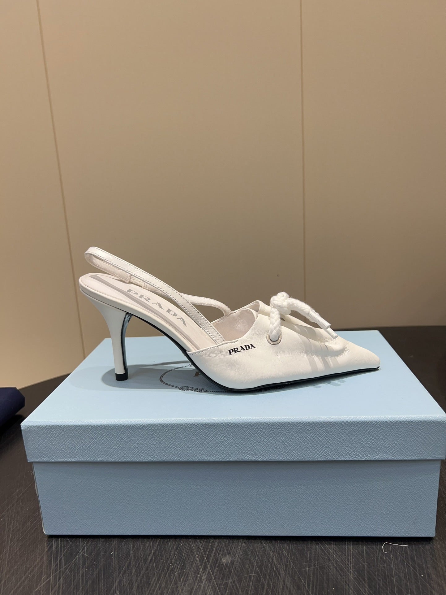 PRADA 25S POINTED TOE SLINGBACK 85MM IN WHITE LAMBSKIN WITH TIE UP DESIGN