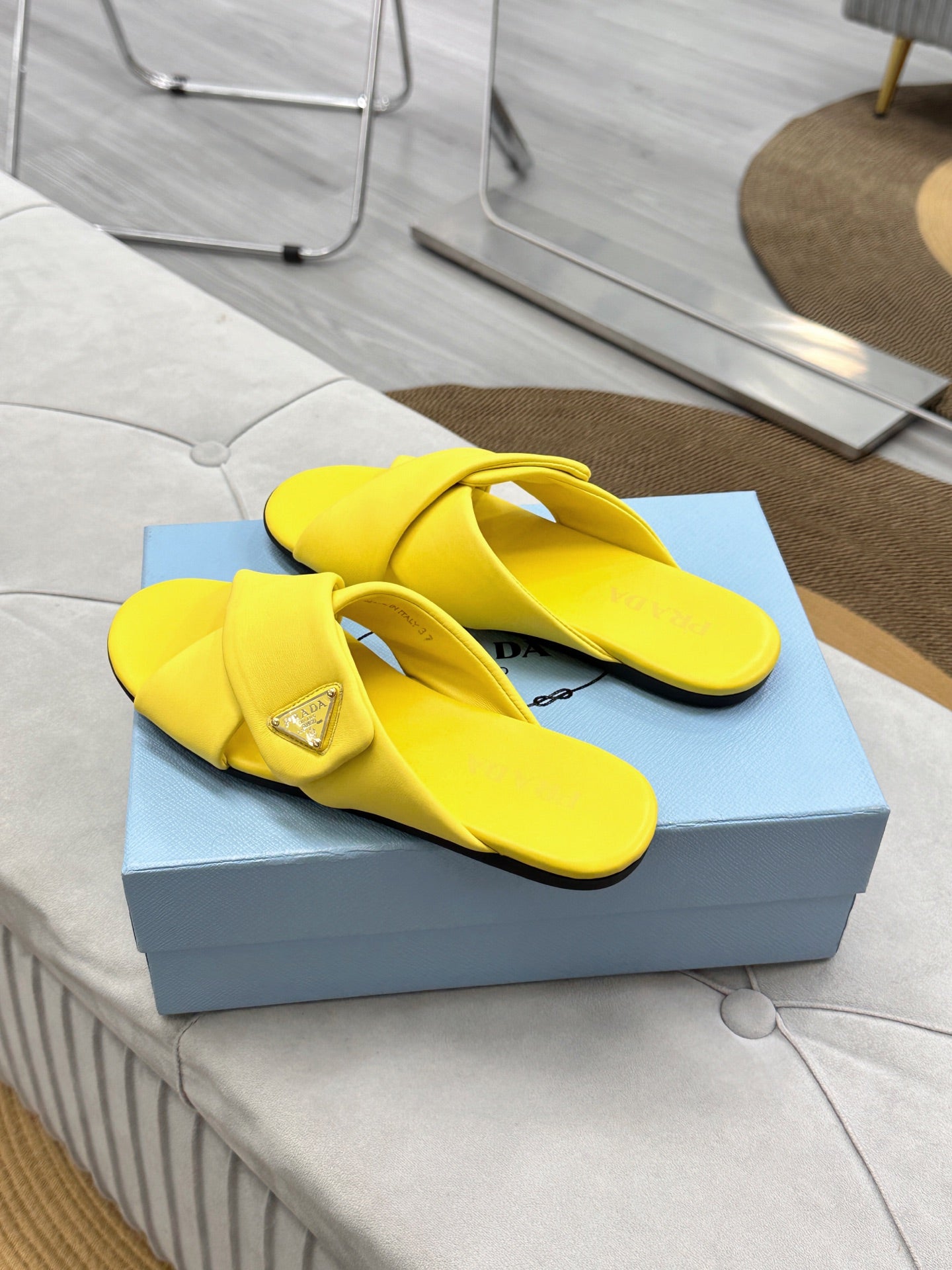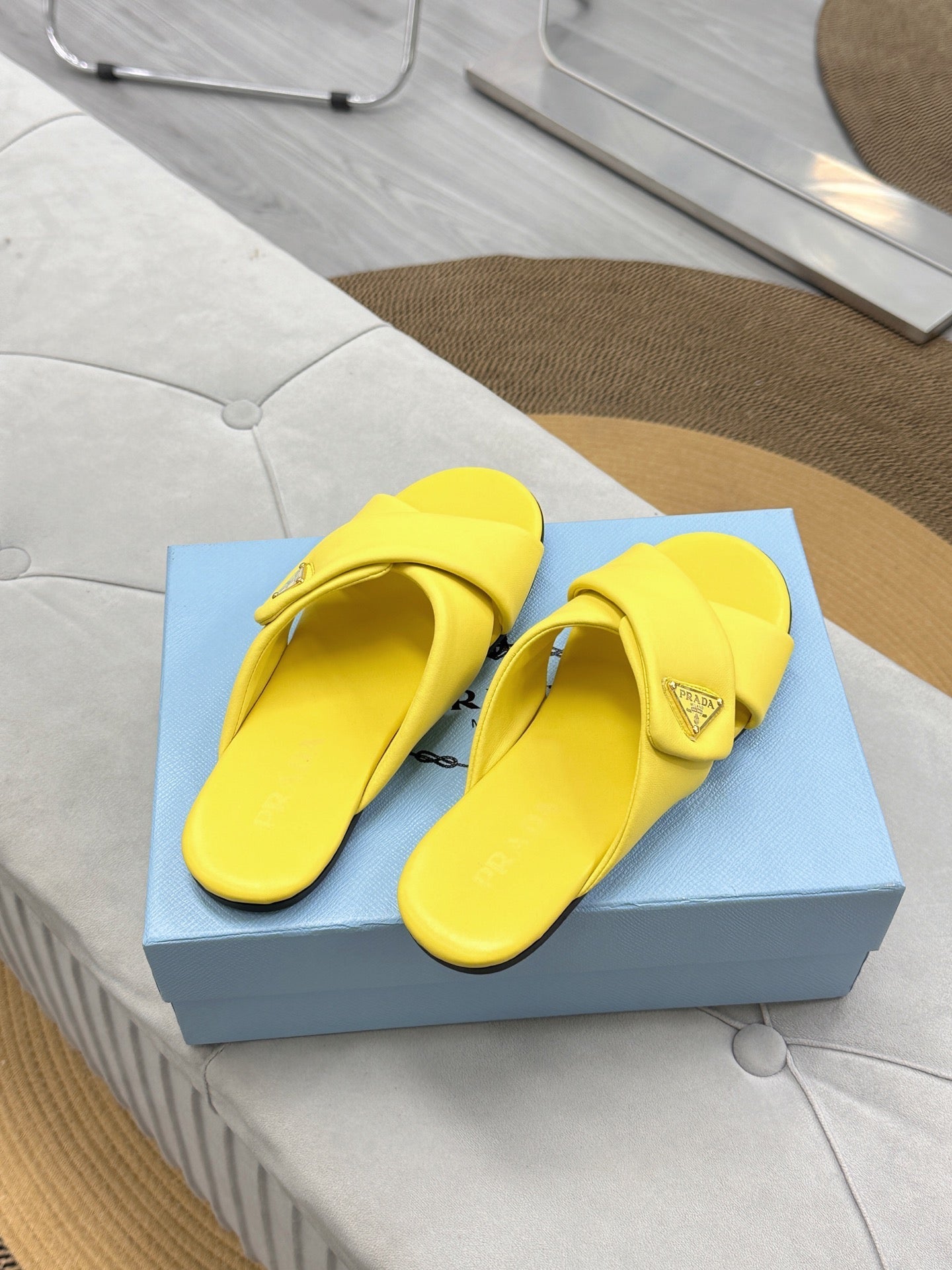 PRADA 25S SLIDE SANDALS IN YELLOW CALFSKIN LOGO