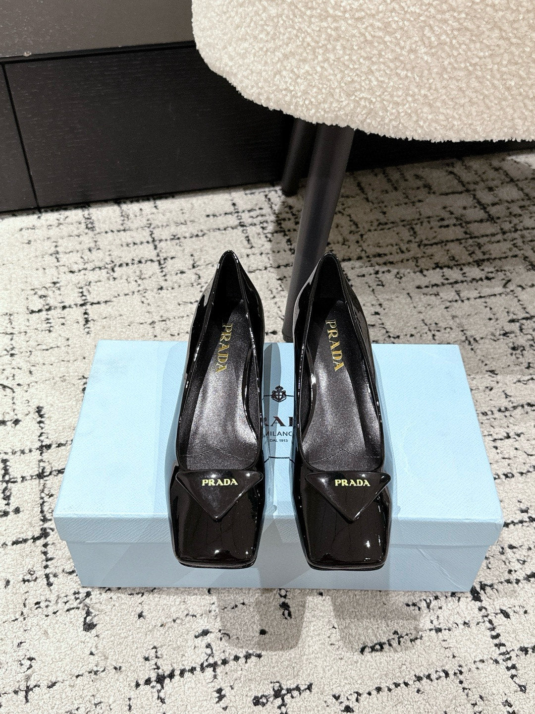 PRADA 25S SQUARE TOE HIGH HEELS IN BLACK GLOSSY CALFSKIN