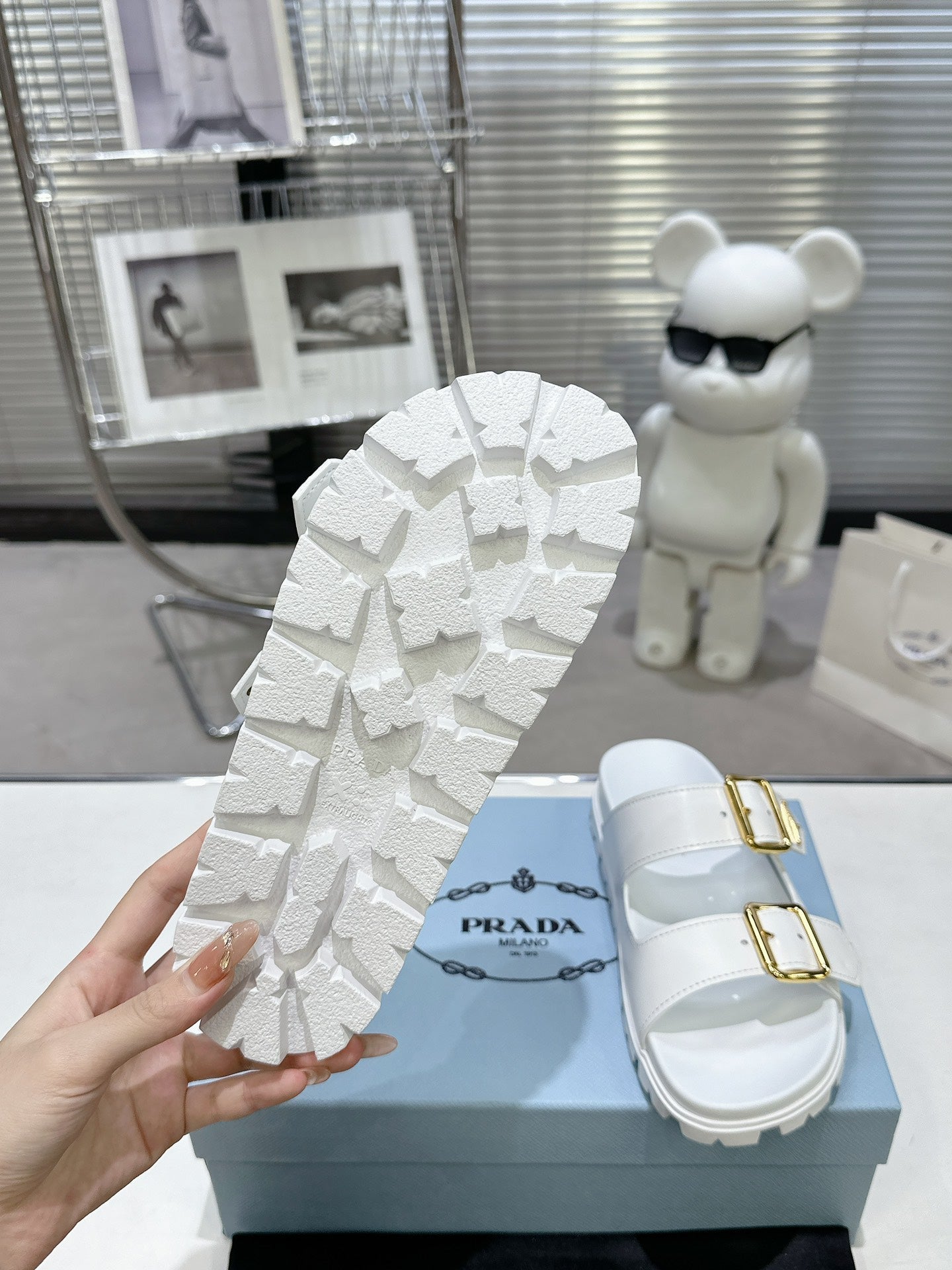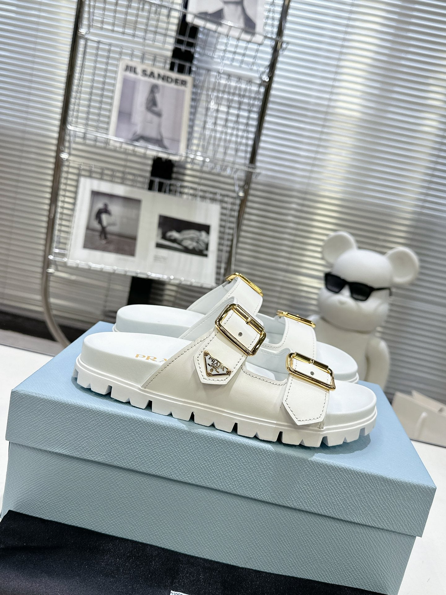 PRADA 25S STRAP SLIDES 30MM IN WHITE CALFSKIN GOLD HARDWARE
