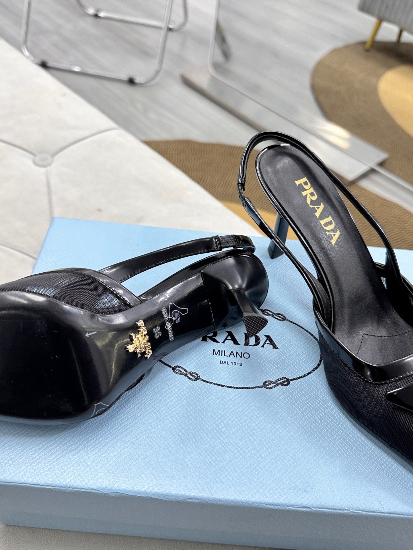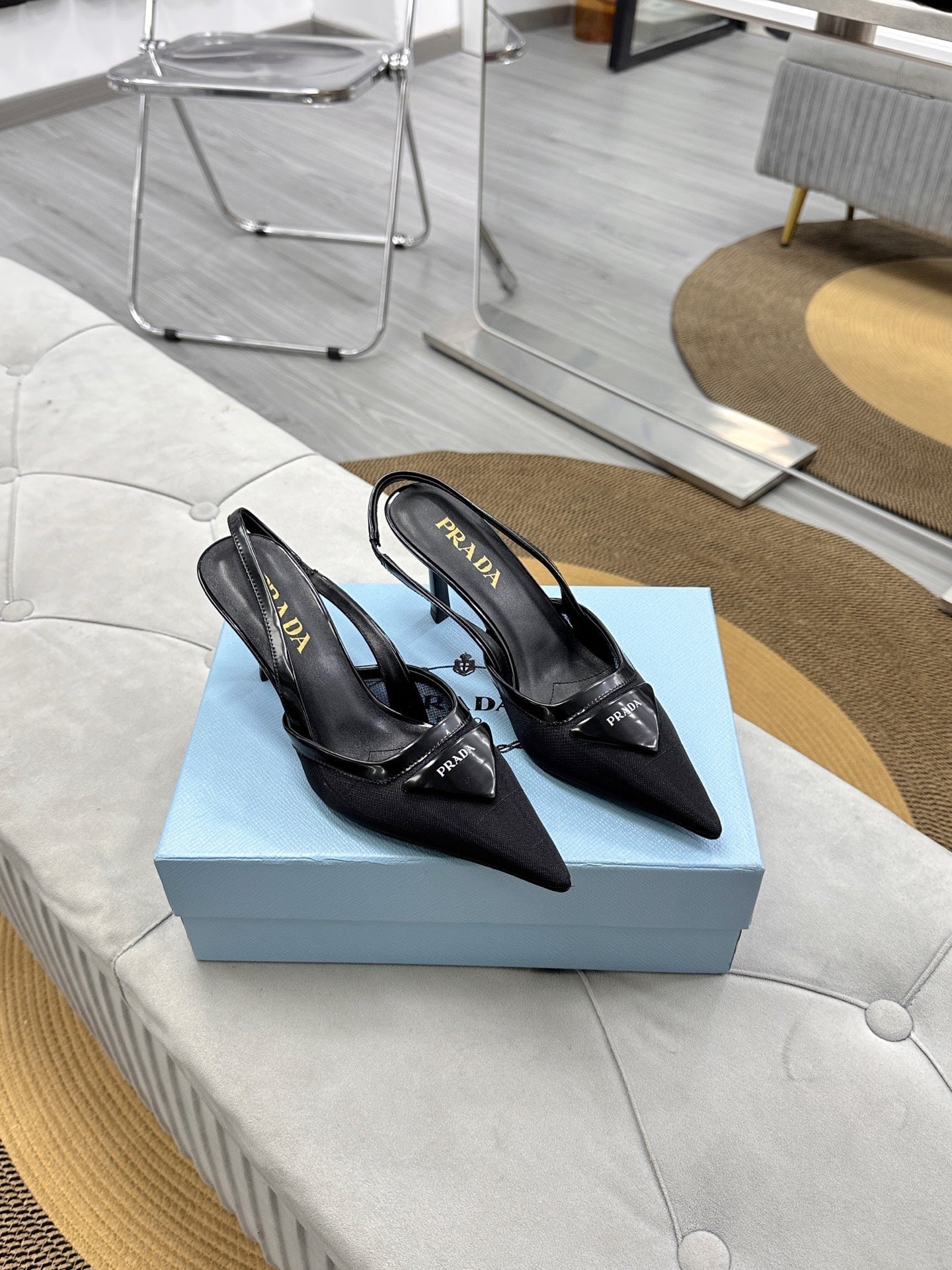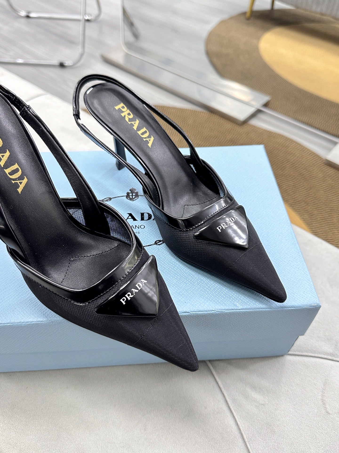 PRADA 25S TRIANGLE LOGO SLINGBACK PUMPS IN BLACK MESH FABRIC