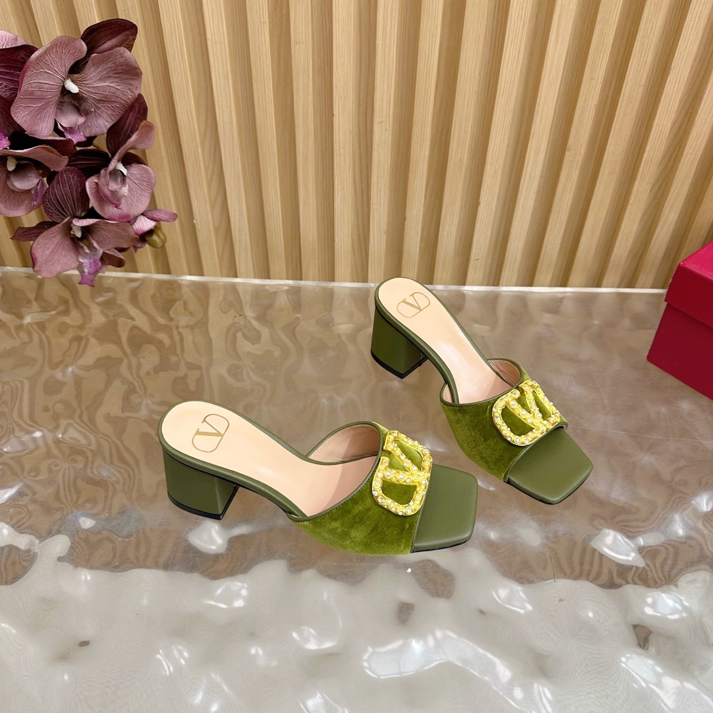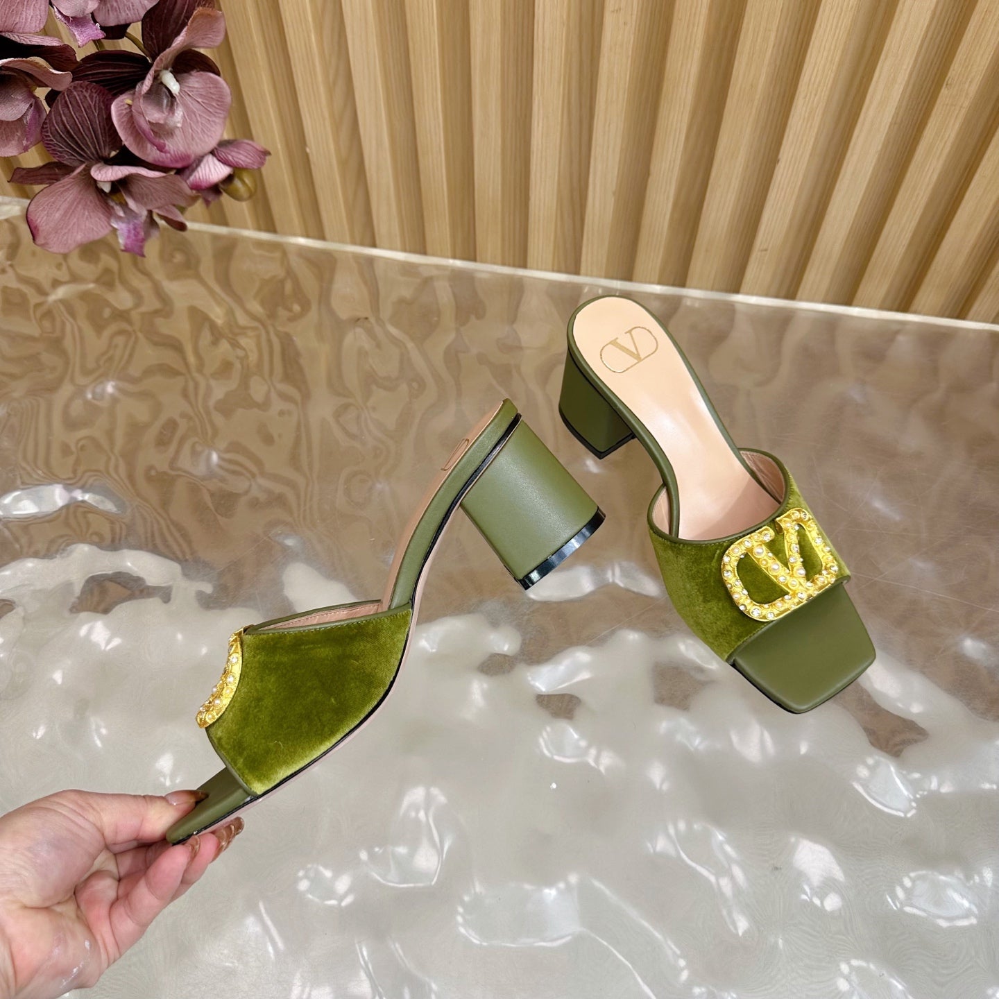 VALENTINO 25S HIGH-HEEL MULES 60 MM IN MOSS GREEN VELVET AND CALFSKIN WITH GOLD HARDWARE