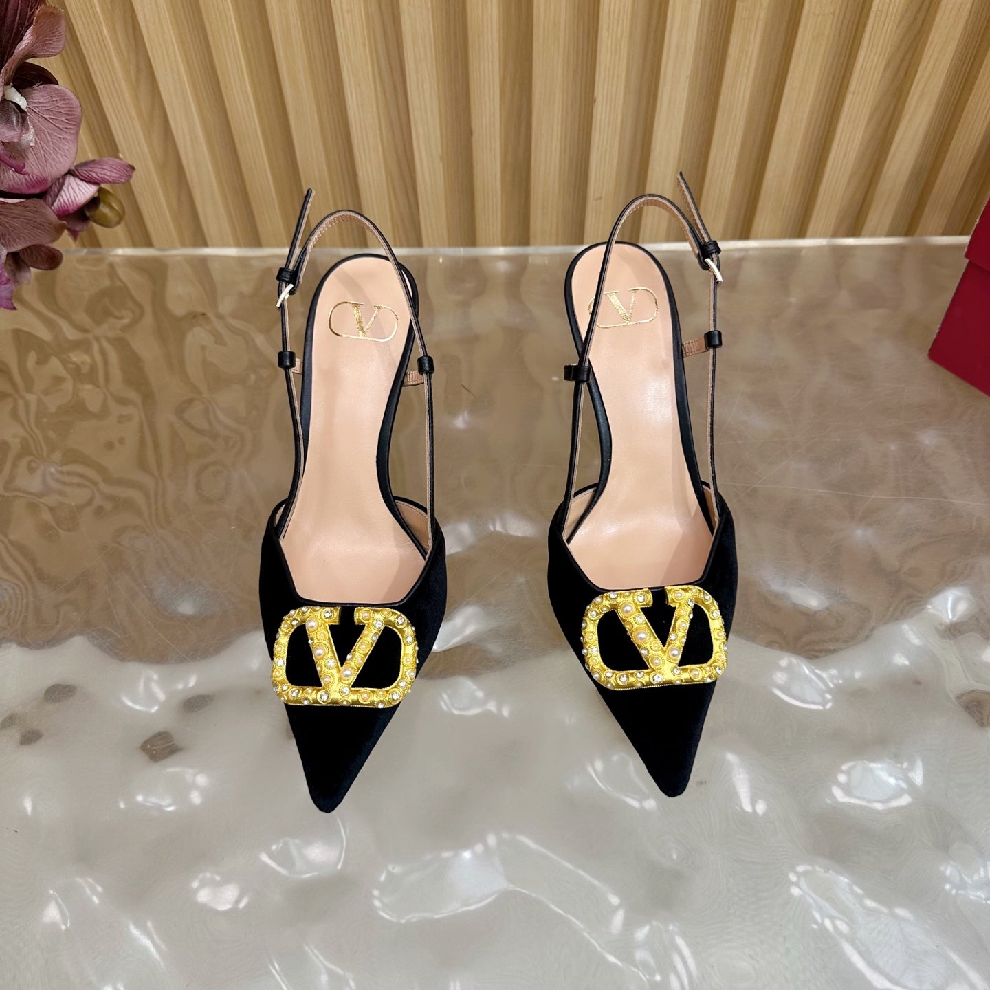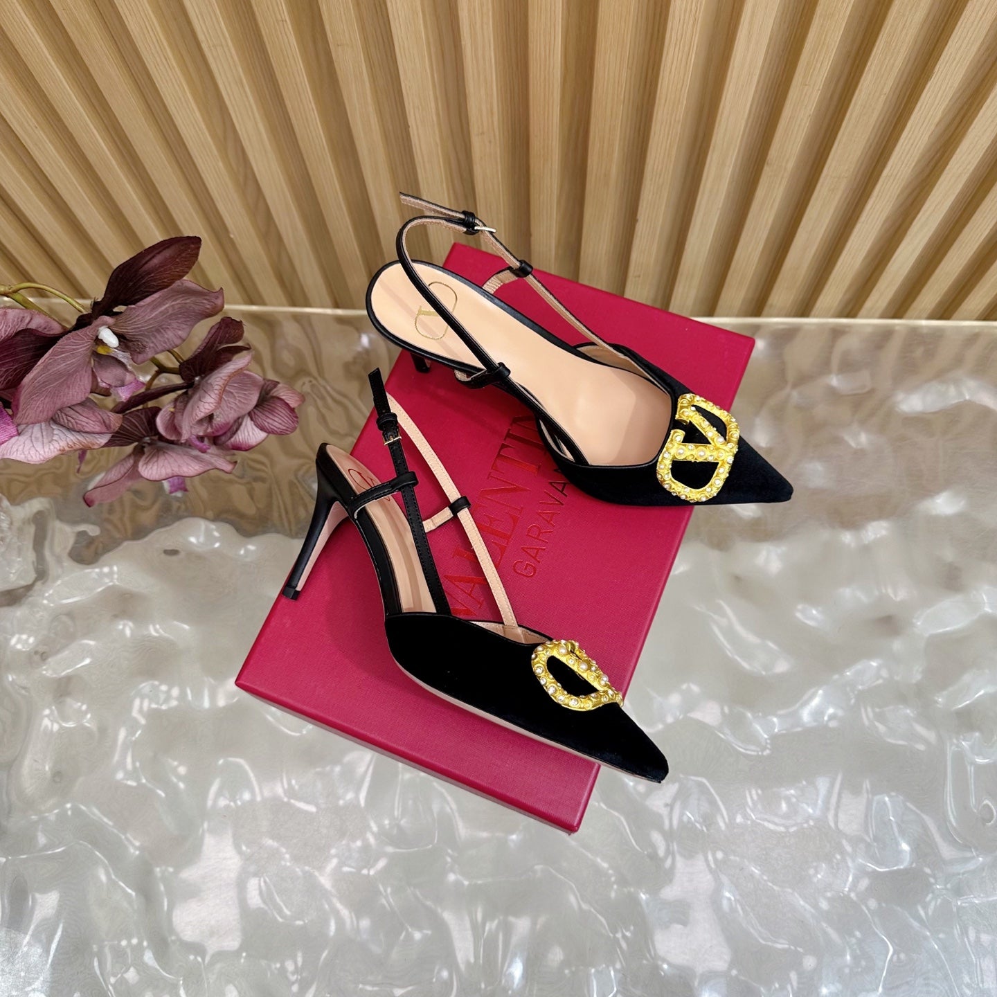 VALENTINO 25S HIGH-HEEL SLINGBACKS IN BLACK VELVET WITH GOLD HARDWARE