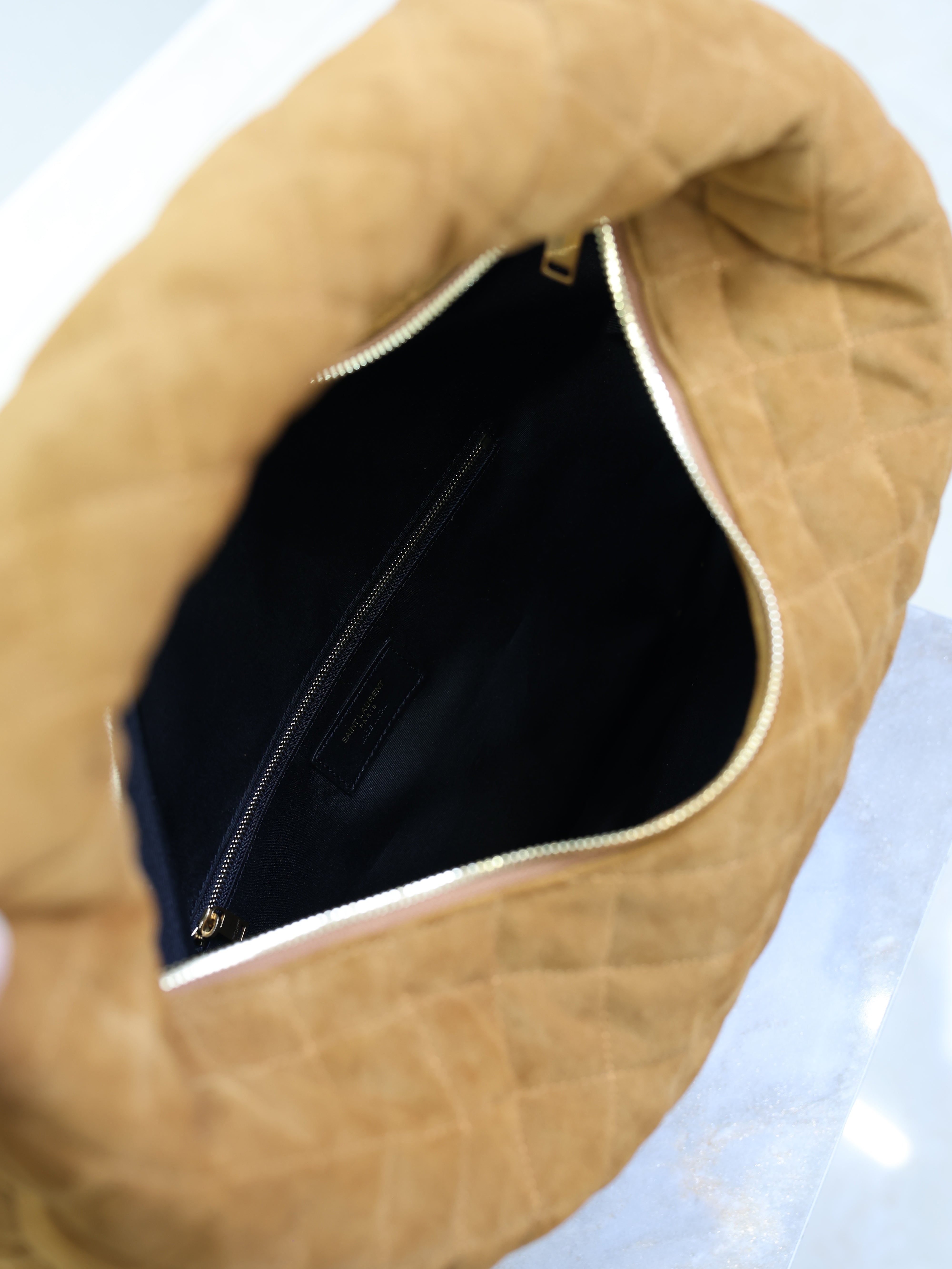 YSL 25S ICARINO 44 IN CARAMEL QUILTED SUEDE GOLD HARDWARE